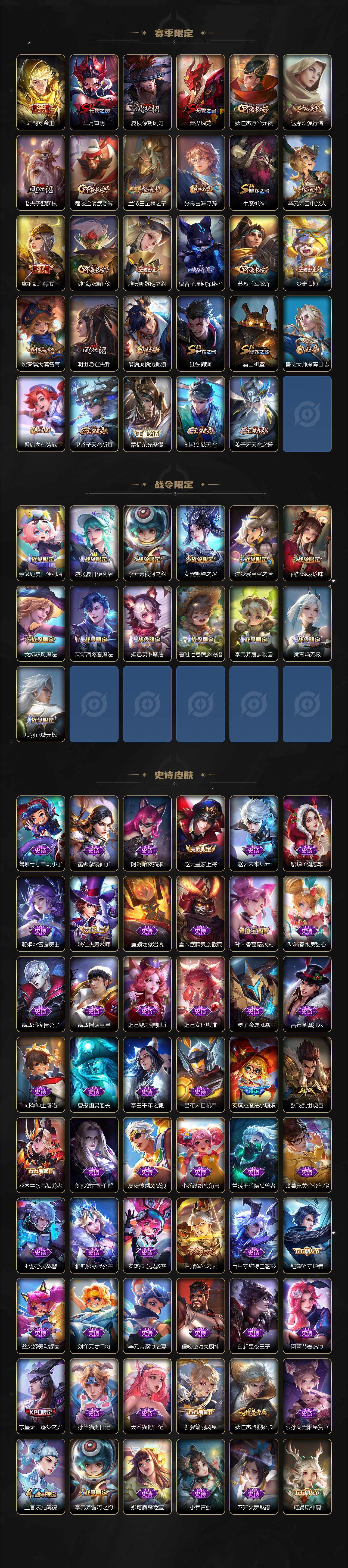 【赛季限定】:扁鹊炼金王,芈月重明,夏侯惇朔风刀,曹操烛龙,狄仁杰万华元夜,达摩沙漠行僧,老夫子醍醐杖,程咬金演武夺筹,兰陵王金庭之子,张良古海寻踪,牛魔御旌,李元芳云中旅人,虞姬凯尔特女王,钟馗驱傩正仪,雅典娜黎明之约,鬼谷子原初探秘者,苏烈千军破阵,弈星混沌棋,梦奇顽趣,沈梦溪大漠名商,明世隐疑决卦,裴擒虎擒涛扼浪,狂铁御狮,盾山御銮,鲁班大师探海日志,桑启海盐诗旅,鬼谷子天穹祈灯,蒙恬荣光圣徽,刘邦剑破天穹,姜子牙天穹之誓