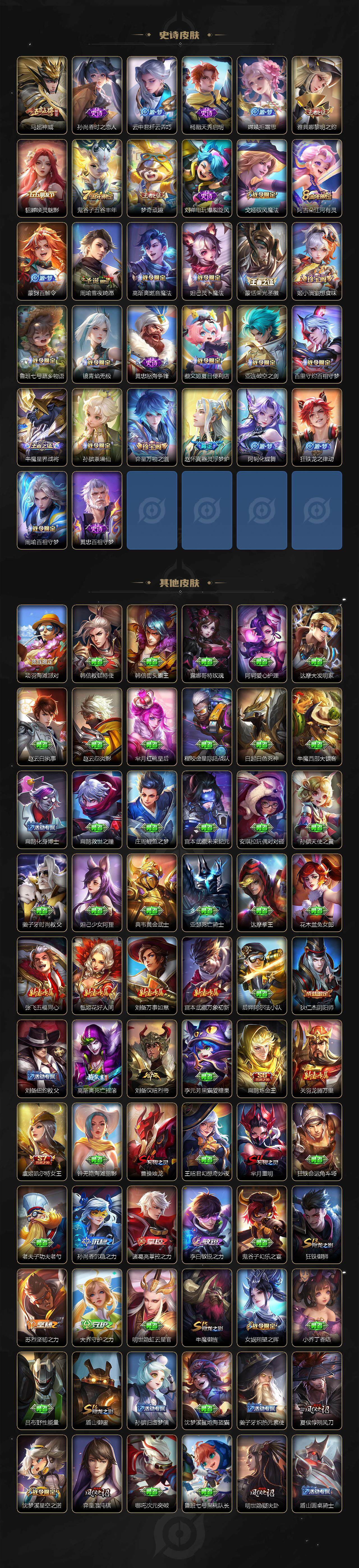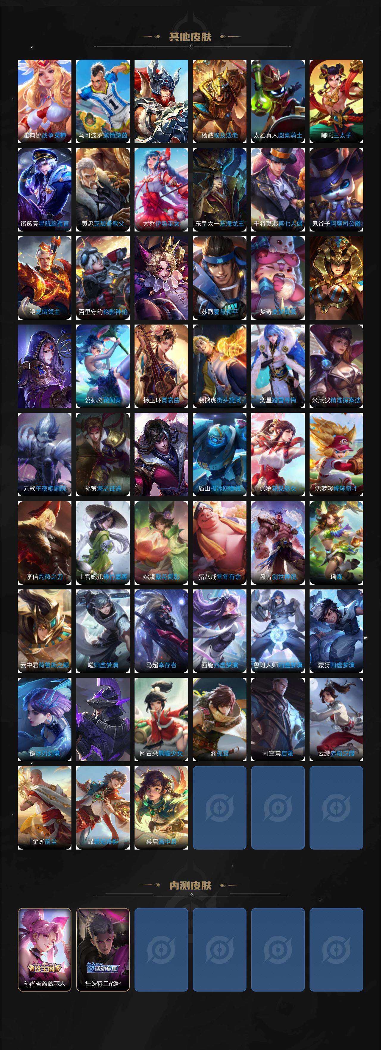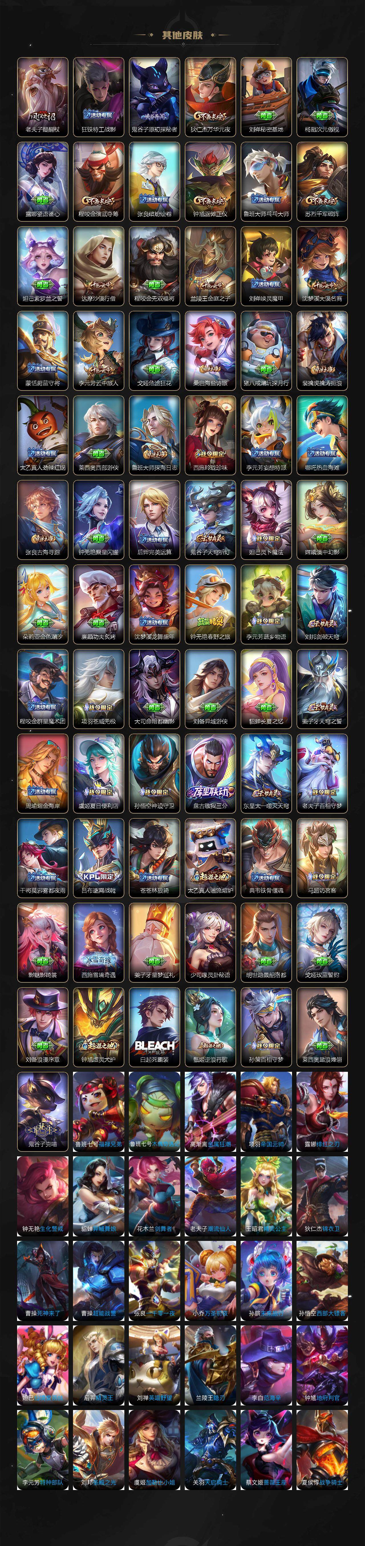 扁鹊炼金王,虞姬凯尔特女王,曹操烛龙,芈月重明,狂铁御狮,牛魔御旌,盾山御銮,夏侯惇朔风刀,明世隐疑决卦,老夫子醍醐杖,鬼谷子原初探秘者,狄仁杰万华元夜,程咬金演武夺筹,钟馗驱傩正仪,苏烈千军破阵,女娲朔望之晖,沈梦溪星空之诺,李元芳银河之约,弈星混沌棋,达摩沙漠行僧,兰陵王金庭之子,沈梦溪大漠名商,李元芳云中旅人,桑启海盐诗旅,裴擒虎擒涛扼浪,鲁班大师探海日志,张良古海寻踪,项羽苍威无极,镜青焰无极
