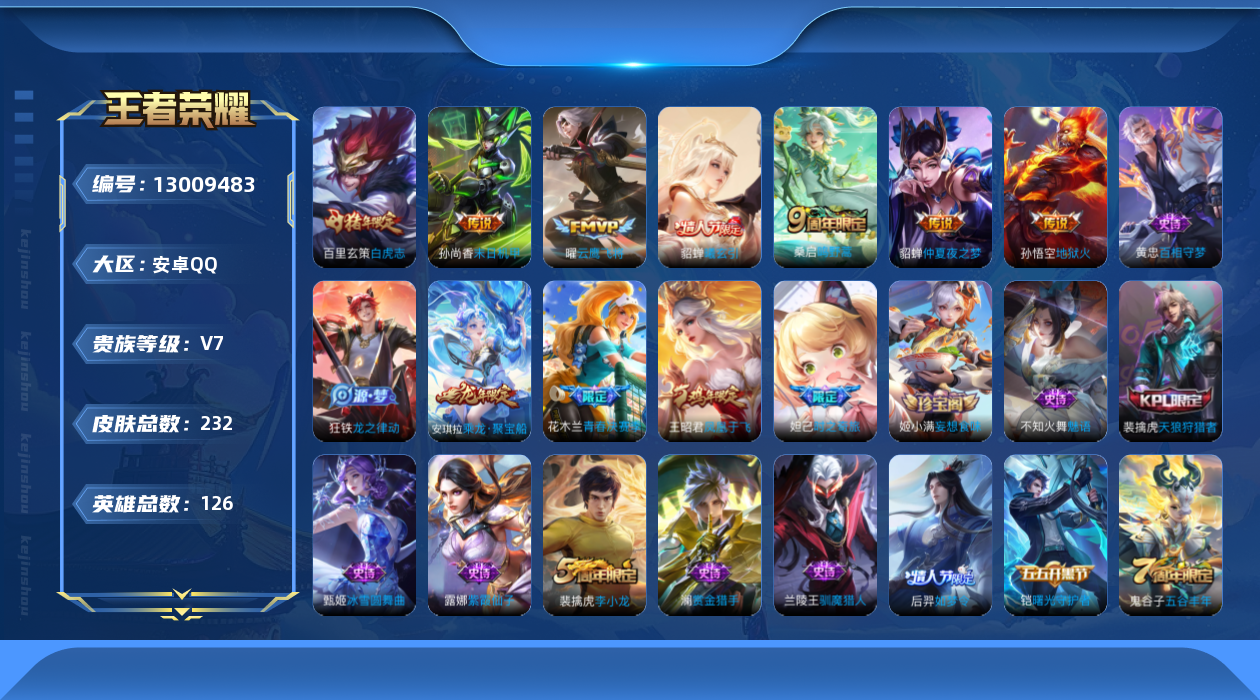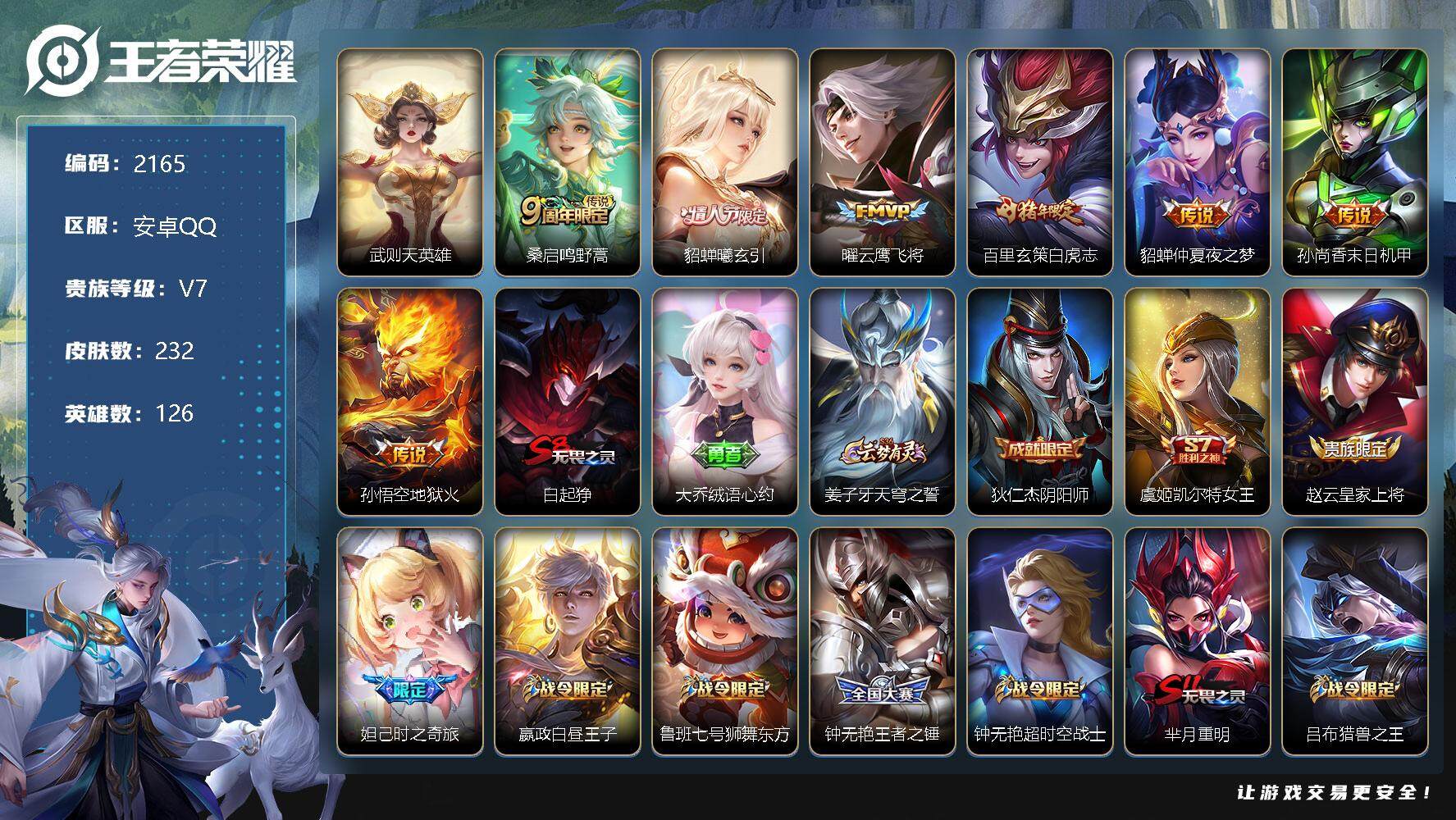 [13009483]安卓Q-V6-尊贵铂金I段位-126英雄-232皮肤-0典藏-0珍品无双-0无双-0珍品传说-7传说-59史诗
