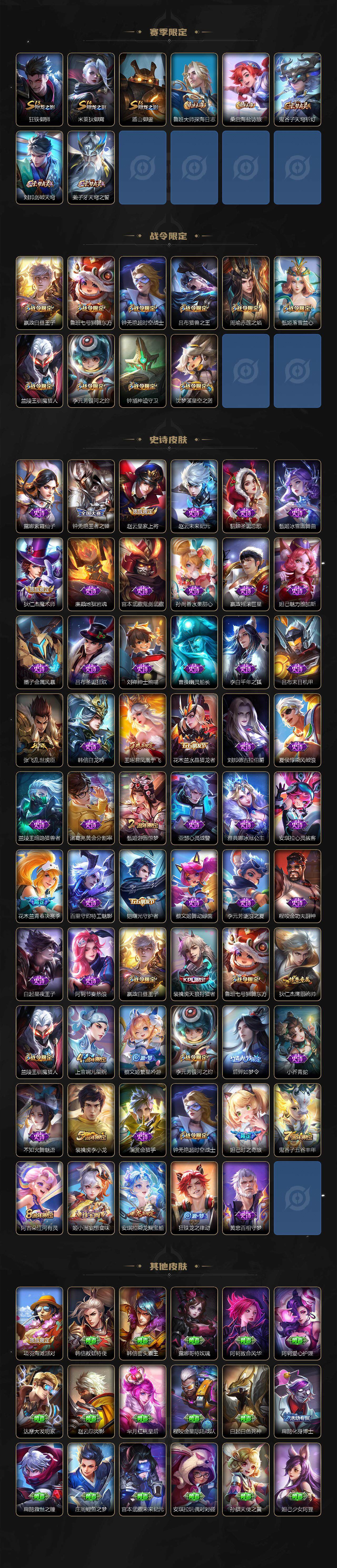 【限定皮肤】:白起狰,大乔绒语心约,姜子牙天穹之誓,狄仁杰阴阳师,虞姬凯尔特女王,赵云皇家上将,妲己时之奇旅,嬴政白昼王子,鲁班七号狮舞东方,钟无艳王者之锤,钟无艳超时空战士,芈月重明,吕布猎兽之王,周瑜赤莲之焰,夏侯惇朔风刀,甄姬游园惊梦,甄姬落雪兰心,曹操烛龙,典韦穷奇,狄仁杰魔术师,狄仁杰万华元夜,项羽海滩派对,老夫子醍醐杖,程咬金演武夺筹,王昭君凤凰于飞,兰陵王驯魔猎人,花木兰青春决赛季,牛魔御旌,后羿如梦令,李元芳银河之约,李元芳云中旅人,钟馗神迹守卫,钟馗驱傩正仪,蔡文姬繁星吟游,太乙真人饕餮,鬼谷子原初探秘者,鬼谷子五谷丰年,百里玄策白虎志,弈星混沌棋,沈梦溪星空之诺,沈梦溪大漠名商,明世隐疑决卦,裴擒虎天狼狩猎者,裴擒虎李小龙,裴擒虎擒涛扼浪,狂铁御狮,米莱狄御霄,盾山御銮,上官婉儿梁祝,鲁班大师探海日志,桑启海盐诗旅,阿古朵江河有灵,张良古海寻踪,鬼谷子天穹祈灯,姬小满妄想食味,安琪拉乘龙聚宝船,貂蝉曦玄引,刘邦剑破天穹,周瑜熔金海岸