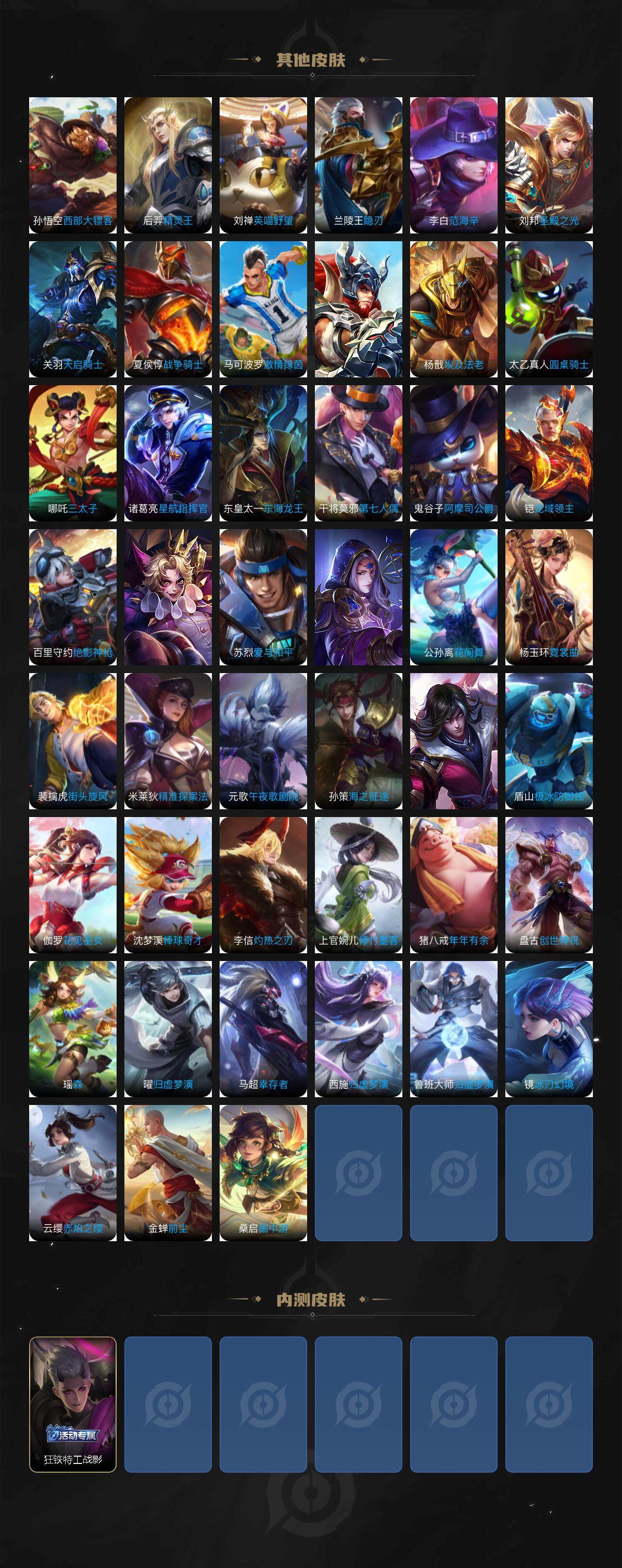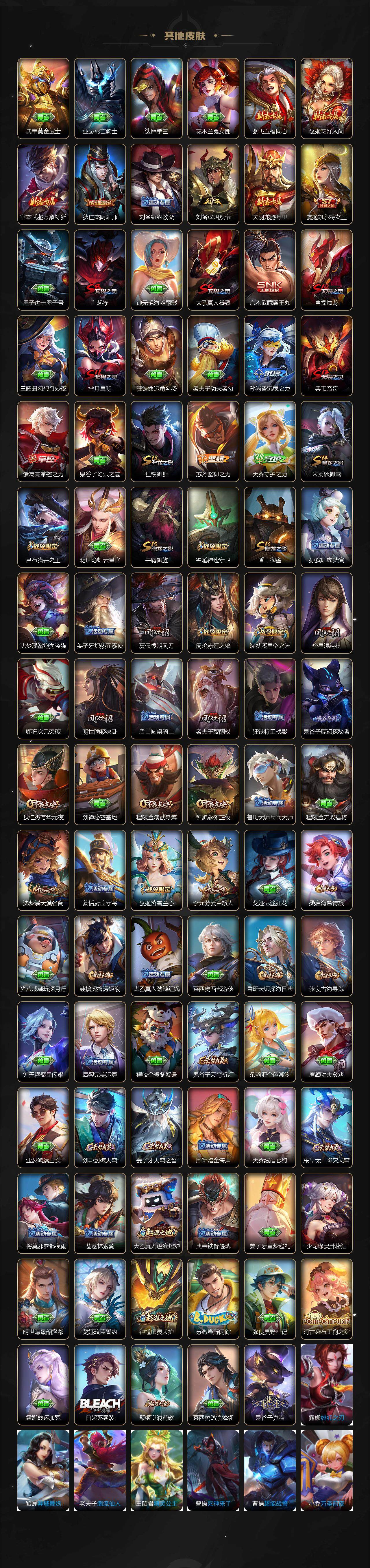 虞姬凯尔特女王,白起狰,太乙真人饕餮,曹操烛龙,芈月重明,典韦穷奇,狂铁御狮,米莱狄御霄,牛魔御旌,盾山御銮,夏侯惇朔风刀,明世隐疑决卦,老夫子醍醐杖,鬼谷子原初探秘者,狄仁杰万华元夜,程咬金演武夺筹,钟馗驱傩正仪,吕布猎兽之王,嬴政白昼王子,钟馗神迹守卫,鲁班七号狮舞东方,沈梦溪星空之诺,李元芳银河之约,弈星混沌棋,沈梦溪大漠名商,李元芳云中旅人,桑启海盐诗旅,裴擒虎擒涛扼浪,鲁班大师探海日志,张良古海寻踪