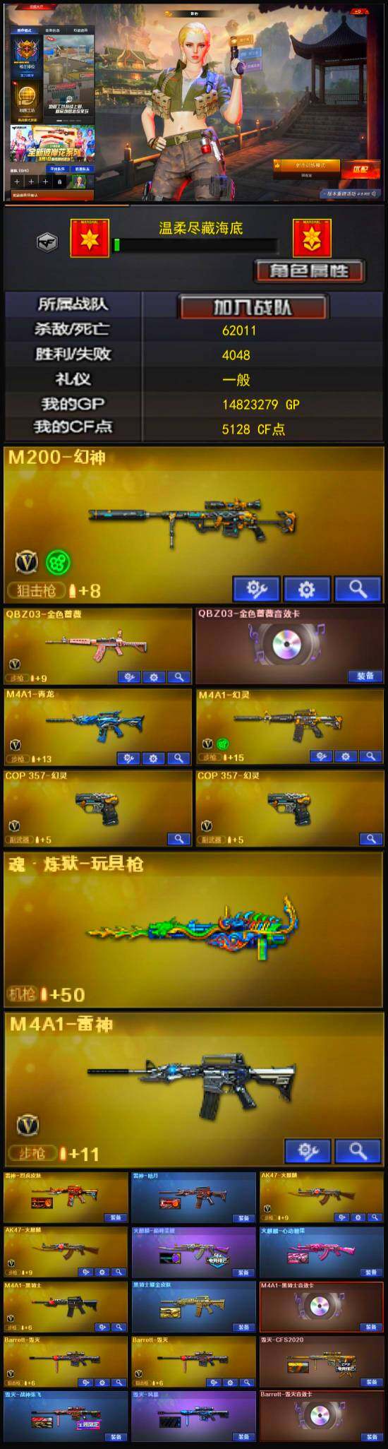 【热门武器】:QBZ03-金色蔷薇,M4A1-青龙,M200-幻神,M4A1-黑骑士,雷神-小红,COP 357-幻灵*2,沙鹰-修罗*4