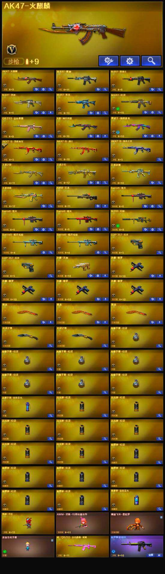 【英雄级武器】:AK47-火麒麟*2,M4A1-雷神,M4A1-黑骑士,M4A1-死神,M4A1-青龙,M4A1-幻灵,无影-神兵利器,黑武士-锦绣游龙,QBZ03-金色蔷薇,AK-47-猩红传说,AK47-B-常胜将军,AWM-天龙,Barrett-毁灭*2,Barrett-极光,M200-幻神,沙鹰-修罗*4,沙鹰-天神,COP 357-幻灵*2,屠龙*3,幻灵之锋*2,高爆手雷-竞技荣光,烟雾弹-竞技荣光
