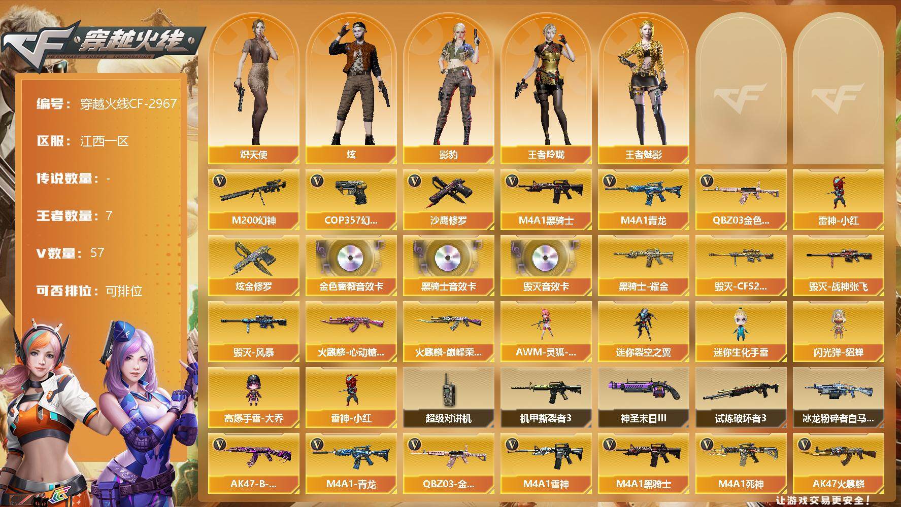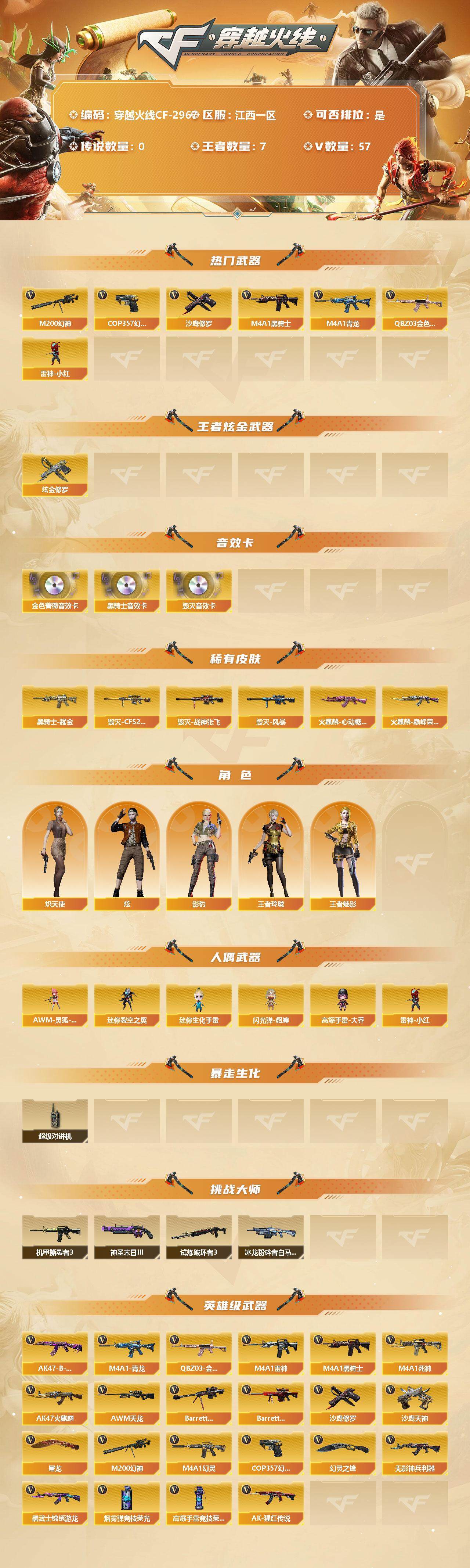 [13009492]江西一区-57V-7王者-1炫金 【热门武器】:QBZ03-金色蔷薇,M4A1-青龙,M200-幻神,M4A1-黑骑士,雷神-小红,COP 357-幻灵*2,沙鹰-修罗*4 【王者炫金武器】:炫金修罗 【音效卡】:M4A1-黑骑士音效卡,Barrett-毁灭音效卡,QBZ03-金色蔷薇音效卡 【皮肤】:雷神-暗月,雷神-烈虎皮肤,火麒麟-巅峰荣耀,火麒麟-心动糖果,毁灭-CFS2020,毁灭-战神张飞,毁灭-风暴,黑骑士耀金皮肤 【角色】:炫,影豹,王者玲珑,王者-魅影,炽天使 【人偶武器】:雷神-小红,AWM-灵狐-15周年嘉年华,迷你裂空之翼,迷你生化手雷,闪光弹-貂蝉,高爆手雷-大乔 【暴走生化】:超级对讲机 【挑战大师】:冰龙粉碎者-白马银枪*2,机甲撕裂者III,试炼破坏者III,神圣爆裂者-末日III 【英雄级武器】:AK47-火麒麟*2,M4A1-雷神,M4A1-黑骑士,M4A1-死神,M4A1-青龙,M4A1-幻灵,无影-神兵利器,黑武士-锦绣游龙,QBZ03-金色蔷薇,AK-47-猩红传说,AK47-B-常胜将军,AWM-天龙,Barrett-毁灭*2,Barrett-极光,M200-幻神,沙鹰-修罗*4,沙鹰-天神,COP 357-幻灵*2,屠龙*3,幻灵之锋*2,高爆手雷-竞技荣光,烟雾弹-竞技荣光 【特殊枪械】:1黑骑士