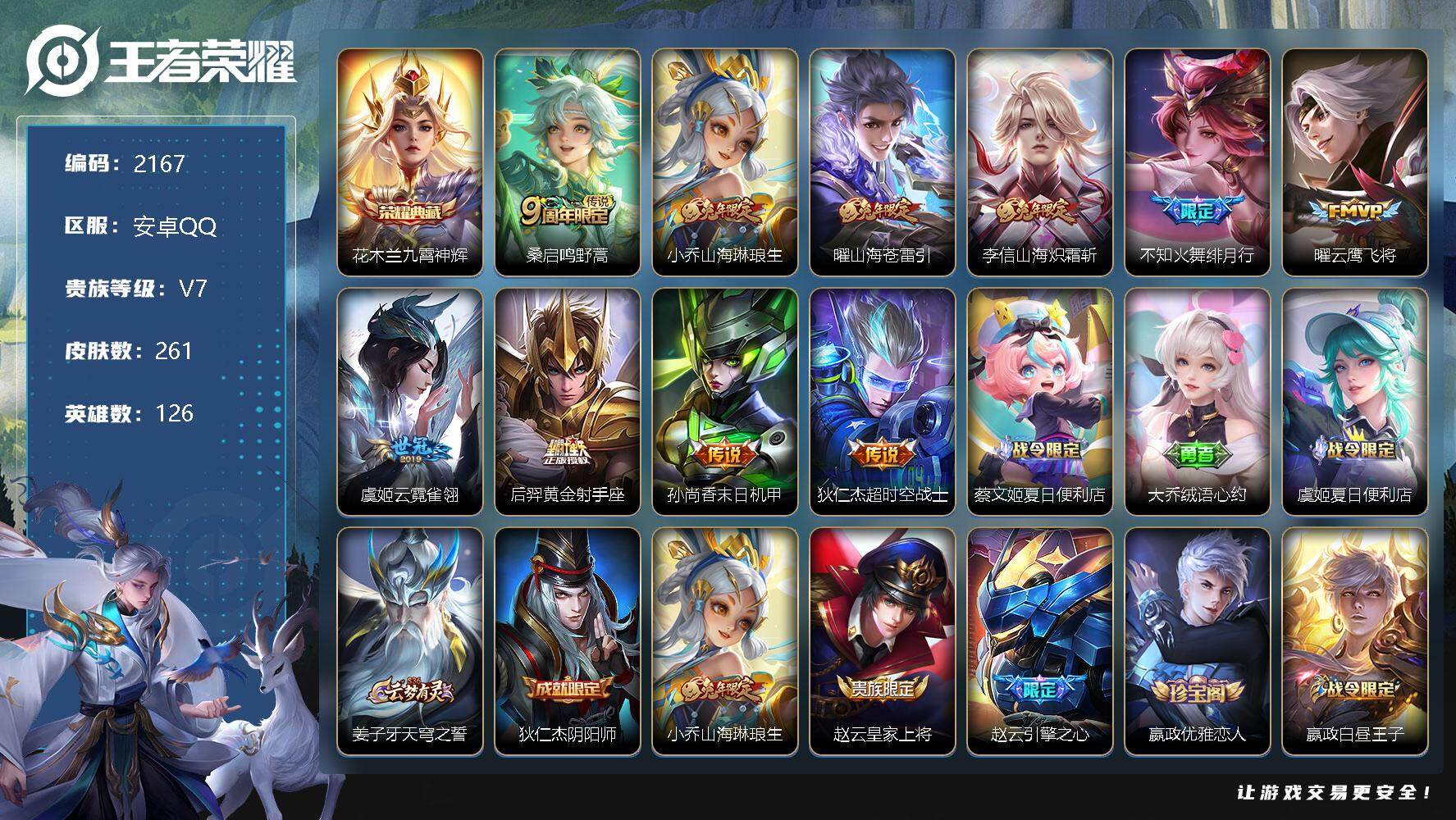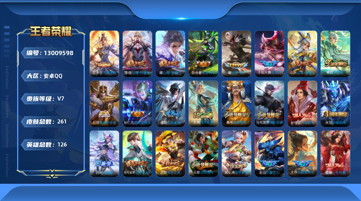 [13009598]安卓Q-V1-最强王者段位-126英雄-261皮肤-1典藏-0珍品无双-0无双-0珍品传说-11传说-79史诗