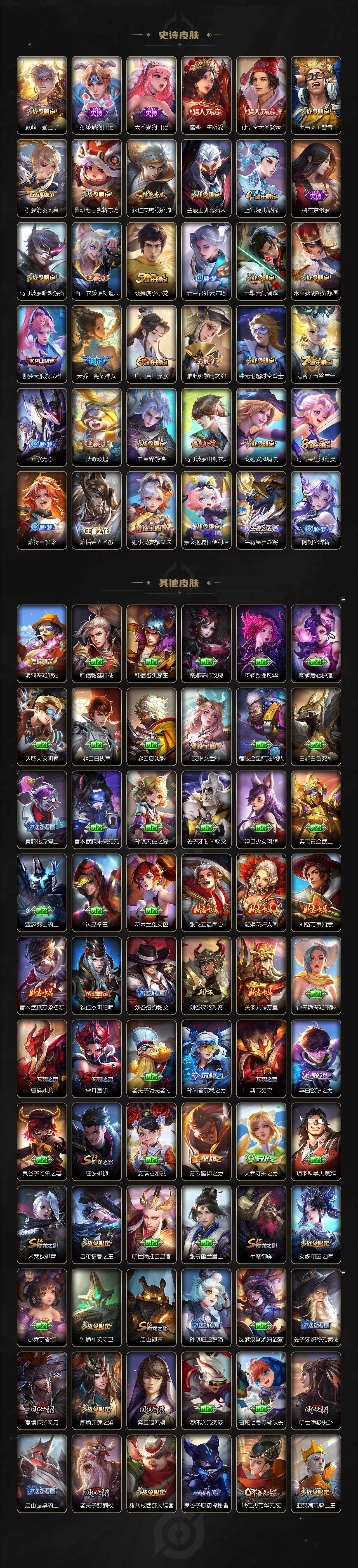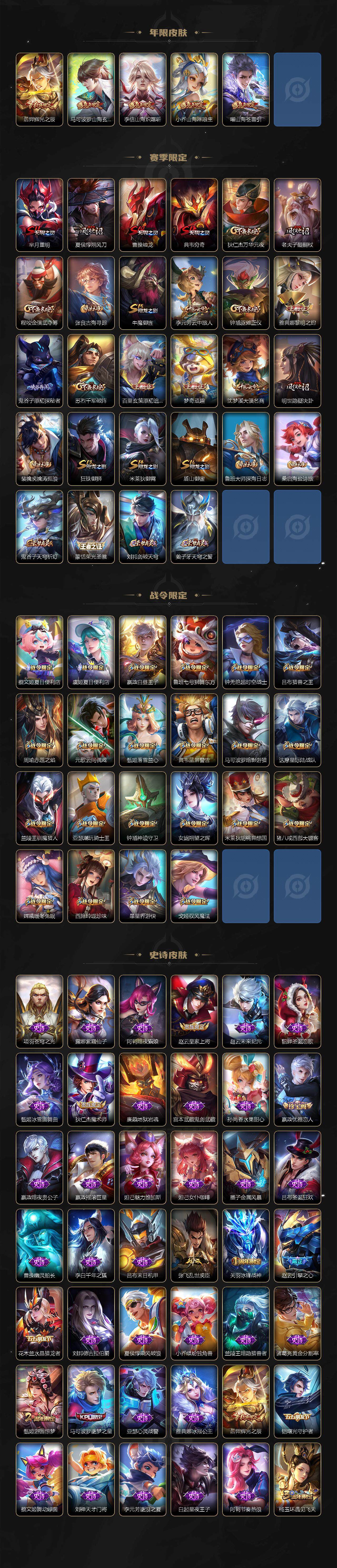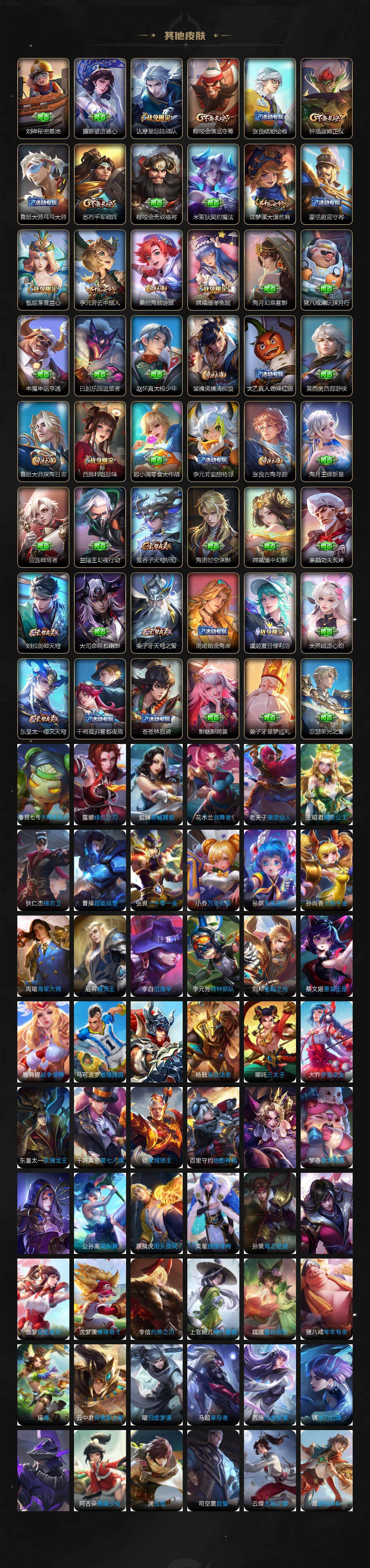 【限定皮肤】:蔡文姬夏日便利店,大乔绒语心约,虞姬夏日便利店,姜子牙天穹之誓,狄仁杰阴阳师,小乔山海琳琅生,赵云皇家上将,赵云引擎之心,嬴政优雅恋人,嬴政白昼王子,鲁班七号狮舞东方,庄周高山流水,钟无艳超时空战士,芈月重明,吕布猎兽之王,周瑜赤莲之焰,元歌云间偶戏,元歌无心,夏侯惇朔风刀,甄姬游园惊梦,甄姬落雪兰心,曹操烛龙,典韦穷奇,典韦蓝屏警告,马可波罗逐梦之星,马可波罗暗影游猎,马可波罗山海玄木吟,狄仁杰魔术师,狄仁杰万华元夜,达摩星际陆战队,项羽海滩派对,老夫子醍醐杖,关羽冰锋战神,程咬金演武夺筹,露娜一生所爱,兰陵王驯魔猎人,不知火舞绯月行,亚瑟潮玩骑士王,孙悟空大圣娶亲,牛魔御旌,后羿辉光之辰,李元芳云中旅人,钟馗神迹守卫,钟馗驱傩正仪,杨玉环遇见飞天,女娲朔望之晖,雅典娜黎明之约,鬼谷子原初探秘者,鬼谷子五谷丰年,大乔白鹤梁神女,苏烈千军破阵,百里玄策原初追逐者,弈星混沌棋,梦奇顽趣,沈梦溪大漠名商,明世隐疑决卦,裴擒虎李小龙,裴擒虎擒涛扼浪,狂铁御狮,米莱狄御霄,米莱狄胡桃异想国,云中君纤云弄巧,李信山海炽霜斩,伽罗天狼溯光者,盾山御銮,猪八戒西部大镖客,上官婉儿梁祝,嫦娥暖冬兔眠,曜山海苍雷引,西施玲珑珍味,鲁班大师探海日志,桑启海盐诗旅,暃星界游侠,戈娅驭风魔法,艾琳女武神,阿古朵江河有灵,张良古海寻踪,蒙犽百解令,蒙恬荣光圣徽,鬼谷子天穹祈灯,姬小满妄想食味,刘邦剑破天穹,周瑜熔金海岸