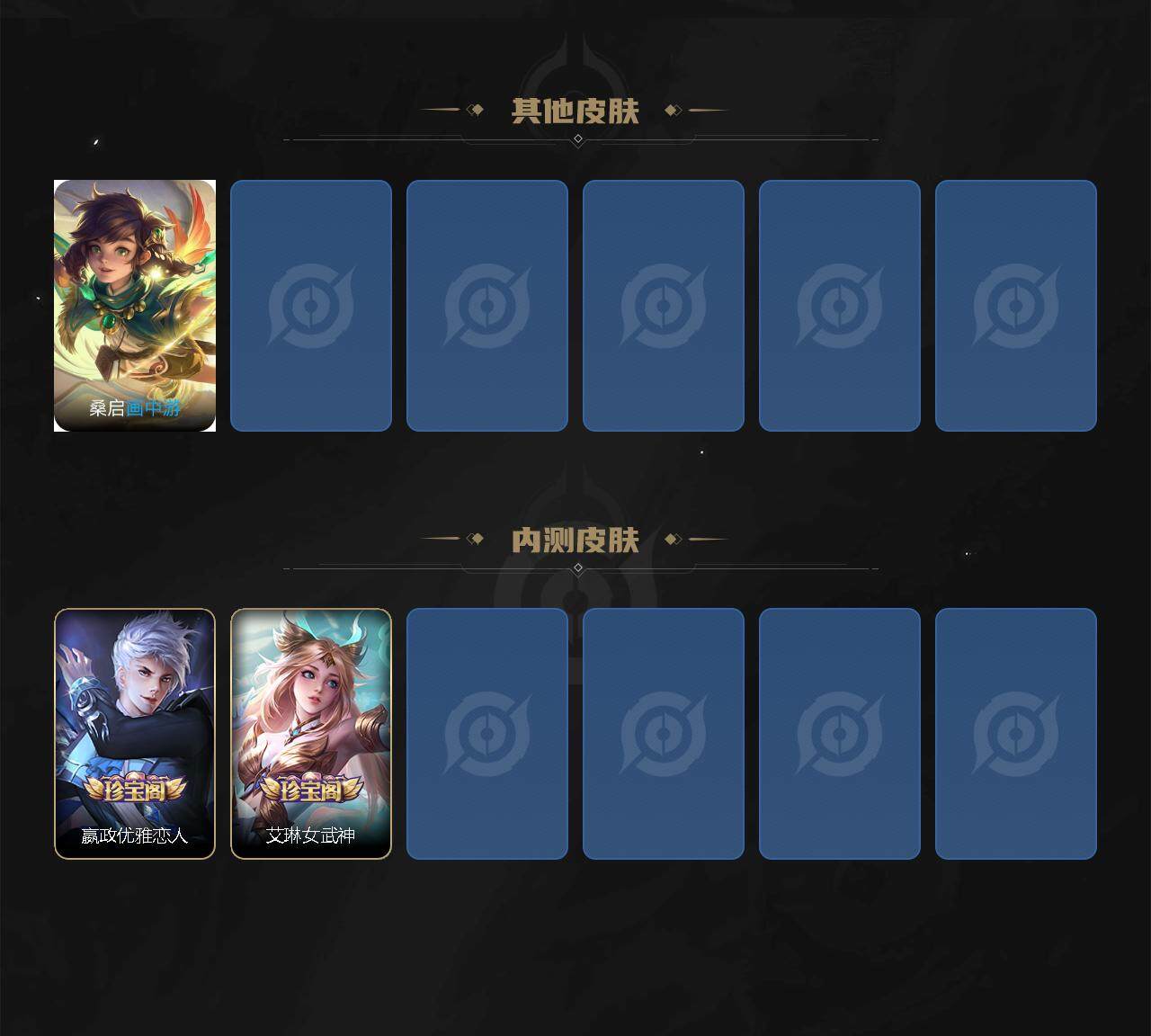 关羽冰锋战神,裴擒虎李小龙,上官婉儿梁祝,后羿辉光之辰,伽罗天狼溯光者,马可波罗逐梦之星,孙悟空大圣娶亲,露娜一生所爱,赵云引擎之心,大乔白鹤梁神女,不知火舞绯月行,马可波罗山海·玄木吟,桑启鸣野蒿