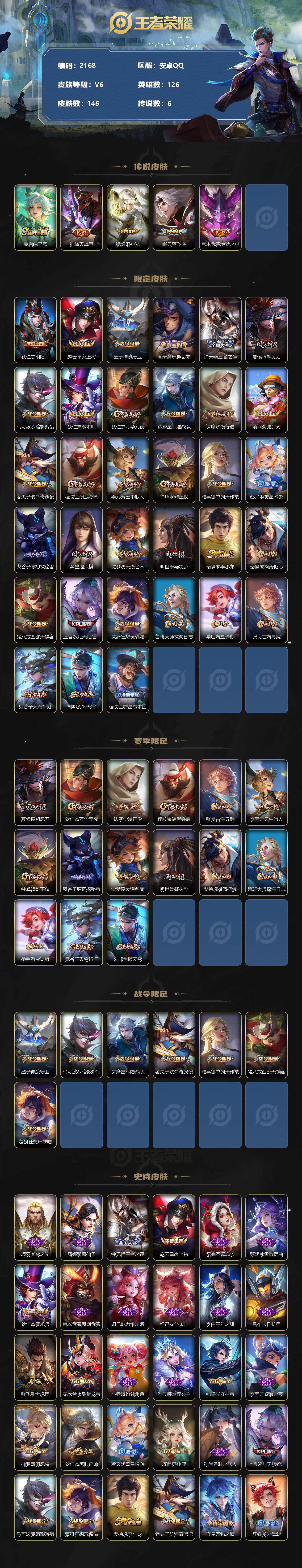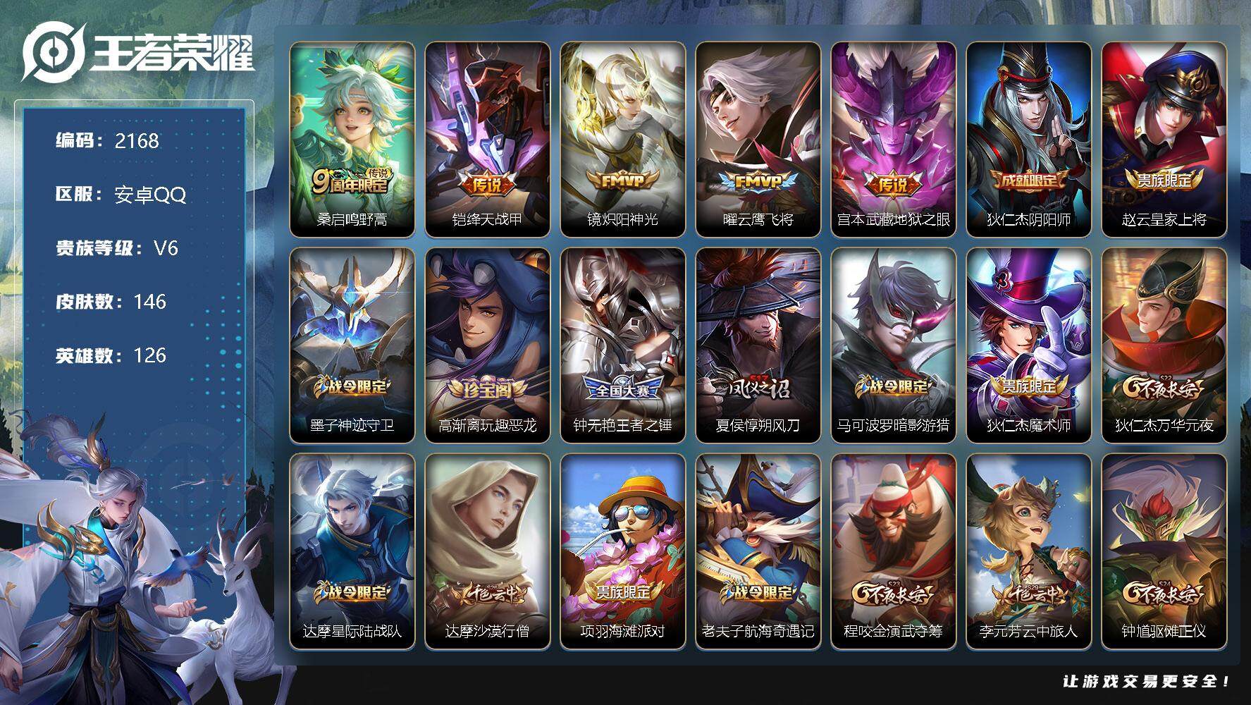 [13009638]安卓Q-V6-至尊星耀II段位-126英雄-146皮肤-0典藏-0珍品无双-0无双-0珍品传说-6传说-33史诗