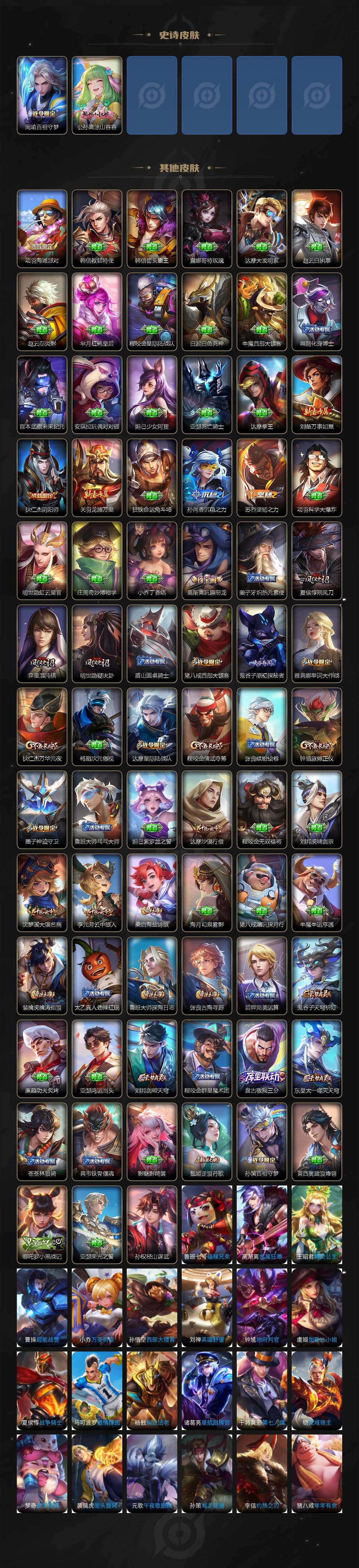 【史诗皮肤】:项羽苍穹之光,露娜紫霞仙子,钟无艳王者之锤,赵云皇家上将,貂蝉圣诞恋歌,甄姬冰雪圆舞曲,狄仁杰魔术师,宫本武藏鬼剑武藏,妲己魅力维加斯,妲己女仆咖啡,李白千年之狐,吕布末日机甲,张飞乱世虎臣,花木兰水晶猎龙者,小乔缤纷独角兽,雅典娜冰冠公主,铠曙光守护者,李元芳逐浪之夏,伽罗箭羽风息,狄仁杰鹰眼统帅,蔡文姬繁星吟游,瑶遇见神鹿,孙尚香时之恋人,上官婉儿天狼绘梦者,马可波罗暗影游猎,蒙犽狂想玩偶喵,裴擒虎李小龙,老夫子航海奇遇记,弈星万物之道,狂铁龙之律动,周瑜百相守梦,公孙离涂山容容,女娲万灵启世