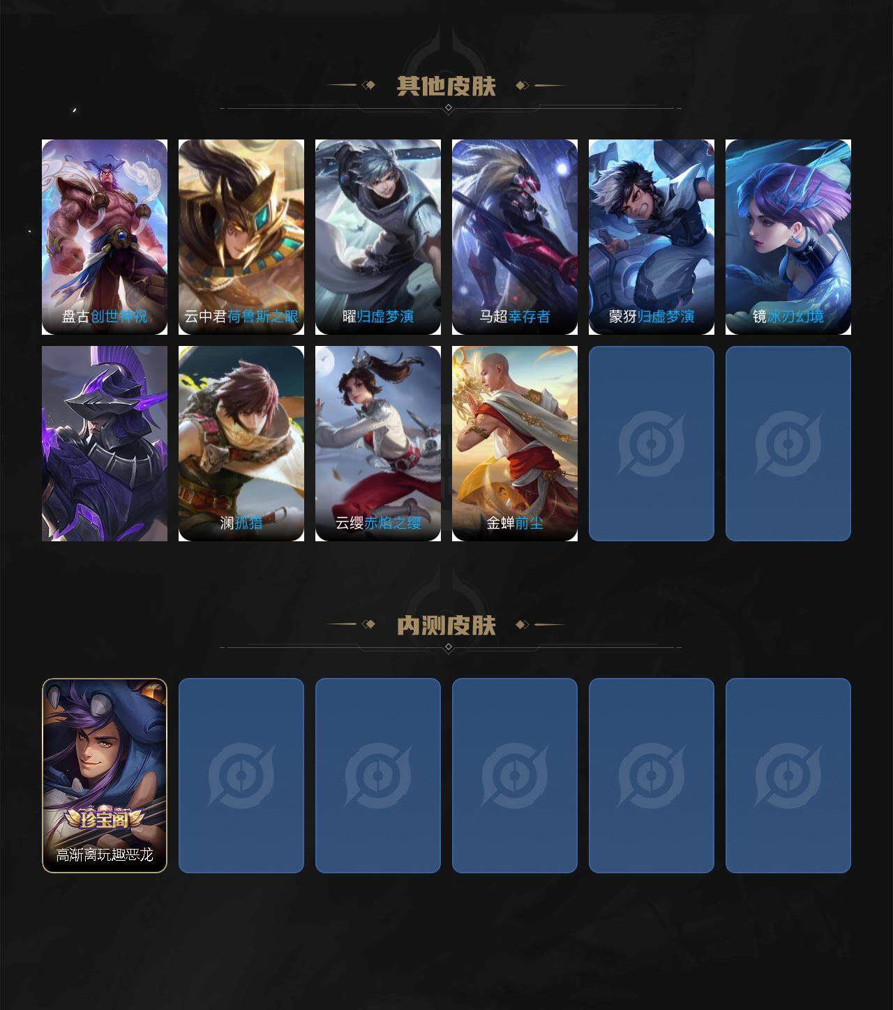 【赛季限定】:夏侯惇朔风刀,狄仁杰万华元夜,达摩沙漠行僧,程咬金演武夺筹,张良古海寻踪,李元芳云中旅人,钟馗驱傩正仪,鬼谷子原初探秘者,弈星混沌棋,沈梦溪大漠名商,明世隐疑决卦,裴擒虎擒涛扼浪,鲁班大师探海日志,桑启海盐诗旅,鬼谷子天穹祈灯,刘邦剑破天穹