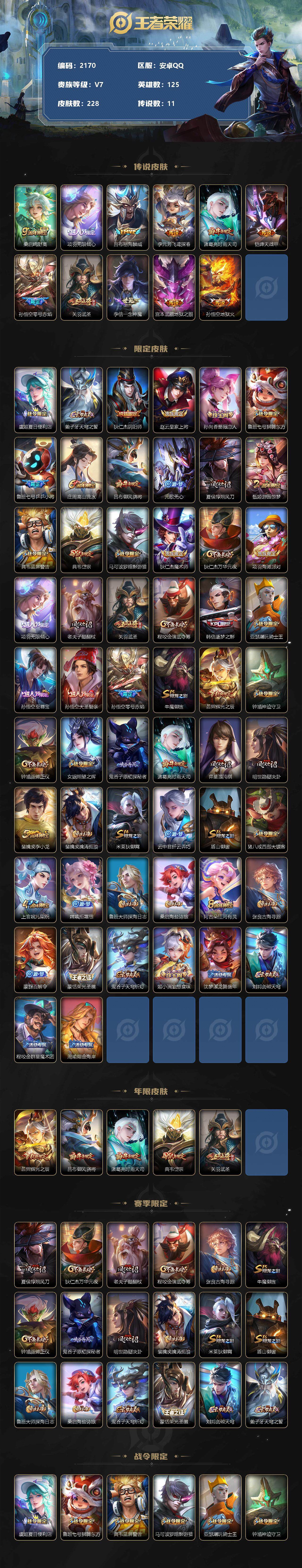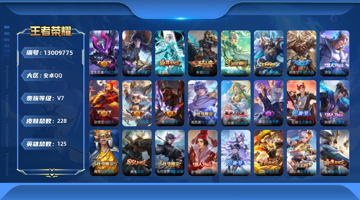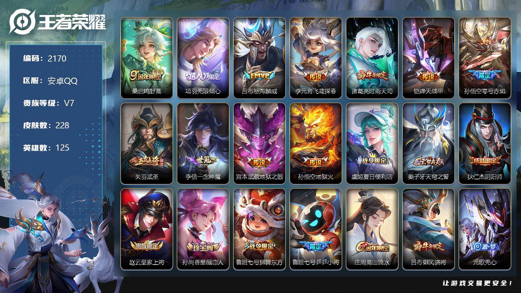 [13009775]安卓Q-V7-最强王者段位-125英雄-228皮肤-0典藏-0珍品无双-0无双-0珍品传说-11传说-58史诗