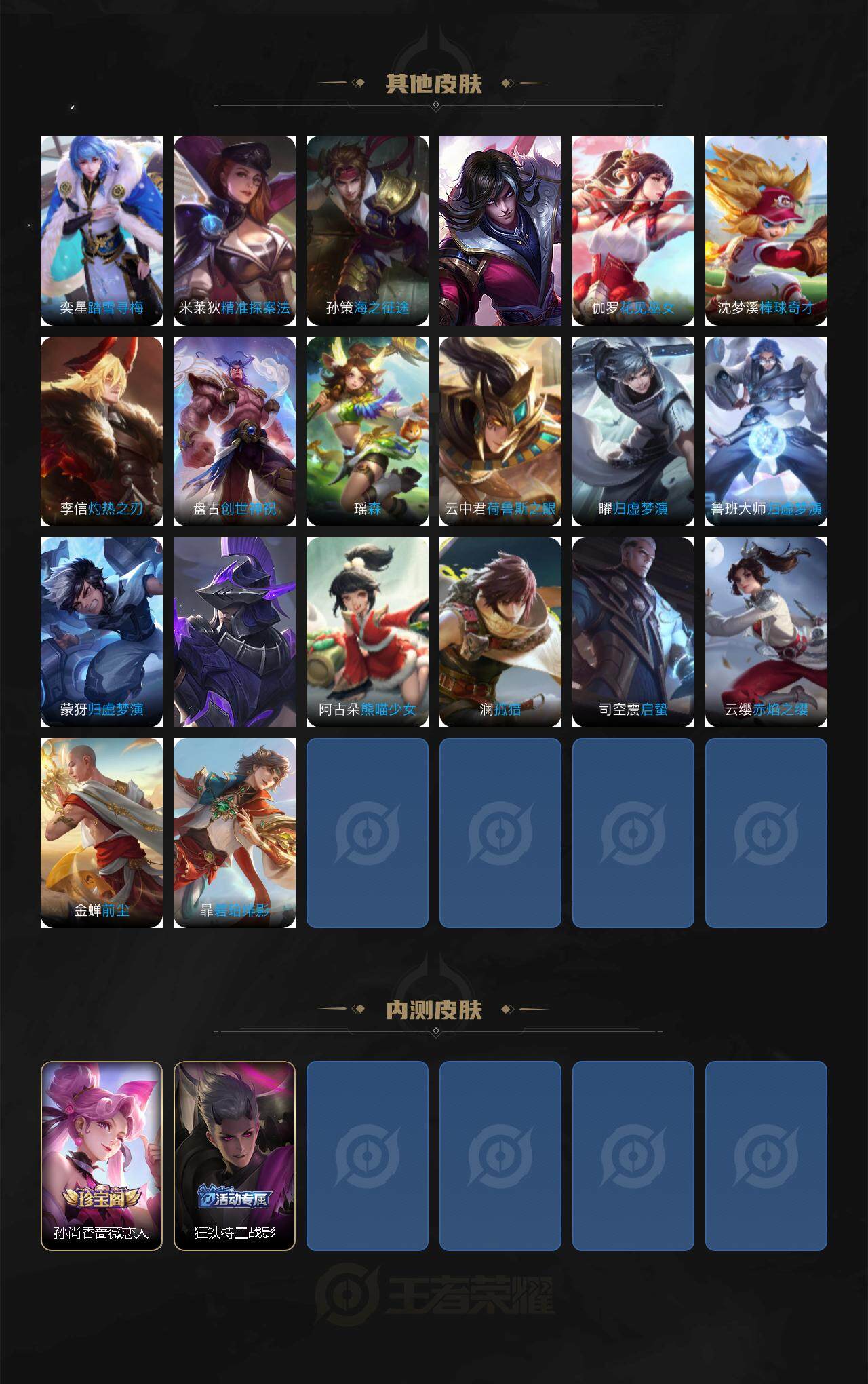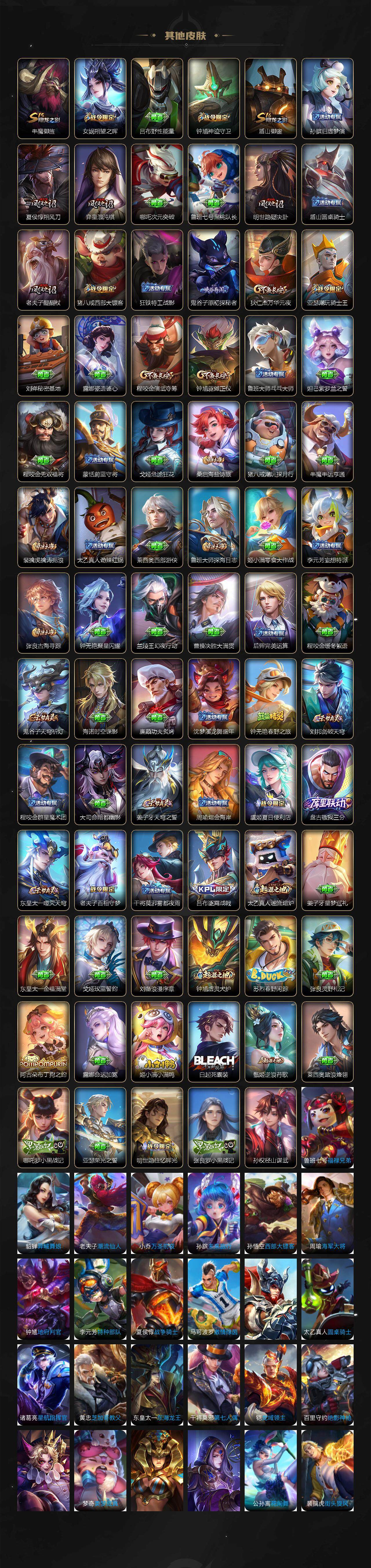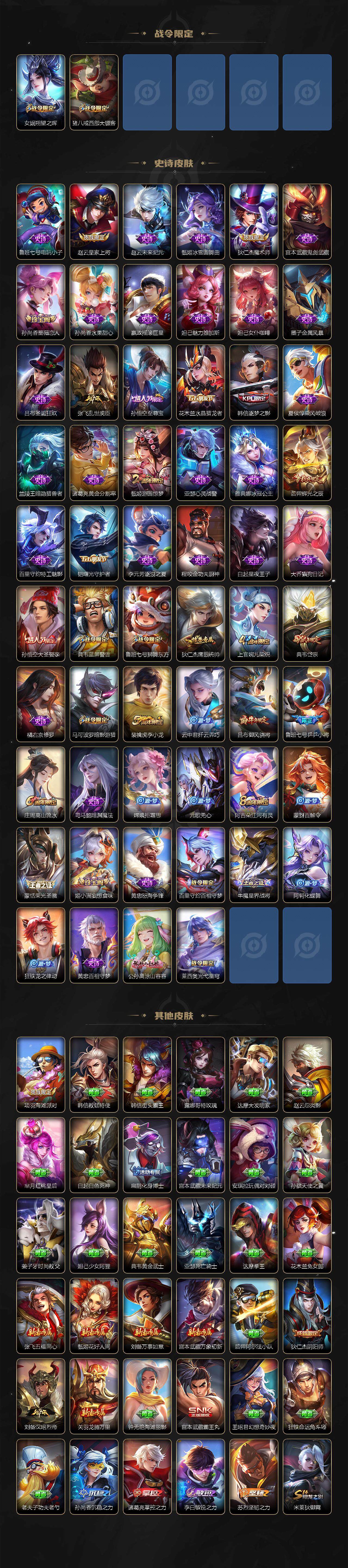 【限定皮肤】:虞姬夏日便利店,姜子牙天穹之誓,狄仁杰阴阳师,赵云皇家上将,孙尚香蔷薇恋人,鲁班七号狮舞东方,鲁班七号乒乒小将,庄周高山流水,吕布御风骁将,元歌无心,夏侯惇朔风刀,甄姬游园惊梦,典韦蓝屏警告,典韦岱宗,马可波罗暗影游猎,狄仁杰魔术师,狄仁杰万华元夜,项羽海滩派对,项羽无限倾心,老夫子醍醐杖,关羽武圣,程咬金演武夺筹,韩信逐梦之影,亚瑟潮玩骑士王,孙悟空至尊宝,孙悟空大圣娶亲,孙悟空零号赤焰,牛魔御旌,后羿辉光之辰,钟馗神迹守卫,钟馗驱傩正仪,女娲朔望之晖,鬼谷子原初探秘者,诸葛亮时雨天司,弈星混沌棋,明世隐疑决卦,裴擒虎李小龙,裴擒虎擒涛扼浪,米莱狄御霄,云中君纤云弄巧,盾山御銮,猪八戒西部大镖客,上官婉儿梁祝,嫦娥拒霜思,鲁班大师探海日志,桑启海盐诗旅,阿古朵江河有灵,张良古海寻踪,蒙犽百解令,蒙恬荣光圣徽,鬼谷子天穹祈灯,姬小满妄想食味,沈梦溪龙舞盛年,刘邦剑破天穹,程咬金群星魔术团,周瑜熔金海岸