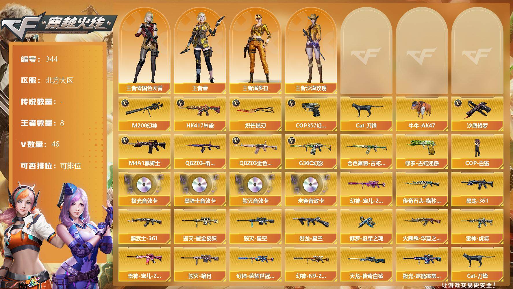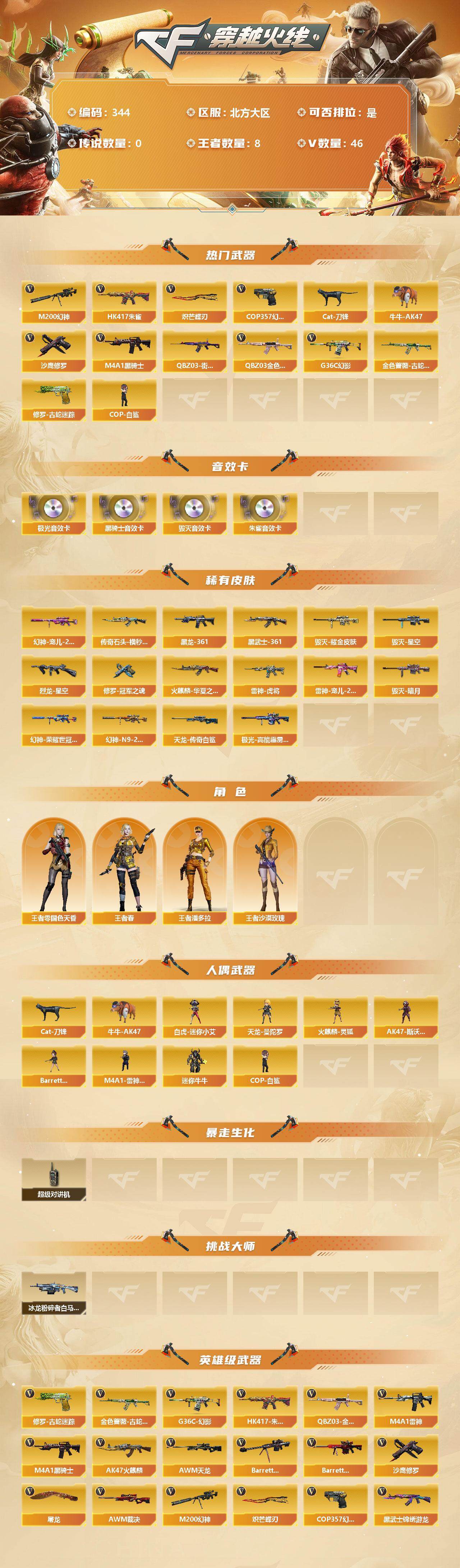 [13010214]北方大区-46V-8王者-0炫金 【热门武器】:G36C-幻影,QBZ03-金色蔷薇,HK417-朱雀,M200-幻神,金色蔷薇-古蛇迷踪,修罗-古蛇迷踪,QBZ03-街机,Cat-刀锋,牛牛-AK47,M4A1-黑骑士,COP-白鲨,COP 357-幻灵*2,沙鹰-修罗,炽芒蝶刃 【音效卡】:M4A1-黑骑士音效卡,Barrett-毁灭音效卡,Barrett-极光音效卡,HK417-朱雀音效卡 【皮肤】:幻神-宠儿-2021MVP,M200-幻神-荣耀世冠白鲨,M200-幻神-N9-2022MVP,裁决-流光秘银,烈龙-星空,雷神-暗月,雷神-虎将,雷神-宠儿-2019MVP,火麒麟-华夏之心,传奇石头-横秒之巅,毁灭-暗月,毁灭耀金皮肤,毁灭-星空,极光-高能霹雳 皮肤,AWM-天龙-传奇白鲨,修罗-冠军之魂,M4A1-黑龙-361,AK47-黑武士-361 【角色】:王者-零-国色天香,王者春,王者潘多拉,王者沙漠玫瑰 【人偶武器】:COP-白鲨,白虎-迷你小艾,天龙-曼陀罗,火麒麟-灵狐,M4A1-雷神-精英刀锋,AK47-斯沃特,Barrett-夜玫瑰,Cat-刀锋,牛牛-AK47,迷你牛牛 【暴走生化】:超级对讲机 【挑战大师】:冰龙粉碎者-白马银枪 【英雄级武器】:AK47-火麒麟,M4A1-雷神,M4A1-黑骑士,HK417-朱雀,G36C-幻影,黑武士-锦绣游龙,金色蔷薇-古蛇迷踪,QBZ03-金色蔷薇,AWM-天龙,Barrett-毁灭,Barrett-极光,AWM-裁决,M200-幻神,沙鹰-修罗,COP 357-幻灵*2,修罗-古蛇迷踪,屠龙*2,炽芒蝶刃 【特殊枪械】:1黑骑士