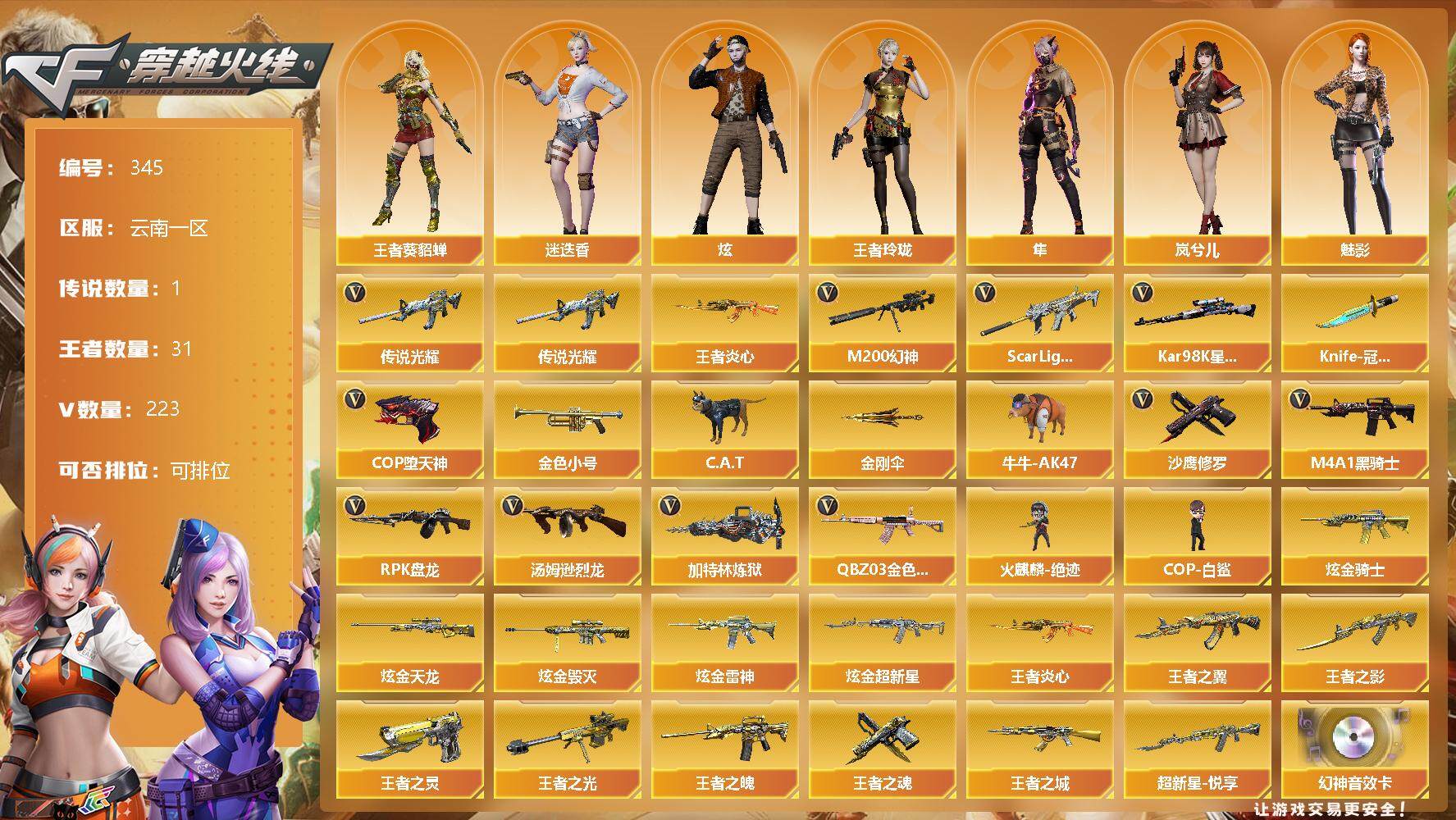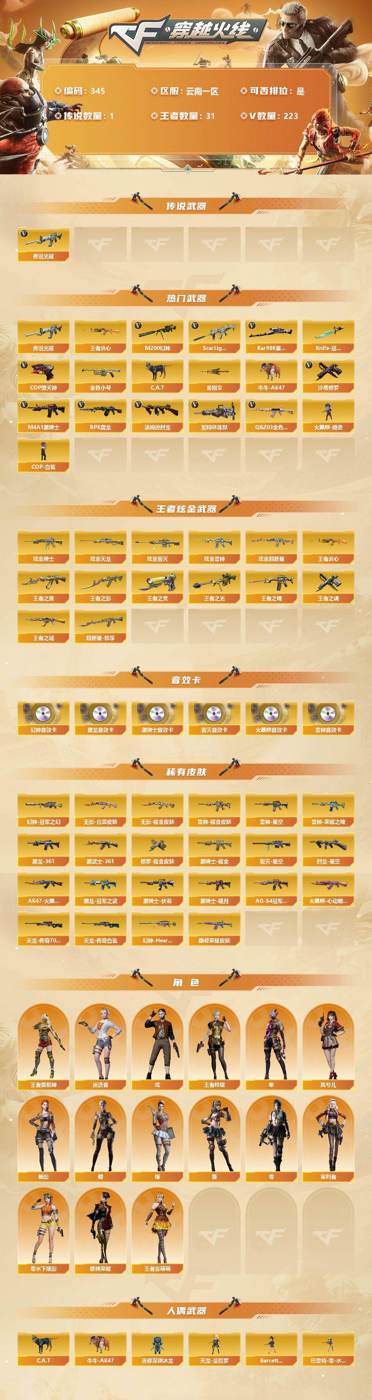 [13010285]云南一区-223V-31王者-10炫金 【传说武器】:传说光耀 【热门武器】:传说光耀,QBZ03-金色蔷薇*5,Scar Light-白虎,M200-幻神,王者炎心,Kar98K-星神,金色小号,C.A.T,牛牛-AK47,M4A1-黑骑士*8,汤姆逊-烈龙*6,RPK-盘龙*6,加特林-炼狱*2,火麒麟-绝迹,COP-白鲨,COP-堕天神*3,沙鹰-修罗*12,Knife-冠军之刃,金刚伞 【王者炫金武器】:王者之城,王者炎心,超新星-悦享,王者之翼,王者之影,王者之魄,王者之光,王者之灵*3,王者之魂,炫金骑士*3,炫金天龙,炫金毁灭*2,炫金雷神*3,炫金超新星 【音效卡】:M200-幻神音效卡,AK47-火麒麟音效卡,M4A1-雷神音效卡*2,M4A1-黑龙音效卡,M4A1-黑骑士音效卡,Barrett-毁灭音效卡*2 【皮肤】:幻神-冠军之幻,幻神-Heartshot 皮肤,QBZ03-巅峰荣耀皮肤,烈龙-星空,雷神-荣耀之魄,雷神-星空*4,雷神-耀金皮肤,M4A1-雷神-巅峰荣耀皮肤,雷神-源计划2.0专属 皮肤,M4A1-再燃火线,AK47-火麒麟-传奇EVEN,火麒麟-心动糖果,毁灭-星空,AWM-天龙-传奇70KG,AWM-天龙-传奇白鲨,修罗耀金皮肤,M4A1-千变-孔明皮肤,黑龙-能量核心,黑龙-暗月,M4A1-黑龙-361,黑龙-冠军之武,黑骑士-暗月,黑骑士耀金皮肤,黑骑士-伏羲,黑骑士-AG-S4冠军典藏,无影耀金皮肤,无影-霓裳皮肤,AK47-黑武士-361 【角色】:审判者,零,葵,樱,瞳,魅影,炫,迷迭香,岚兮儿,隼,王者-葵-貂蝉,王者玲珑,王者雾萌萌,零-水下丽影,铁骑荣耀 【人偶武器】:火麒麟-绝迹,COP-白鲨,天龙-曼陀罗,M4A1-雷神-精英刀锋,巴雷特-零-水下丽影,AWM-灵狐-15周年嘉年华,Barrett-夜玫瑰,M37-葵,C.A.T,牛牛-AK47,迷你深渊冰龙*2,夺魂,生化手雷-机甲核心,闪光弹-小乔,闪光弹-貂蝉,高爆手雷-大乔 【暴走生化】:超级对讲机 【挑战大师】:AK47-冰龙粉碎者,神圣爆裂者III,神圣爆裂者-末日III,阐释者III 【英雄级武器】:M4A1-千变,AK47-火麒麟*10,M4A1-黑龙*3,M4A1-雷神*9,M4A1-黑骑士*8,AK47-无影*2,M4A1-死神*