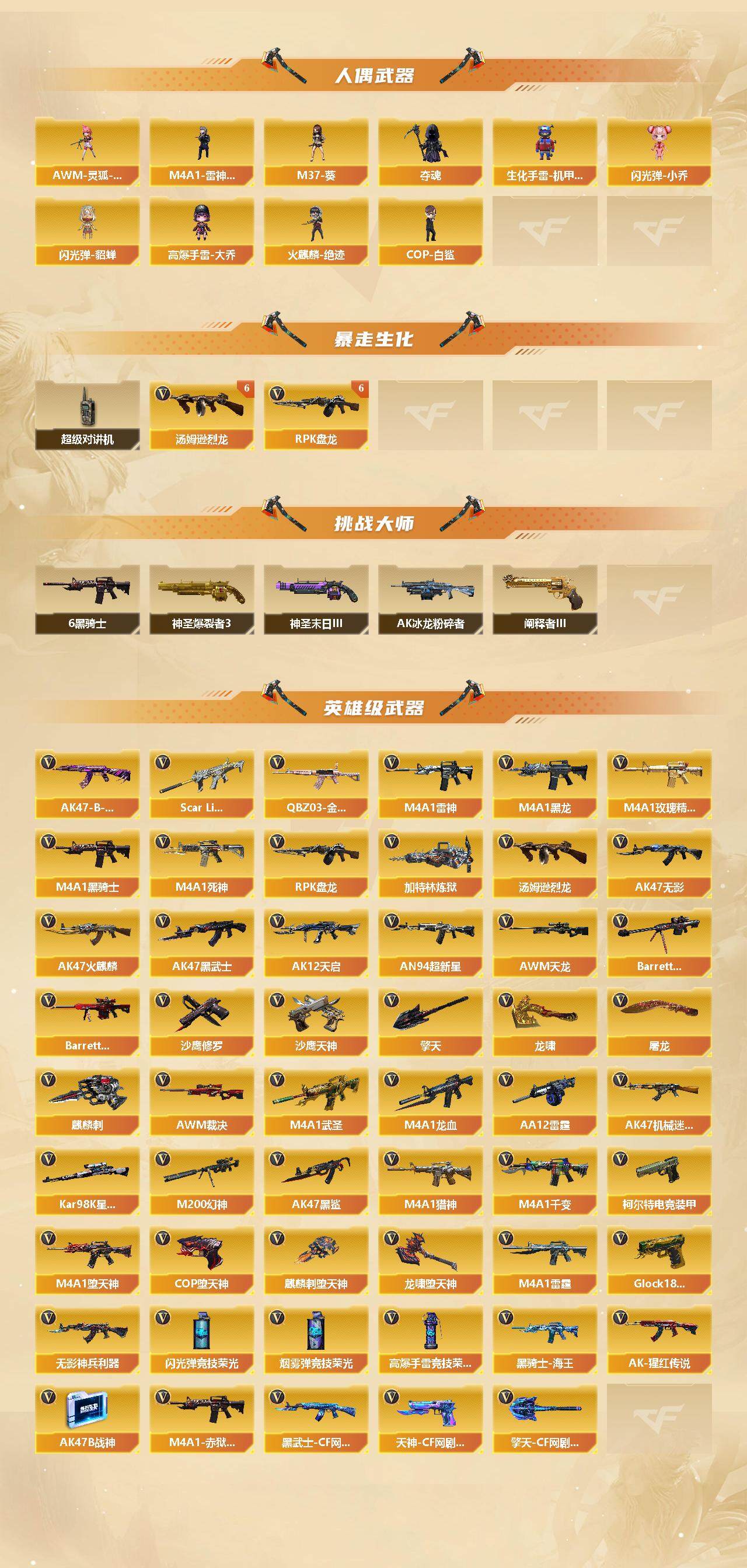 【英雄级武器】:M4A1-千变,AK47-火麒麟*10,M4A1-黑龙*3,M4A1-雷神*9,M4A1-黑骑士*8,AK47-无影*2,M4A1-死神*