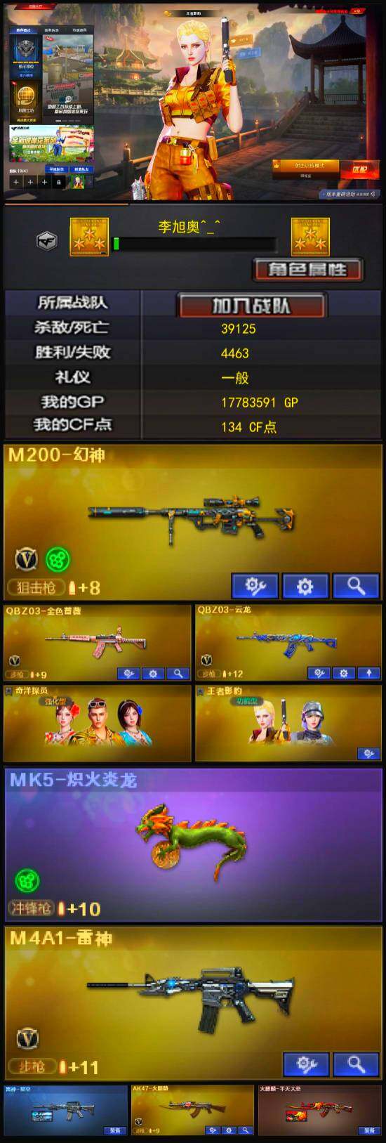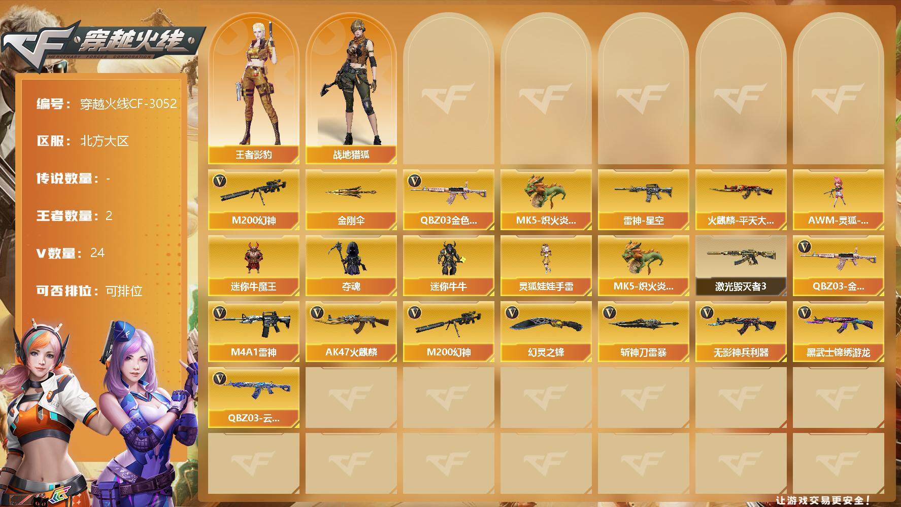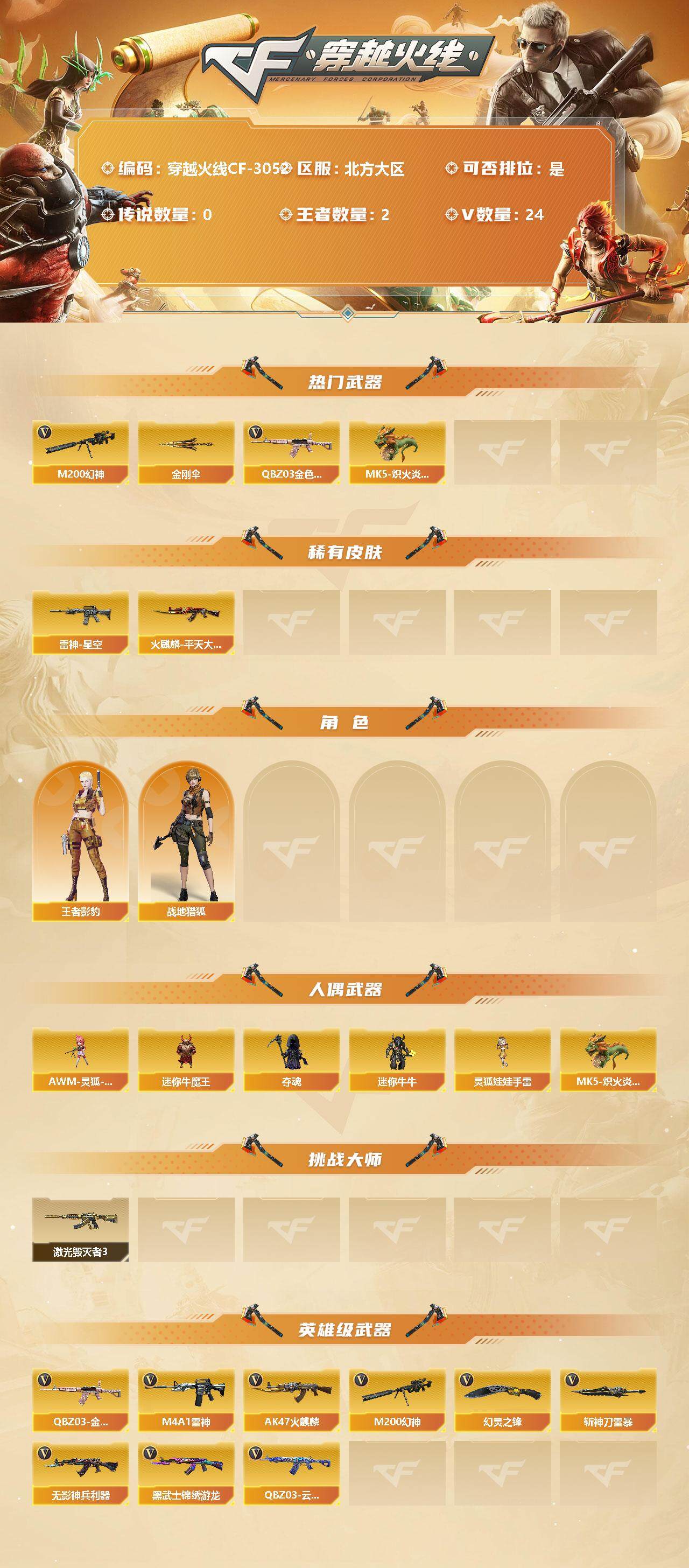 [13010365]北方大区-24V-2王者-0炫金 【热门武器】:QBZ03-金色蔷薇,M200-幻神,MK5-炽火炎龙,金刚伞 【皮肤】:雷神-星空,火麒麟-平天大圣 【角色】:战地猎狐,王者影豹 【人偶武器】:MK5-炽火炎龙,AWM-灵狐-15周年嘉年华,迷你牛魔王,夺魂,迷你牛牛,灵狐娃娃手雷 【挑战大师】:激光毁灭者III 【英雄级武器】:AK47-火麒麟,M4A1-雷神,无影-神兵利器,QBZ03-云龙,黑武士-锦绣游龙,QBZ03-金色蔷薇,M200-幻神,幻灵之锋,斩神刀-雷暴 【特殊枪械】: