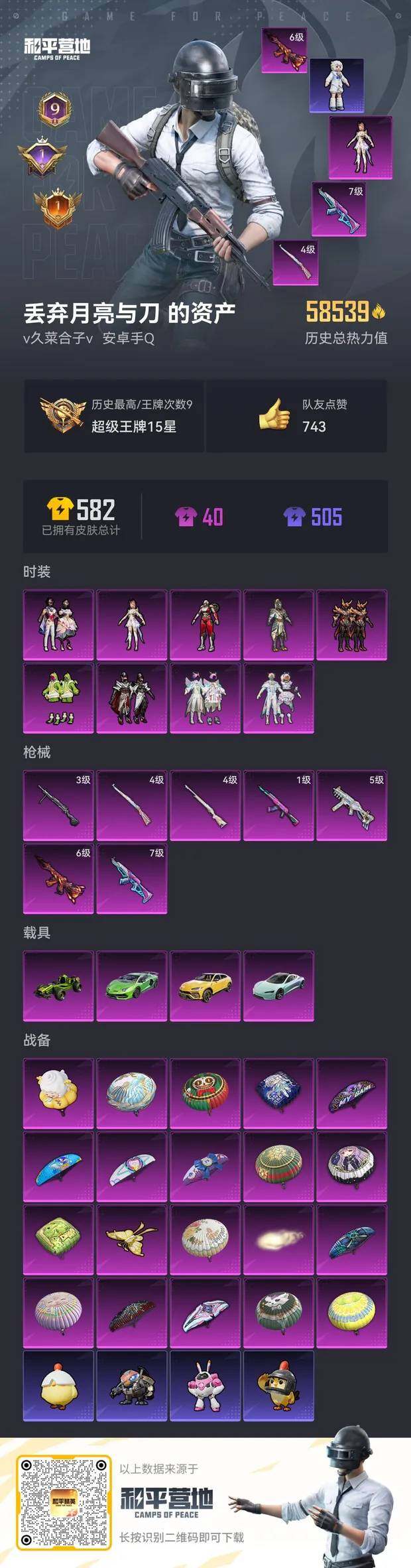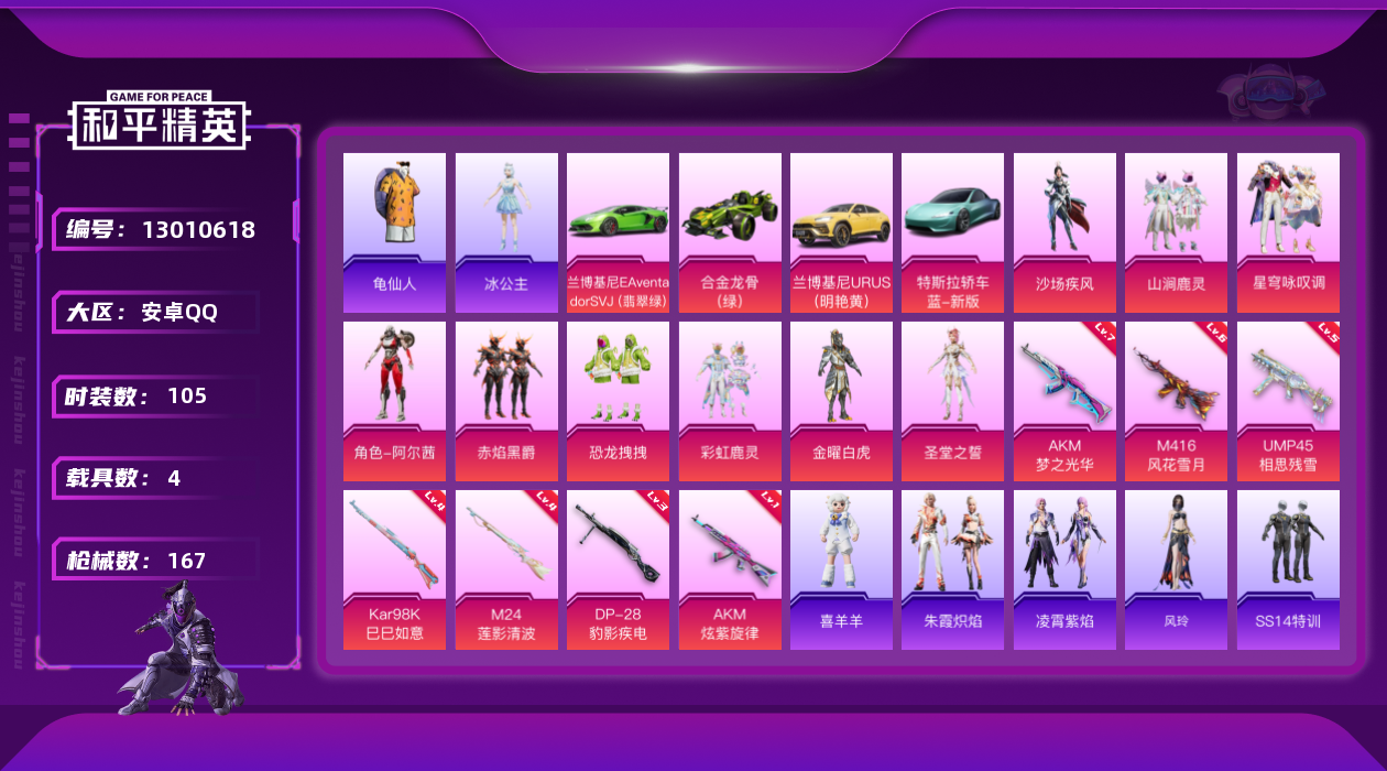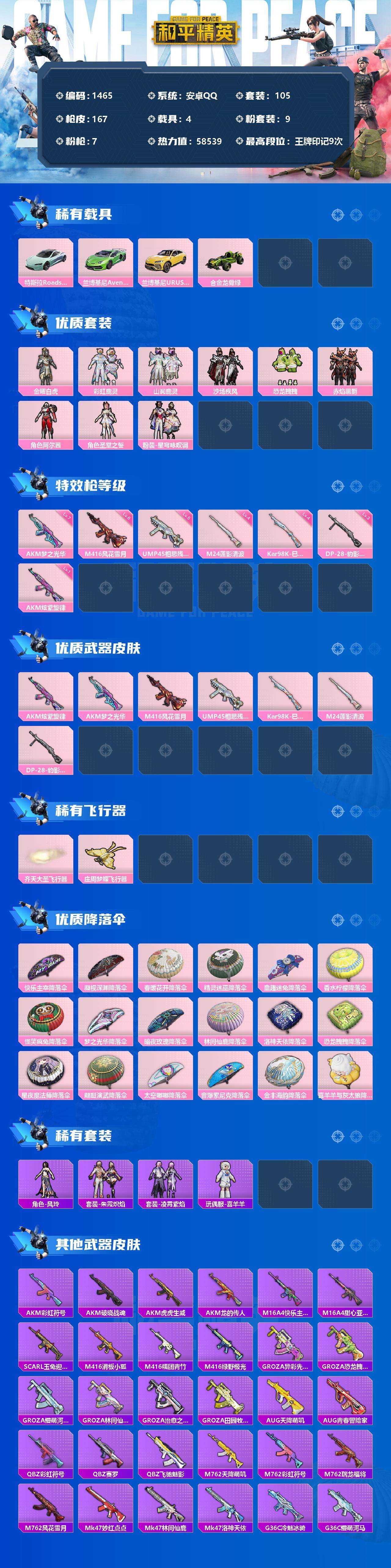 [13010618]安卓 手Q-9粉装-7特效枪-4载具-2粉色飞行器-58539热力值-9王牌印记-105套装-167枪皮