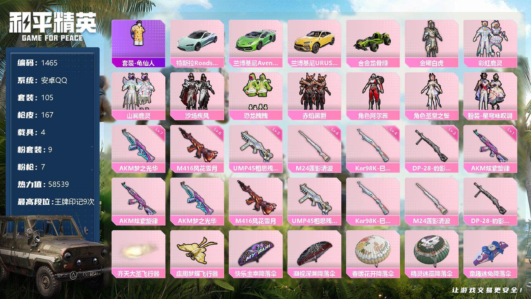 [13010618]安卓 手Q-9粉装-7特效枪-4载具-2粉色飞行器-58539热力值-9王牌印记-105套装-167枪皮 【热门品类】:套装-龟仙人 【粉色载具】:特斯拉Roadster(水滴蓝),兰博基尼Aventador SVJ(翡翠绿),兰博基尼URUS(明艳黄),合金龙骨(绿) 【粉色套装】:粉装-金曜白虎,粉装-彩虹鹿灵,粉装-山涧鹿灵,粉装-沙场疾风,粉装-恐龙拽拽,粉装-赤焰黑爵,角色-阿尔茜,角色-圣堂之誓,粉装-星穹咏叹调 【粉色枪皮等级】:AKM-炫紫旋律(一级),AKM-梦之光华(七级),M416-风花雪月(六级),UMP45-相思残雪(五级),Kar98K-巳巳如意(四级),M24-莲影清波(四级),DP-28-豹影疾电(三级) 【粉色枪皮】:AKM-炫紫旋律,AKM-梦之光华,M416-风花雪月,UMP45-相思残雪,Kar98K-巳巳如意,M24-莲影清波,DP-28-豹影疾电 【粉色飞行器】:齐天大圣飞行器,庄周梦蝶飞行器 【粉色降落伞】:快乐主宰降落伞,凝视深渊降落伞,春暖花开降落伞,精灵迷巫降落伞,童趣迷兔降落伞,香水柠檬降落伞,怪笑疯兔降落伞,梦之光华降落伞,暗夜玫瑰降落伞,林间仙鹿降落伞,洛神天依降落伞,恐龙拽拽降落伞,星夜魔法师降落伞,翩跹演武降落伞,太空嘟嘟降落伞,音爆索尼克降落伞,金丰海韵降落伞,喜羊羊与灰太狼降落伞 【稀有套装】:套装-龟仙人,角色-风玲,套装-朱霞炽焰,套装-凌霄紫焰,玩偶服-喜羊羊 【稀有枪皮】:AKM-彩虹符号,AKM-破晓战魂,AKM-虎虎生威,AKM-龙的传人,M16A4-快乐主宰,M16A4-甜心亚梦,SCAR-L-玉兔迎春,M416-滑板小狐,M416-糯团青竹,M416-绿野极光,GROZA-异彩先驱,GROZA-恐龙拽拽,GROZA-懵萌河马,GROZA-林间仙鹿,GROZA-治愈之星,GROZA-田园牧歌,AUG-天降萌叽,AUG-青春冒险家,QBZ-彩虹符号,QBZ-赛罗,QBZ-飞驰魅影,M762-天降萌叽,M762-彩虹符号,M762-瑞龙福将,M762-风花雪月,Mk47-妙红点点,Mk47-林间仙鹿,Mk47-洛神天依,G36C-冷魅冰骑,G36C-懵萌河马,G36C-暗夜玫瑰,AC-VAL-天降萌叽,AC-VAL-快闪甜心,AC-VAL-甜心亚梦,蜜獾-天降萌叽,蜜獾-娇憨猪猪,ARX-