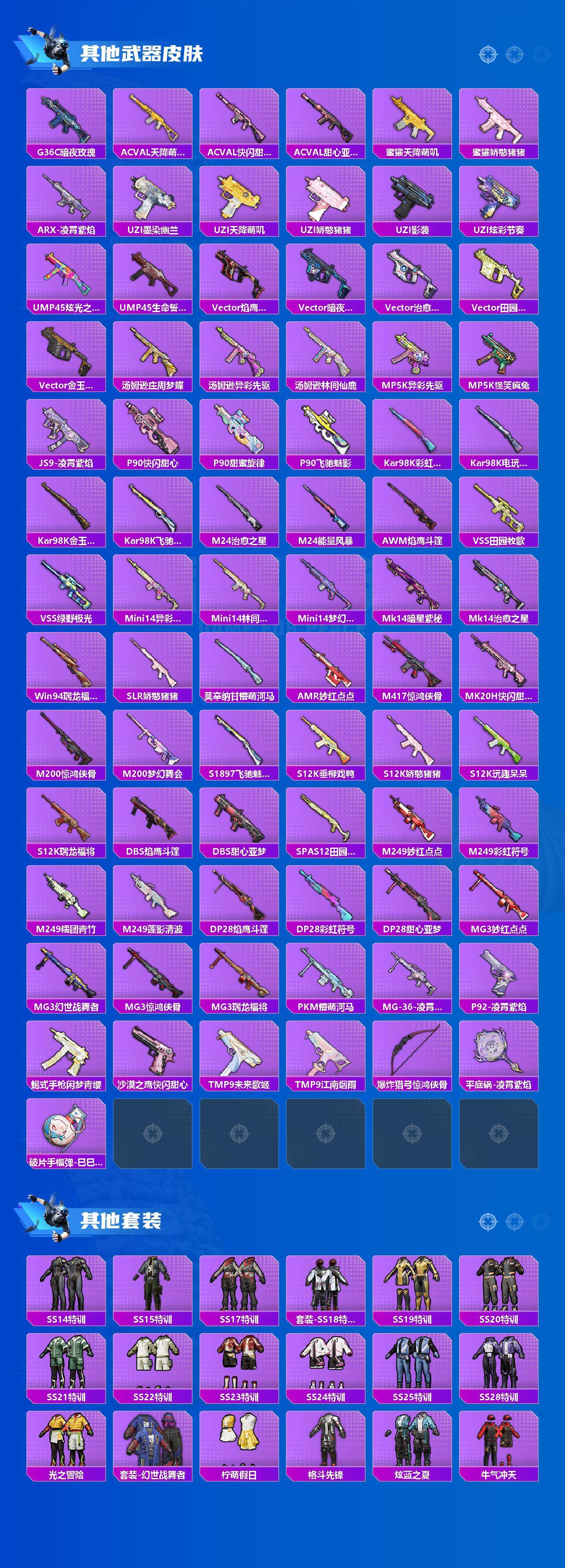 【稀有枪皮】:AKM-彩虹符号,AKM-破晓战魂,AKM-虎虎生威,AKM-龙的传人,M16A4-快乐主宰,M16A4-甜心亚梦,SCAR-L-玉兔迎春,M416-滑板小狐,M416-糯团青竹,M416-绿野极光,GROZA-异彩先驱,GROZA-恐龙拽拽,GROZA-懵萌河马,GROZA-林间仙鹿,GROZA-治愈之星,GROZA-田园牧歌,AUG-天降萌叽,AUG-青春冒险家,QBZ-彩虹符号,QBZ-赛罗,QBZ-飞驰魅影,M762-天降萌叽,M762-彩虹符号,M762-瑞龙福将,M762-风花雪月,Mk47-妙红点点,Mk47-林间仙鹿,Mk47-洛神天依,G36C-冷魅冰骑,G36C-懵萌河马,G36C-暗夜玫瑰,AC-VAL-天降萌叽,AC-VAL-快闪甜心,AC-VAL-甜心亚梦,蜜獾-天降萌叽,蜜獾-娇憨猪猪,ARX-
