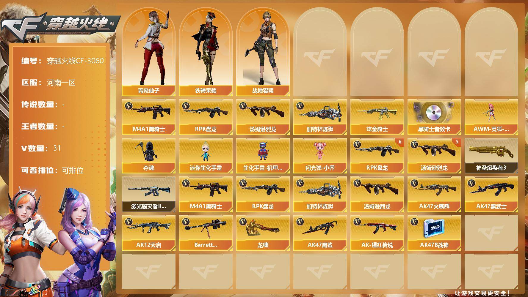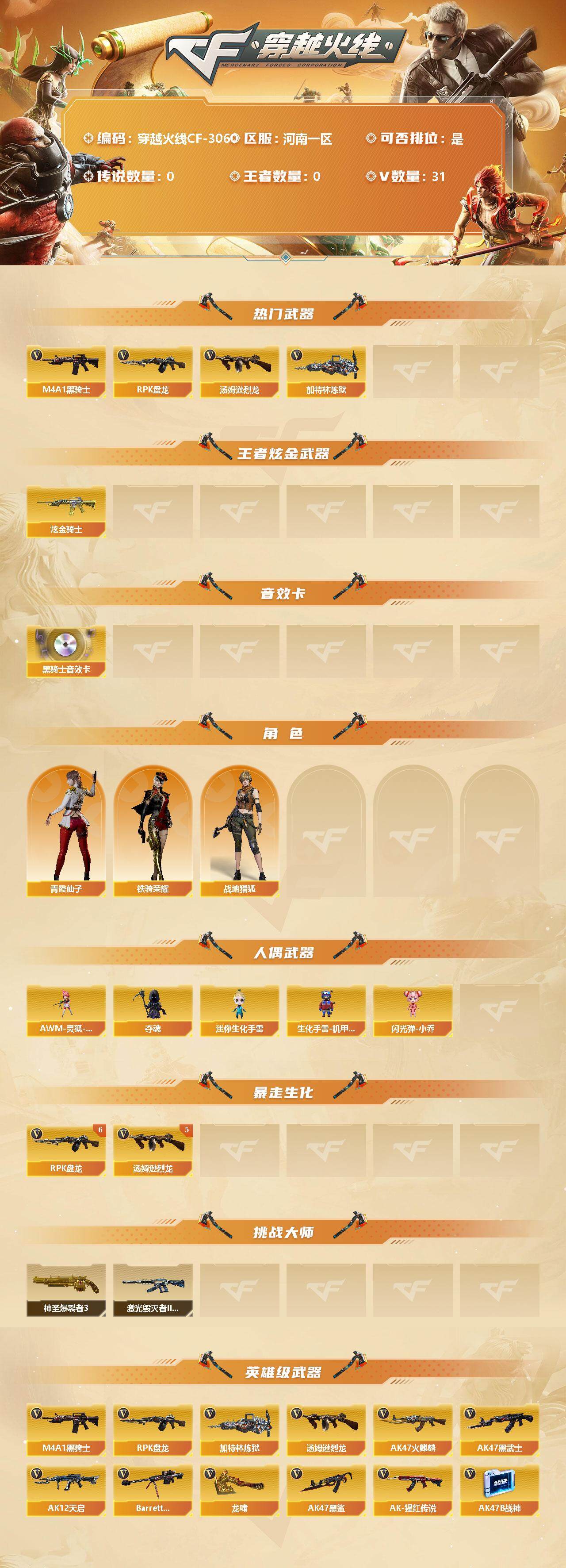 [13010797]河南一区-31V-0王者-1炫金 【热门武器】:M4A1-黑骑士,汤姆逊-烈龙*5,RPK-盘龙*6,加特林-炼狱*2 【王者炫金武器】:炫金骑士 【音效卡】:M4A1-黑骑士音效卡 【皮肤】:火麒麟-雷神 【角色】:战地猎狐,铁骑荣耀,青霞仙子 【人偶武器】:AWM-灵狐-15周年嘉年华,夺魂,迷你生化手雷,生化手雷-机甲核心,闪光弹-小乔 【挑战大师】:神圣爆裂者III,激光毁灭者III-白马银枪 【英雄级武器】:AK47-火麒麟*2,M4A1-黑骑士,AK47-黑武士,AK12-天启,AK47-黑鲨,AK-47-猩红传说*5,AK47-B-战神,Barrett-毁灭,RPK-盘龙*6,加特林-炼狱*2,汤姆逊-烈龙*5,龙啸 【特殊枪械】:1黑骑士,5烈龙,6盘龙,2炼狱