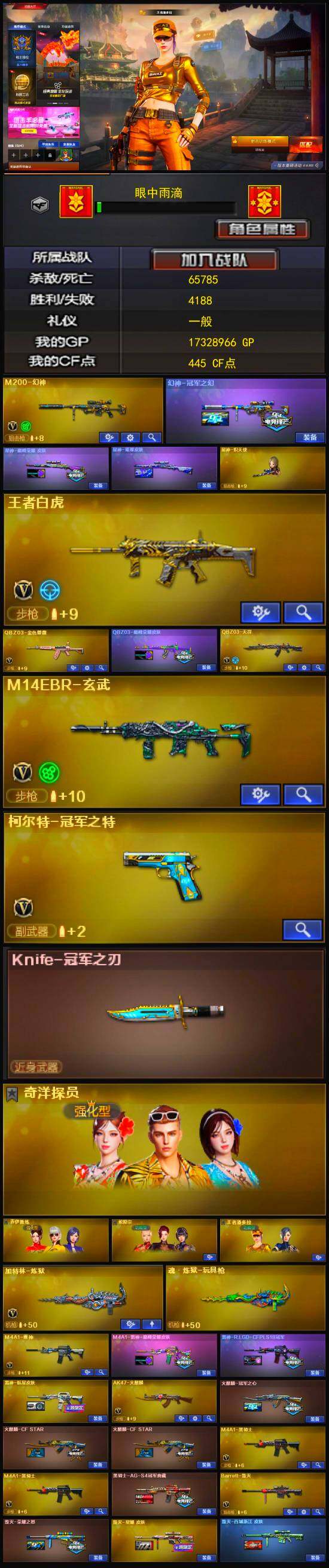 【热门武器】:QBZ03-金色蔷薇,M14EBR-玄武,M200-幻神,金色蔷薇-古蛇迷踪,修罗-古蛇迷踪,柯尔特-冠军之特,M4A1-黑骑士*2,加特林-炼狱,Knife-冠军之刃