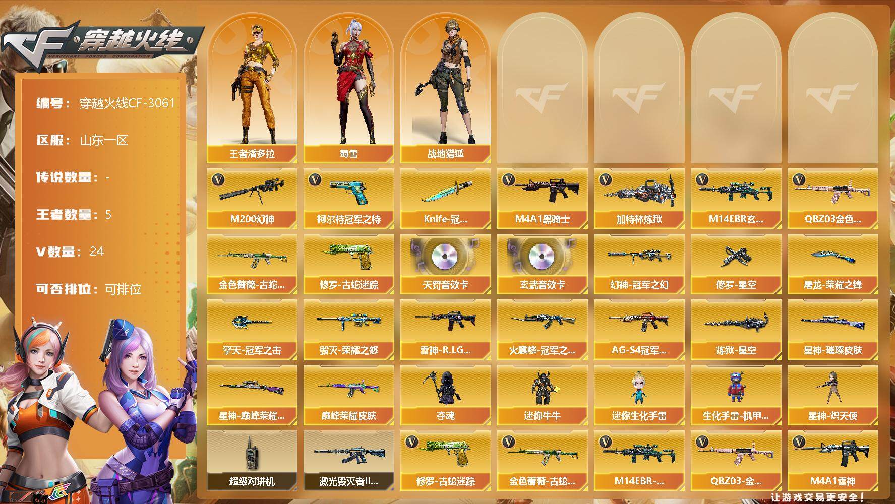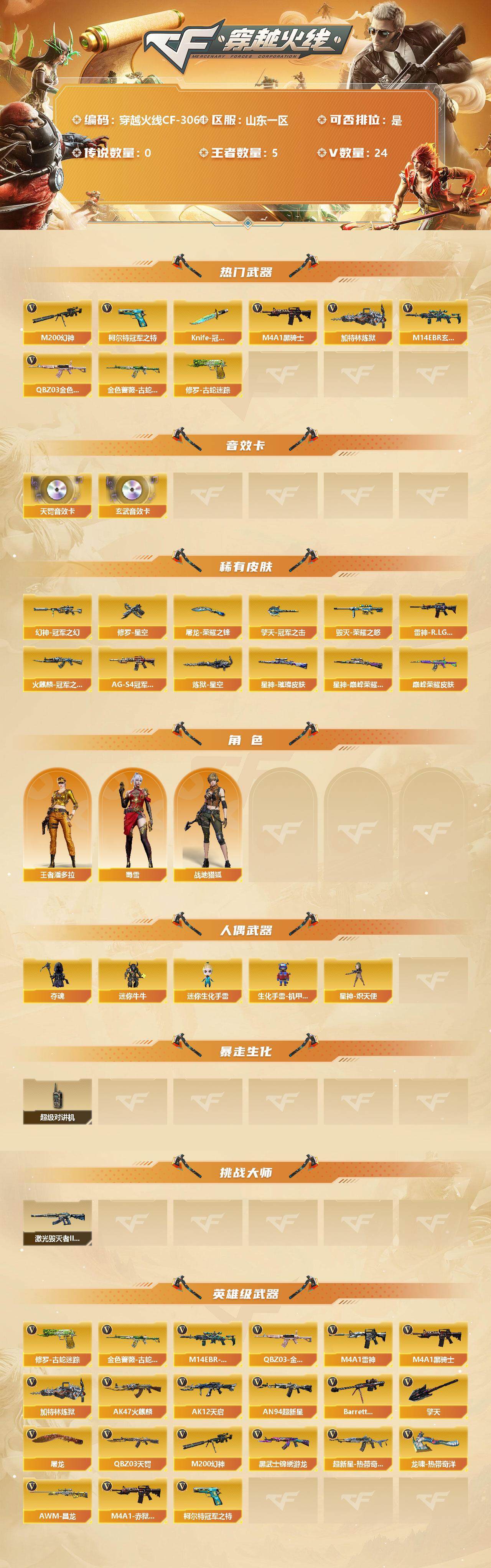 [13010979]山东一区-24V-5王者-0炫金 【热门武器】:QBZ03-金色蔷薇,M14EBR-玄武,M200-幻神,金色蔷薇-古蛇迷踪,修罗-古蛇迷踪,柯尔特-冠军之特,M4A1-黑骑士*2,加特林-炼狱,Knife-冠军之刃 【音效卡】:QBZ03-天罚音效卡,M14EBR-玄武音效卡 【皮肤】:幻神-冠军之幻,QBZ03-巅峰荣耀皮肤,星神-璀璨皮肤,星神-巅峰荣耀 皮肤,雷神-R.LGD-CFPLS18冠军,雷神-航星皮肤,M4A1-雷神-巅峰荣耀皮肤,火麒麟-雷神,火麒麟-冠军之心,毁灭-荣耀之怒,毁灭-星耀 皮肤,毁灭-百城浙江 皮肤,炼狱-星空,修罗-星空,屠龙-荣耀之锋,擎天-冠军之击,黑骑士-AG-S4冠军典藏 【角色】:战地猎狐,王者潘多拉,蜀雪 【人偶武器】:星神-炽天使,夺魂,迷你牛牛,迷你生化手雷,生化手雷-机甲核心*2 【暴走生化】:超级对讲机 【挑战大师】:激光毁灭者III-白马银枪 【英雄级武器】:AK47-火麒麟,M4A1-雷神,M4A1-黑骑士*2,AK12-天启,AN94-超新星,M14EBR-玄武,QBZ03-天罚,黑武士-锦绣游龙,超新星-热带奇洋,金色蔷薇-古蛇迷踪,QBZ03-金色蔷薇,Barrett-毁灭,M200-幻神,加特林-炼狱,修罗-古蛇迷踪,柯尔特-冠军之特,屠龙,擎天,龙啸-热带奇洋,M4A1-赤狱骑士,AWM-昌龙 【特殊枪械】:2黑骑士,1炼狱
