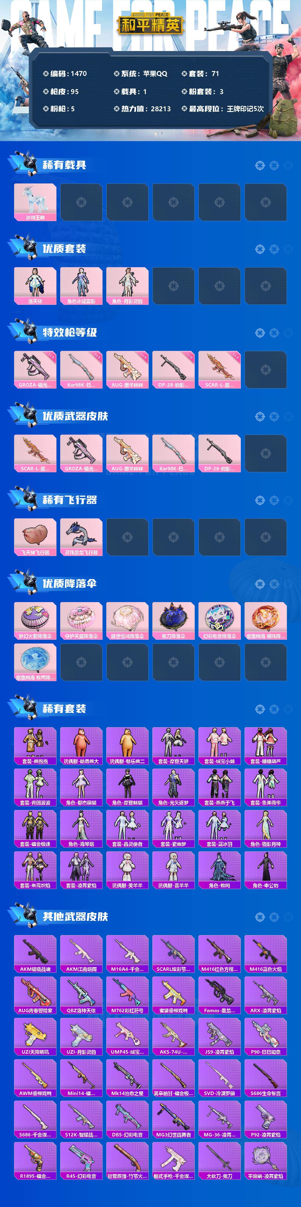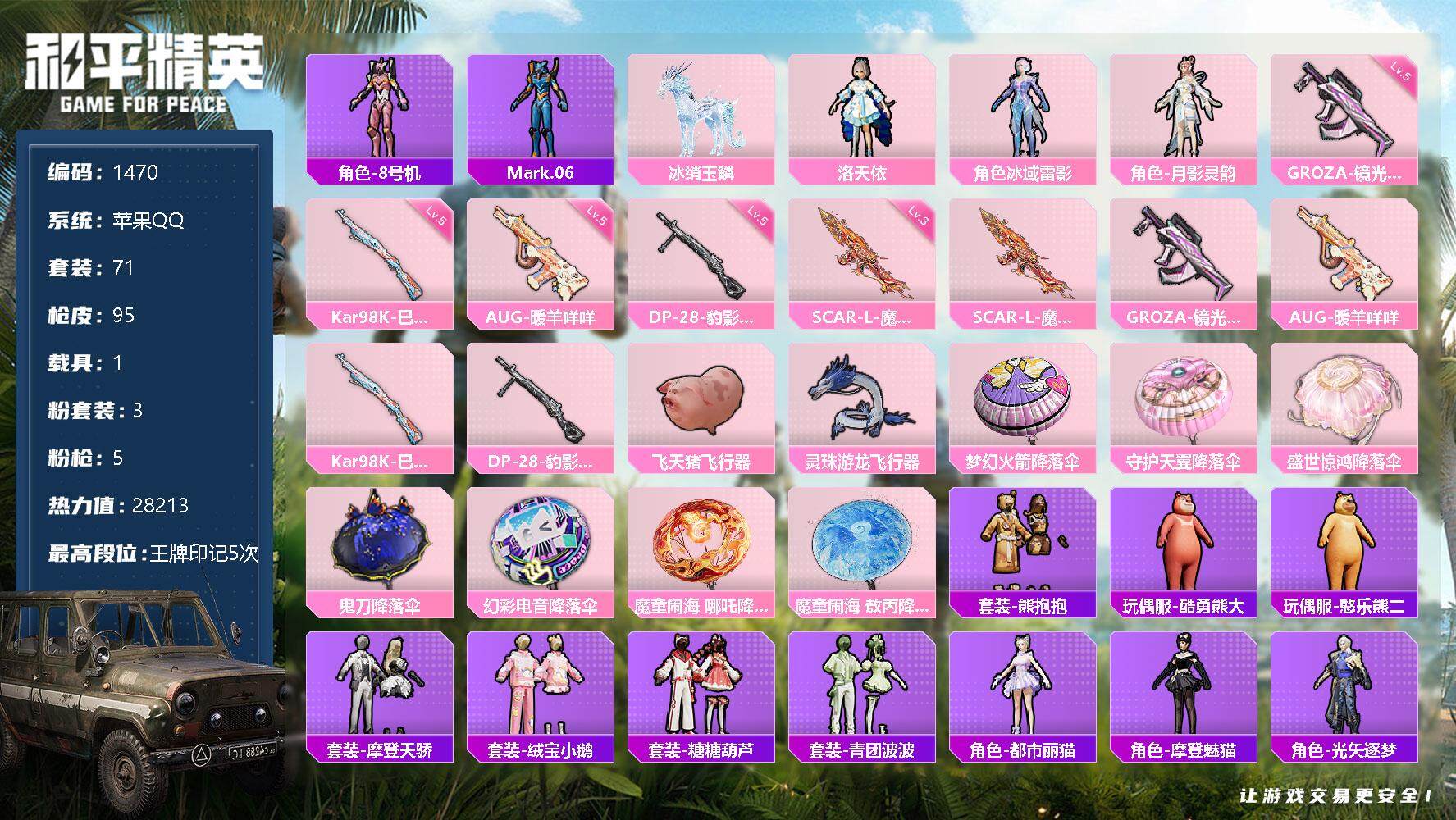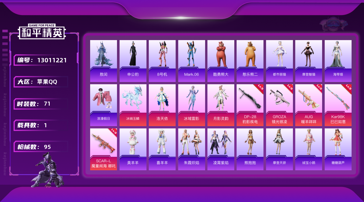 [13011221]苹果 手Q-3粉装-5特效枪-1载具-2粉色飞行器-28213热力值-5王牌印记-71套装-95枪皮 【热门品类】:角色-8号机,角色-Mark.06 【粉色载具】:冰绡玉鳞 【粉色套装】:角色-洛天依,角色-冰域雷影,角色-月影灵韵 【粉色枪皮等级】:SCAR-L-魔童闹海 哪吒(三级),GROZA-镜光银凌(五级),AUG-暖羊咩咩(五级),Kar98K-巳巳如意(五级),DP-28-豹影疾电(五级) 【粉色枪皮】:SCAR-L-魔童闹海 哪吒,GROZA-镜光银凌,AUG-暖羊咩咩,Kar98K-巳巳如意,DP-28-豹影疾电 【粉色飞行器】:飞天猪飞行器,灵珠游龙飞行器 【粉色降落伞】:梦幻火箭降落伞,守护天翼降落伞,盛世惊鸿降落伞,鬼刀降落伞,幻彩电音降落伞,魔童闹海 哪吒降落伞,魔童闹海 敖丙降落伞 【稀有套装】:套装-熊抱抱,玩偶服-酷勇熊大,玩偶服-憨乐熊二,套装-摩登天骄,套装-绒宝小鹅,套装-糖糖葫芦,套装-青团波波,角色-都市丽猫,角色-摩登魅猫,角色-光矢逐梦,套装-燕燕于飞,套装-鱼渊荷华,套装-镭金极速,角色-海琴烟,套装-晶灵使者,套装-紫幽梦,套装-蓝冰羽,角色-猎影月神,套装-朱霞炽焰,套装-凌霄紫焰,玩偶服-美羊羊,玩偶服-喜羊羊,角色-敖闰,角色-申公豹 【稀有枪皮】:AKM-江南烟雨,AKM-破晓战魂,M16A4-千金淑猫,SCAR-L-炫彩节奏,M416-红色方程式,M416-蓝色火焰,AUG-青春冒险家,QBZ-洛神天依,M762-彩虹符号,蜜獾-垂柳戏鸭,Famas-墨龙九天,ARX-凌霄紫焰,UZI-天降萌叽,UZI-月影灵韵,UMP45-绒宝小鹅,AKS-74U-鬼刀,JS9-凌霄紫焰,P90-巳巳如意,AWM-垂柳戏鸭,Mini14-镭金极速,Mk14-治愈之星,莫辛纳甘-镭金极速,SVD-冷漠罗丽,S686-生命誓言,S686-千金淑猫,S12K-智耀战神,DBS-幻彩电音,MG3-幻世战舞者,MG-36-凌霄紫焰,P92-凌霄紫焰,R1895-镭金极速,R45-幻彩电音,短管霰弹-竹节火铳,蝎式手枪-千金淑猫,大砍刀-鬼刀,平底锅-凌霄紫焰 【其他套装】:套装-SS28特训,套装-SS29特训,套装-人气偶像,套装-冷焰舞者,套装-完美偶像,套装-幻影武者,套装-极速红龙,套装-柠萌假日,套装-浪漫假日,套装