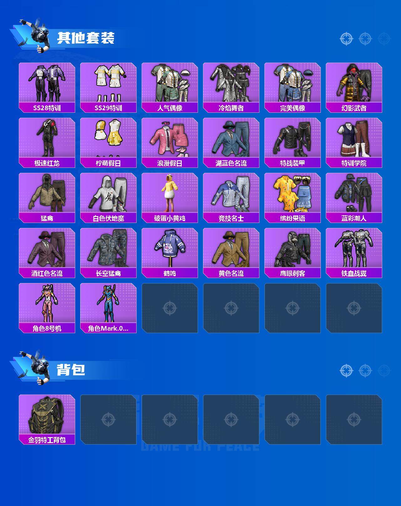 - [11681350]3粉装 9特效枪 1载具 8印记 可二次 可修改实名 身法装备:舞王派对(派对舞王、小金鞋),Mark.06(新蓝螳螂) 优质装备:玛莎拉蒂Quattroporte(夜幕蓝),舞王派对(派对舞王、小金鞋),AKM炫紫旋律,M416心之恋语,SPAS-12音爆索尼克,SCAR-L-锦绣绵绵,七级SPAS-12-音爆索尼克,AUG-暖羊咩咩,樱桃泡泡,MK14-樱桃泡泡,绯穹魔姬,Vector-绯穹魔姬,Kar98K-巳巳如意 热门装扮:创世·救赎,派对舞王(小金鞋) 稀有枪皮:DP-28-豹影疾电 五级特效枪:五级M416-心之恋语,五级Kar98K-巳巳如意,五级AUG-暖羊咩咩,五级MK14-樱桃泡泡,五级SCAR-L-锦绣绵绵 四级特效枪:四级AKM-炫紫旋律,四级Vector-绯穹魔姬,四级DP-28-豹影疾电 紫色装扮:SS22特训,SS23特训,幻彩翩翩,妙红点点,SS31特训套装,冷焰舞者,SS30特训套装,云朵鹅,雪绒豹,SS33特训套装,酒红色名流,长空猛禽,霓虹街区,缤纷果语,荣耀,绛羽幽主,飞行日记,魅力单车,鹤鸣,龟仙人,冰河战士,龙魂突击队,蝶变,香桃花海,柠萌假日,沙漠兵团,海岛探路者,涂山之恋,绮丽涂鸦,破蛋小黄鸡,甜蜜告白,空岛之星,王牌教练,灰色格斗者,猛禽,雏菊兔兔,萝兰蝴蝶,SS29特训,纯真浪花,热情海星,SS28特训,Mark.06(新蓝螳螂),鱼渊荷华,燕燕于飞,巳巳如意,青团波波,糖糖葫芦,棉花软糖,竞技名士,摩登魅猫,街头风暴,许七安,神气柴柴,懵萌河马,SS24特训(SS24特训套装),SS25特训,粉红小猪,焰鹰斗篷,幻羽潜行,幽夜迷踪,SS27特训,无暇誓言,蝶吟花词,SS26特训,春光漫游,快闪甜心,智谋强哥,大橘大利,星渊小夜曲,粉恋花,蓝冰羽,紫幽梦,SS32特训服(SS32特训套装),猎影月神,瑰梦爱神,恋语绒绒,双彩圣灵,漫步者,冰冻风暴,光之冒险 优质战备:圣堂之誓降落伞,星之彼岸降落伞,镜域双华降落伞,猪猪侠降落伞,绯穹魔姬降落伞,赛博古神降落伞,智耀战神降落伞,音爆索尼克降落伞,第五大道降落伞