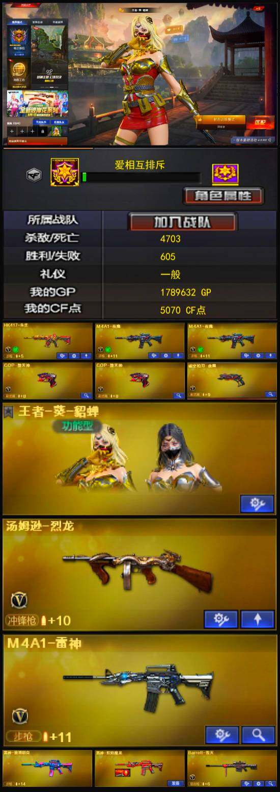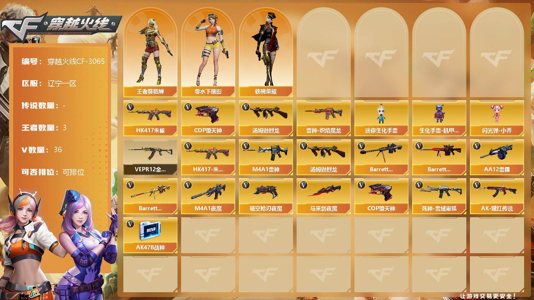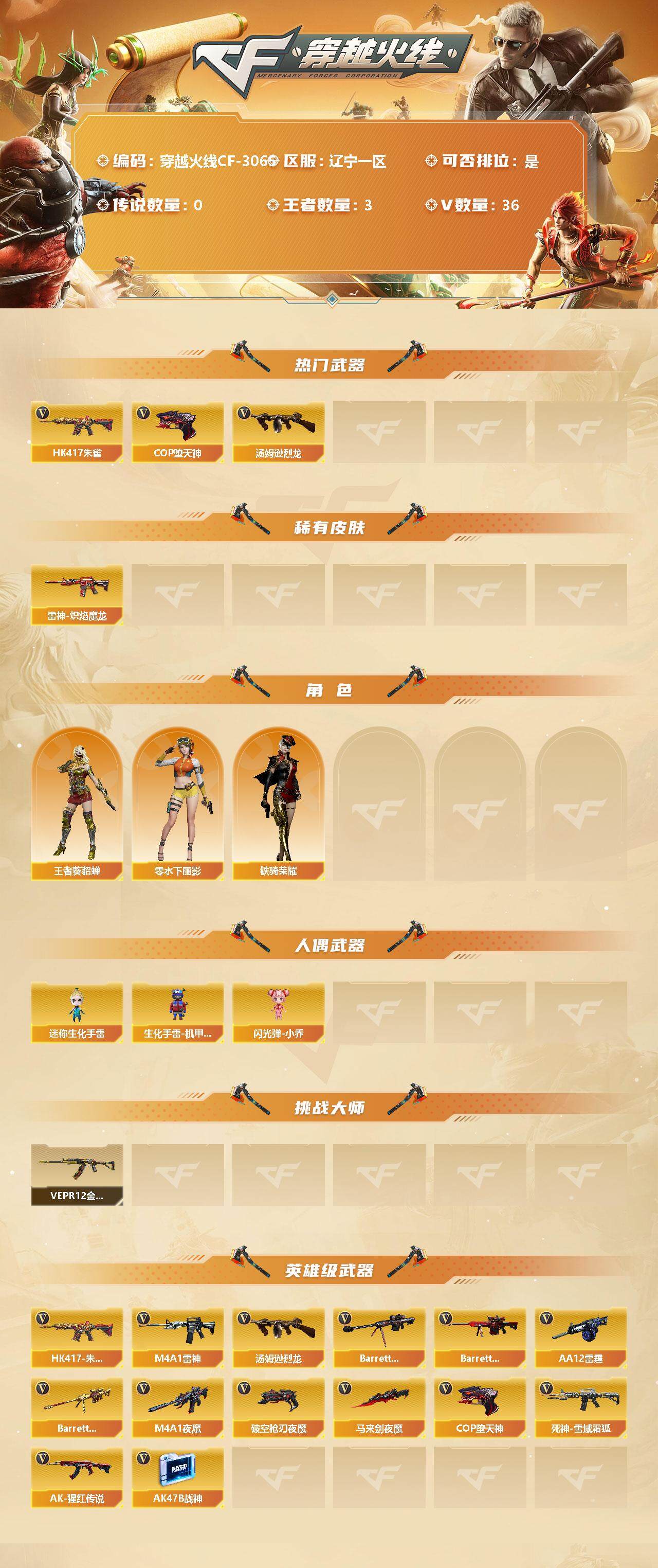 [13012244]辽宁一区-36V-3王者-0炫金 【热门武器】:HK417-朱雀,汤姆逊-烈龙,COP-堕天神*2 【皮肤】:雷神-炽焰魔龙 【角色】:王者-葵-貂蝉,零-水下丽影,铁骑荣耀 【人偶武器】:迷你生化手雷,生化手雷-机甲核心,闪光弹-小乔 【挑战大师】:VEPR-12-金魔 【英雄级武器】:M4A1-雷神,HK417-朱雀,M4A1-夜魔*2,死神-雪域霜狐,AK-47-猩红传说*5,AK47-B-战神,Barrett-毁灭,Barrett-极光,Barrett-朱雀,汤姆逊-烈龙,AA-12-雷霆,COP-堕天神*2,破空枪刃-夜魔,马来剑-夜魔 【特殊枪械】:1烈龙