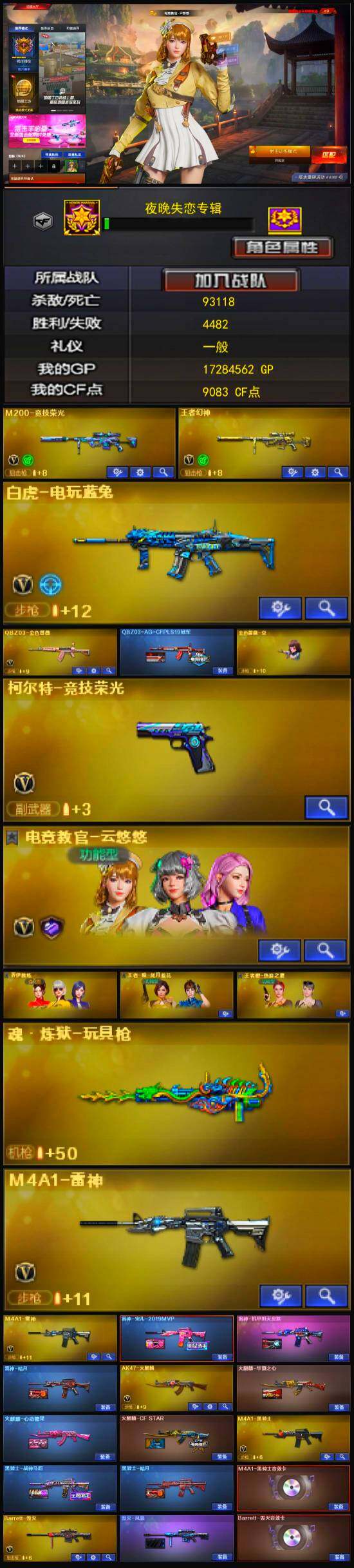 - [12432041]【商品标题】:上海一区-48V-2王者-2炫金 【热门武器】:QBZ03-金色蔷薇,M200-幻神,M4A1-黑骑士,加特林-炼狱,COP-堕天神,沙鹰-修罗 【王者炫金武器】:炫金火麒麟,炫金黑龙 【音效卡】:M200-幻神音效卡,M4A1-黑骑士音效卡,绝迹语音包 【稀有皮肤】:幻神-AG-CFPLS17冠军,雷神-荣耀之魄,雷神-杨戬,火麒麟-平天大圣,黑骑士-冠军之势,毁灭-星空 【角色】:王者-魅影,蜀雪,迷迭香,职业选手,甜心偶像 【人偶武器】:巴雷特-零-水下丽影,AWM-灵狐-15周年嘉年华,M4A1-雷神-精英刀锋,迷你艾比,迷你超能女侍,夺魂,迷你生化手雷,闪光弹-小乔,闪光弹-貂蝉,高爆手雷-大乔 【挑战大师】:神圣爆裂者-末日III*2,激光毁灭者III 【英雄级武器】:COP-堕天神,麒麟刺-堕天神*2,龙啸-堕天神*2,QBZ03-金色蔷薇,无影-神兵利器,M4A1-雷神,M4A1-黑龙,M4A1-黑骑士,加特林-炼狱,Barrett-毁灭,M200-幻神,黑武士-锦绣游龙,AK-47-猩红传说,AK47-B-战神,AK47-B-常胜将军*2,M4A1-赤狱骑士,沙鹰-天神,沙鹰-修罗,屠龙*2 【特殊枪械】:1黑骑士,1炼狱
