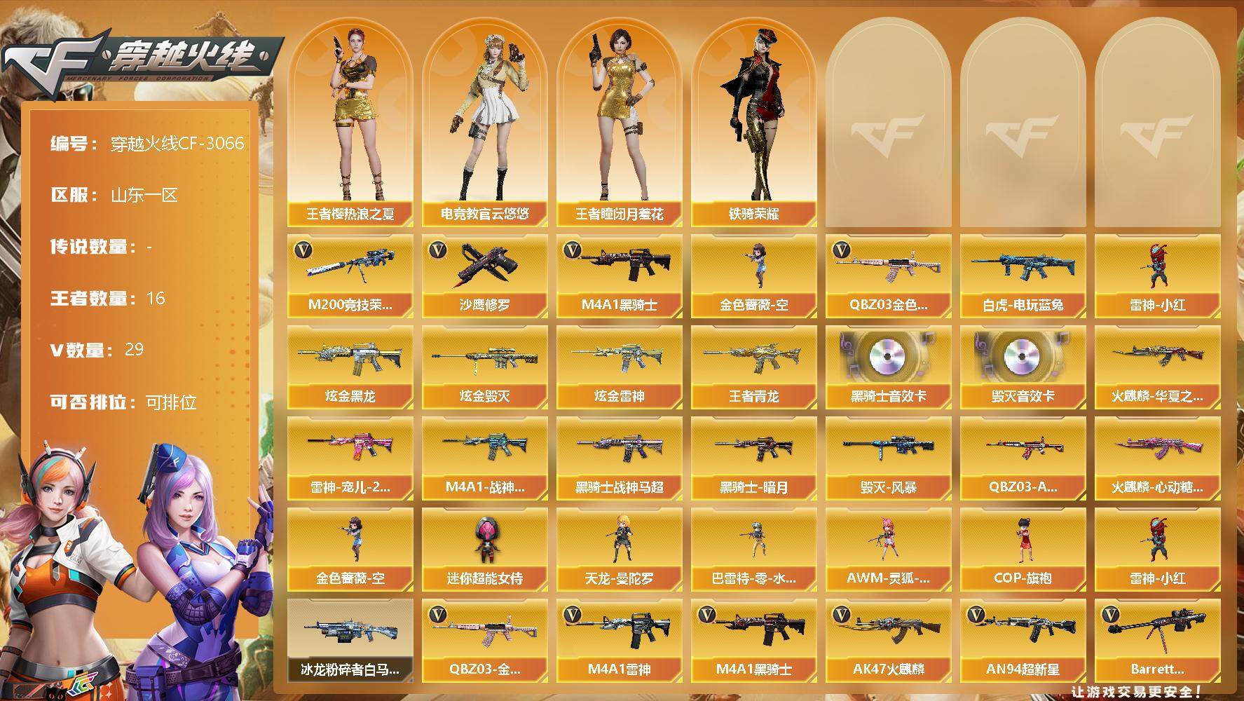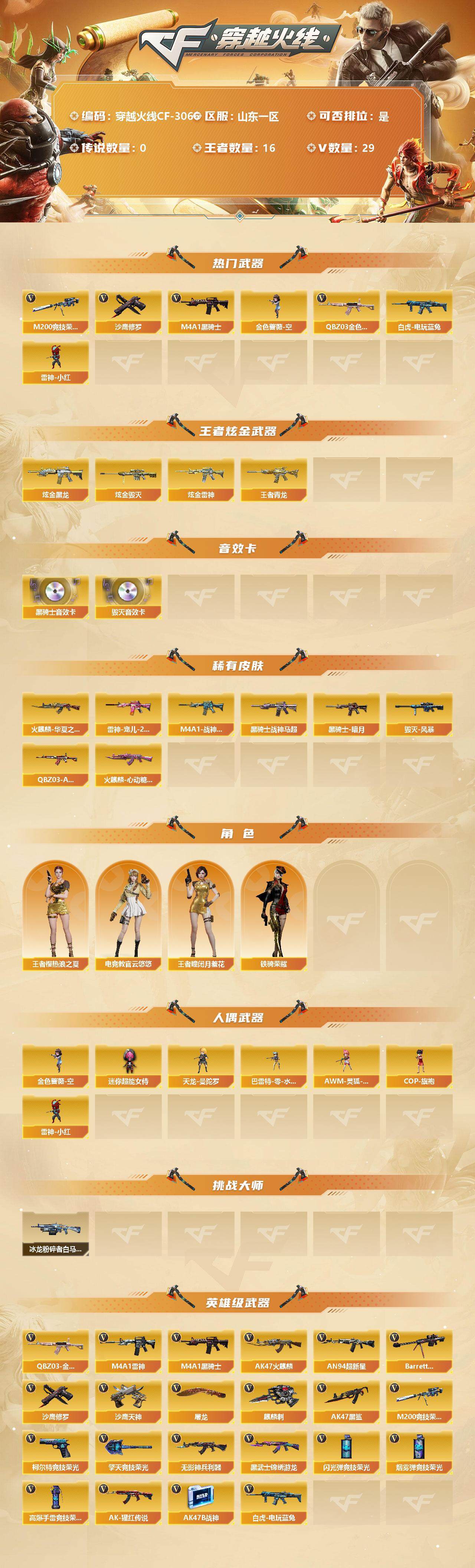 [13012697]山东一区-29V-16王者-3炫金 【热门武器】:QBZ03-金色蔷薇,M200-竞技荣光,白虎-电玩蓝兔,M4A1-黑骑士,金色蔷薇-空,雷神-小红,沙鹰-修罗 【王者炫金武器】:王者青龙,炫金黑龙,炫金毁灭,炫金雷神 【音效卡】:M4A1-黑骑士音效卡,Barrett-毁灭音效卡 【皮肤】:QBZ03-AG-CFPLS19冠军,雷神-暗月,M4A1-战神赵云,雷神-宠儿-2019MVP,雷神-机甲刑天皮肤,火麒麟-华夏之心,火麒麟-心动糖果,毁灭-风暴,黑骑士-暗月,黑骑士-战神马超,战神-紫绶金章皮肤,AK47-B-常胜将军-曹操,AK47-B-常胜将军-刘备*2 【角色】:电竞教官-云悠悠,王者-瞳-闭月羞花,王者樱-热浪之夏,铁骑荣耀 【人偶武器】:雷神-小红,天龙-曼陀罗,巴雷特-零-水下丽影,金色蔷薇-空,AWM-灵狐-15周年嘉年华,COP-旗袍,迷你超能女侍 【挑战大师】:冰龙粉碎者-白马银枪 【英雄级武器】:AK47-火麒麟,M4A1-雷神*2,M4A1-黑骑士,AN94-超新星,AK47-黑鲨,无影-神兵利器,黑武士-锦绣游龙,QBZ03-金色蔷薇,AK-47-猩红传说*3,AK47-B-战神,白虎-电玩蓝兔,Barrett-毁灭,M200-竞技荣光,王者幻神-觉醒版,沙鹰-修罗,沙鹰-天神,柯尔特-竞技荣光,屠龙,麒麟刺,擎天-竞技荣光,王者之刺-觉醒版,高爆手雷-竞技荣光,高爆手雷-雷霆王者*2,闪光弹-竞技荣光,烟雾弹-竞技荣光 【特殊枪械】:1黑骑士