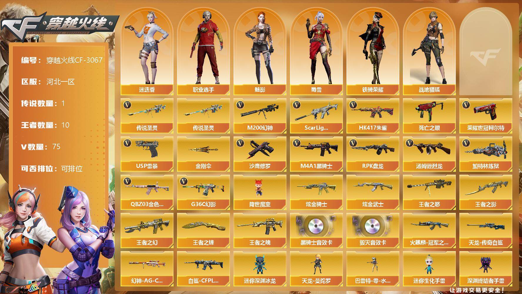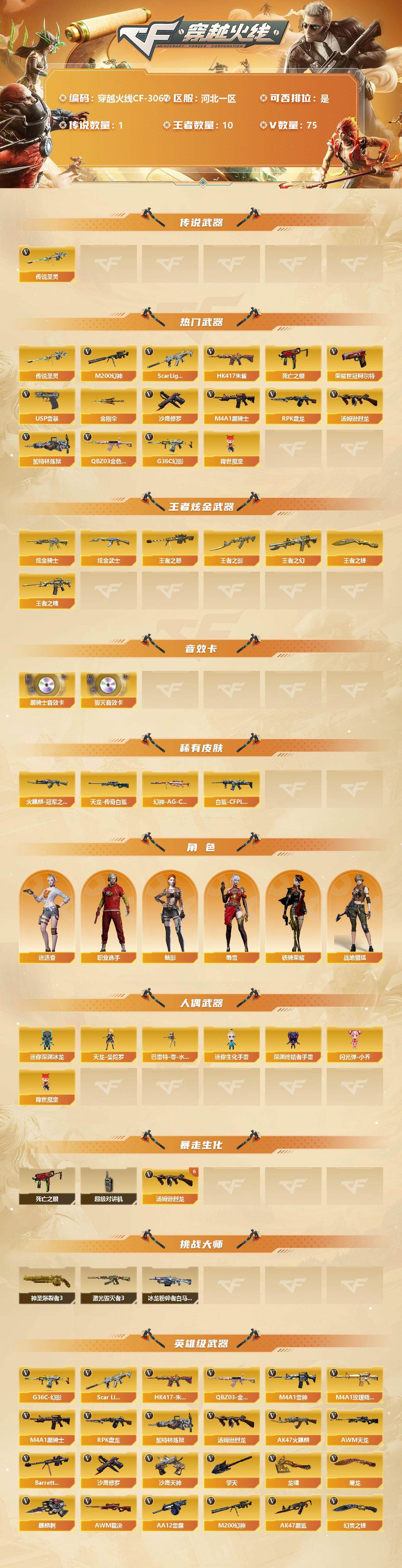 [13012954]河北一区-75V-10王者-3炫金 【传说武器】:传说圣灵 【热门武器】:传说圣灵,G36C-幻影,QBZ03-金色蔷薇,Scar Light-白虎,HK417-朱雀,M200-幻神,死亡之眼,荣耀世冠-柯尔特,M4A1-黑骑士*4,汤姆逊-烈龙*6,RPK-盘龙*3,加特林-炼狱,降世魔童,USP-雷暴,沙鹰-修罗*4,金刚伞 【王者炫金武器】:王者之幻,王者之影,王者之魄,王者之怒,王者之锋,炫金骑士*2,炫金武士 【音效卡】:M4A1-黑骑士音效卡,Barrett-毁灭音效卡 【皮肤】:幻神-AG-CFPL S24冠军 皮肤,白虎-白鲨-CFPLS23冠军,裁决-巅峰荣耀 皮肤,火麒麟-冠军之心,黑龙-能量核心,战神-粉色甜心皮肤,战神-紫绶金章皮肤*2,战神-流金岁月皮肤*2,AWM-天龙-传奇白鲨,极光-能量核心 【角色】:魅影,迷迭香,战地猎狐,蜀雪,铁骑荣耀,职业选手 【人偶武器】:天龙-曼陀罗,巴雷特-零-水下丽影,降世魔童,迷你深渊冰龙,迷你生化手雷,深渊终结者手雷,闪光弹-小乔 【暴走生化】:死亡之眼,超级对讲机 【挑战大师】:神圣爆裂者III,冰龙粉碎者-白马银枪,激光毁灭者III 【英雄级武器】:AK47-火麒麟,M4A1-雷神*2,M4A1-黑骑士*4,AK47-黑鲨,HK417-朱雀,Scar Light-白虎,G36C-幻影,M4A1-玫瑰精灵,QBZ03-金色蔷薇,AK-47-猩红传说*6,AK47-B-战神,AWM-天龙,Barrett-毁灭*2,AWM-裁决,M200-幻神,王者幻神-觉醒版,RPK-盘龙*3,加特林-炼狱,汤姆逊-烈龙*6,AA-12-雷霆,沙鹰-修罗*4,沙鹰-天神,USP-雷暴,荣耀世冠-柯尔特,屠龙*3,龙啸*2,麒麟刺-堕天神,擎天,麒麟刺*2,幻灵之锋,斩神刀-雷暴,王者之击-觉醒版,高爆手雷-雷霆,高爆手雷-雷暴,高爆手雷-堕天神,高爆手雷-幻灵,闪光弹-雷霆,闪光弹-雷暴,闪光弹-堕天神,闪光弹-幻灵*2,烟雾弹-雷霆,烟雾弹-雷暴,烟雾弹-堕天神,烟雾弹-幻灵,M4A1-赤狱骑士 【特殊枪械】:1白虎,4黑骑士,6烈龙,3盘龙,1炼狱