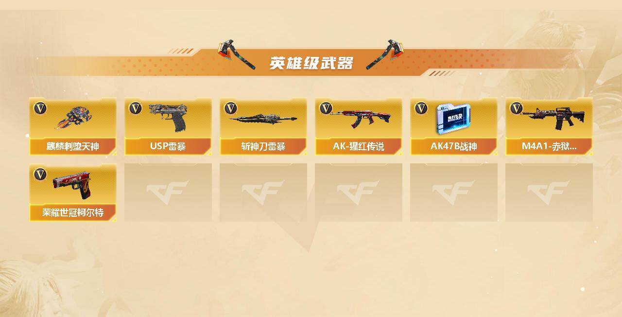 【英雄级武器】:AK47-火麒麟,M4A1-雷神*2,M4A1-黑骑士*4,AK47-黑鲨,HK417-朱雀,Scar Light-白虎,G36C-幻影,M4A1-玫瑰精灵,QBZ03-金色蔷薇,AK-47-猩红传说*6,AK47-B-战神,AWM-天龙,Barrett-毁灭*2,AWM-裁决,M200-幻神,王者幻神-觉醒版,RPK-盘龙*3,加特林-炼狱,汤姆逊-烈龙*6,AA-12-雷霆,沙鹰-修罗*4,沙鹰-天神,USP-雷暴,荣耀世冠-柯尔特,屠龙*3,龙啸*2,麒麟刺-堕天神,擎天,麒麟刺*2,幻灵之锋,斩神刀-雷暴,王者之击-觉醒版,高爆手雷-雷霆,高爆手雷-雷暴,高爆手雷-堕天神,高爆手雷-幻灵,闪光弹-雷霆,闪光弹-雷暴,闪光弹-堕天神,闪光弹-幻灵*2,烟雾弹-雷霆,烟雾弹-雷暴,烟雾弹-堕天神,烟雾弹-幻灵,M4A1-赤狱骑士