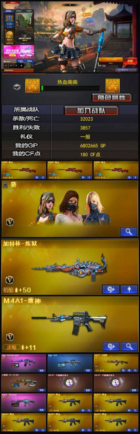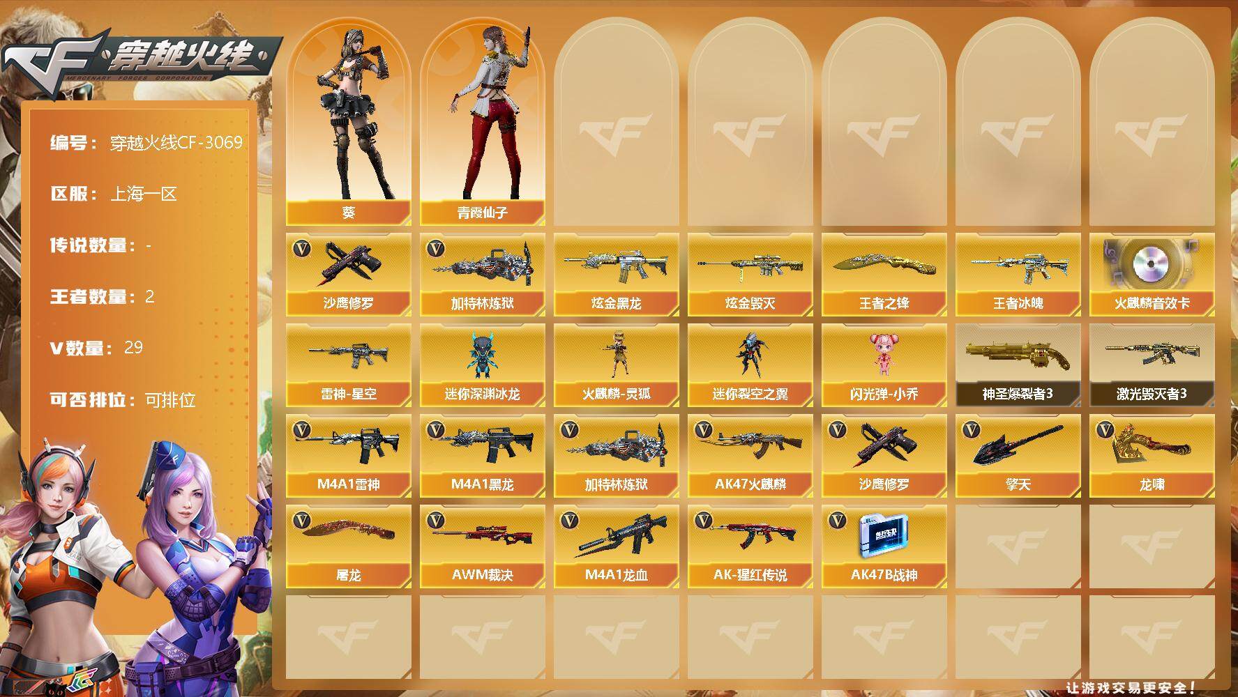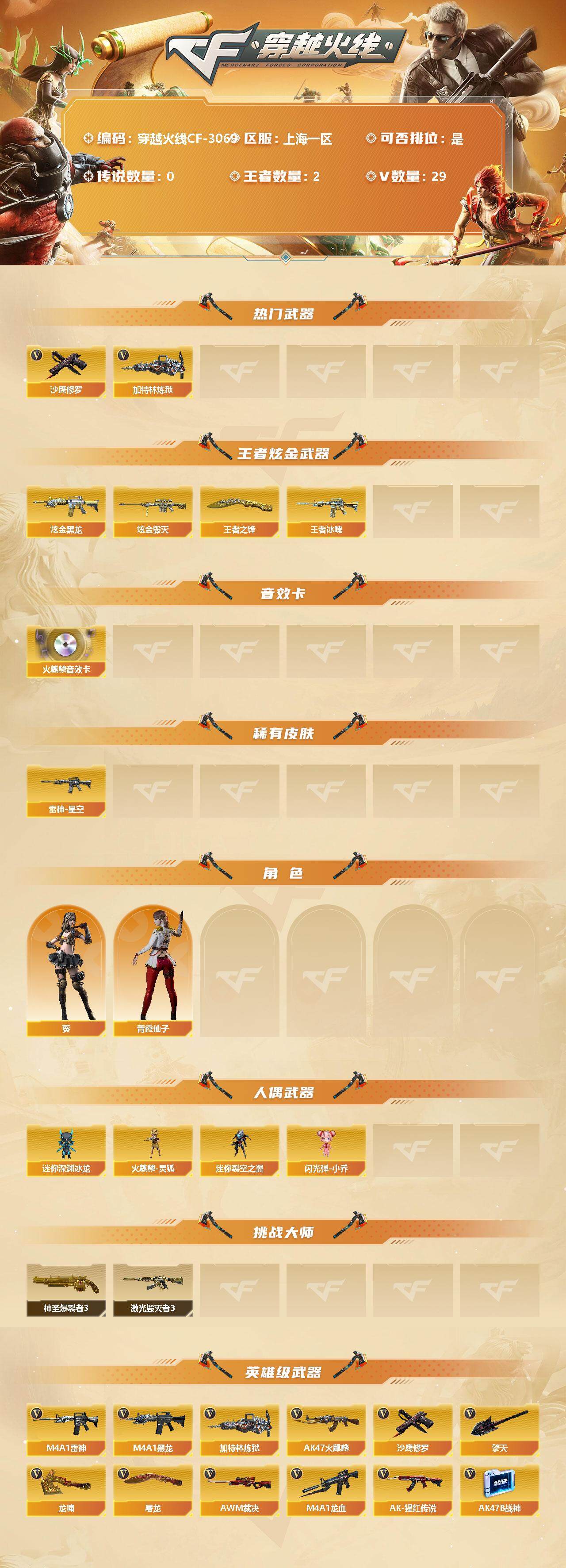 [13013495]上海一区-29V-2王者-2炫金 【热门武器】:加特林-炼狱,沙鹰-修罗 【王者炫金武器】:王者冰魄,王者之锋,炫金黑龙,炫金毁灭 【音效卡】:AK47-火麒麟音效卡*2 【皮肤】:雷神-星空,雷神-机甲刑天皮肤,战神-粉色甜心皮肤,战神-紫绶金章皮肤*3,战神-流金岁月皮肤 【角色】:葵,青霞仙子 【人偶武器】:火麒麟-灵狐*2,迷你深渊冰龙,迷你裂空之翼*2,闪光弹-小乔 【挑战大师】:神圣爆裂者III,激光毁灭者III 【英雄级武器】:AK47-火麒麟,M4A1-黑龙*5,M4A1-雷神,M4A1-龙血*2,AK-47-猩红传说*5,AK47-B-战神,AWM-裁决*3,加特林-炼狱,沙鹰-修罗,屠龙,龙啸,擎天*3 【特殊枪械】:1炼狱
