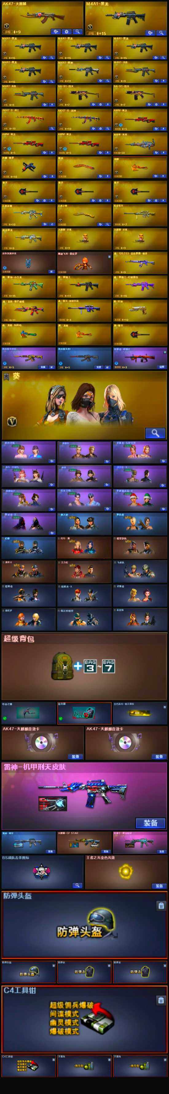 【英雄级武器】:AK47-火麒麟,M4A1-黑龙*5,M4A1-雷神,M4A1-龙血*2,AK-47-猩红传说*5,AK47-B-战神,AWM-裁决*3,加特林-炼狱,沙鹰-修罗,屠龙,龙啸,擎天*3