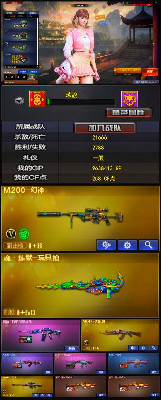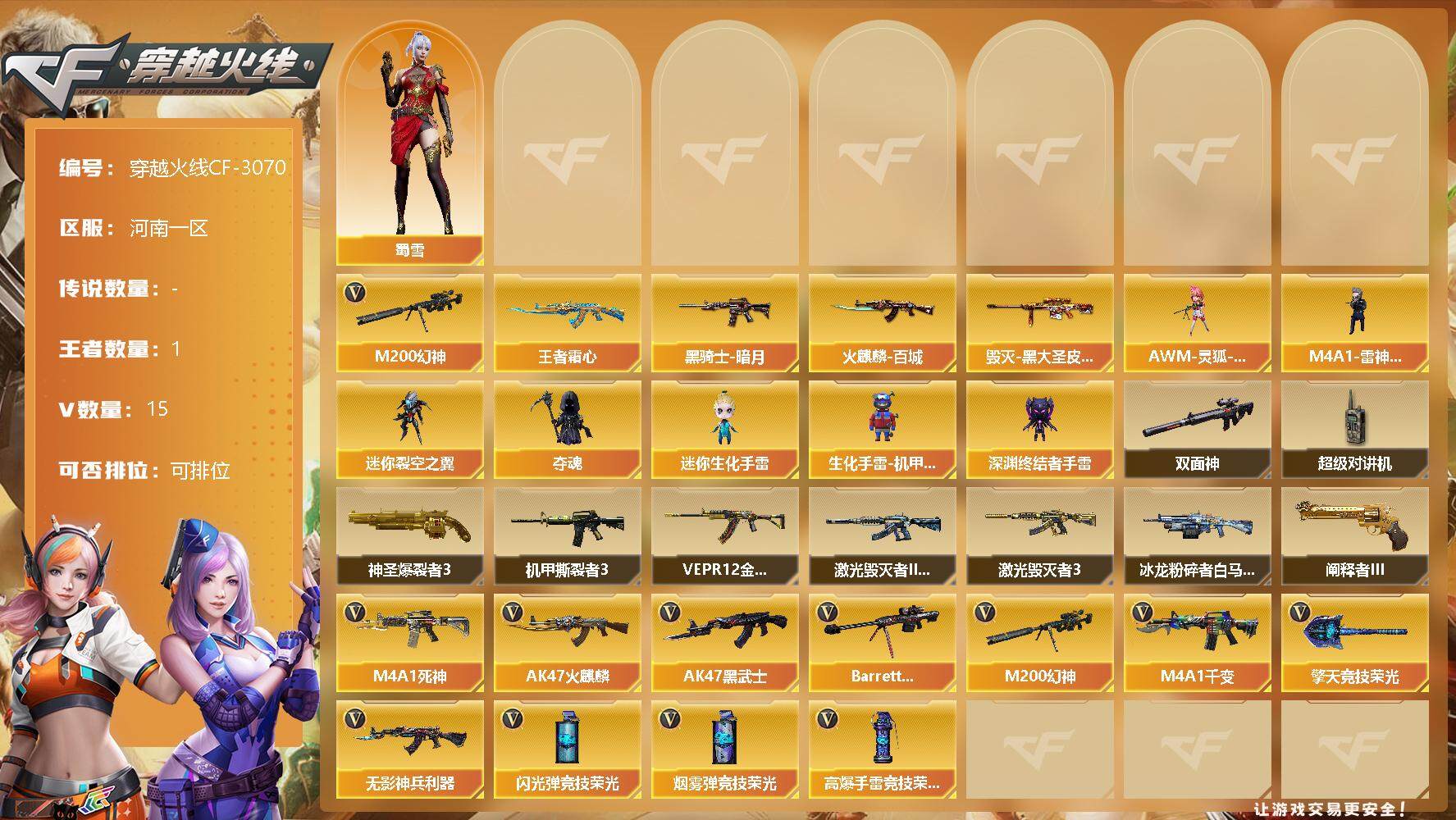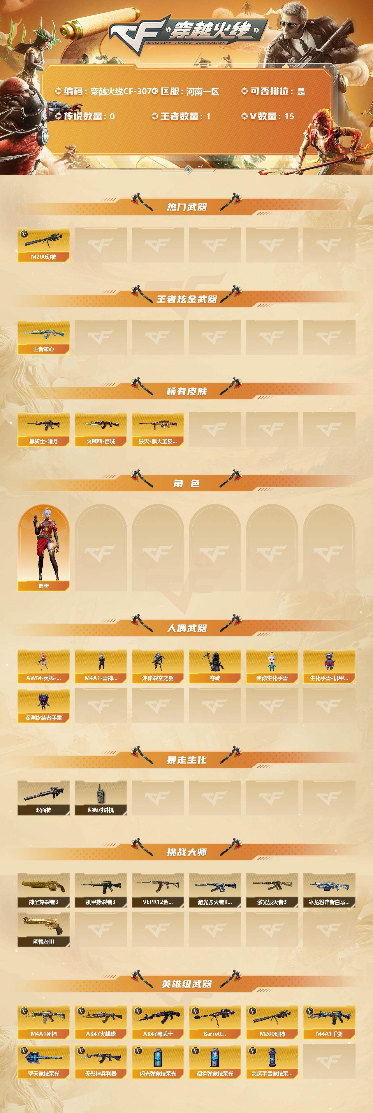 [13013652]河南一区-15V-1王者-0炫金 【热门武器】:M200-幻神 【王者炫金武器】:王者霜心 【皮肤】:雷神-机甲刑天皮肤,火麒麟-百城,毁灭-黑大圣皮肤*2,黑骑士-暗月,极光-能量核心 【角色】:蜀雪 【人偶武器】:M4A1-雷神-精英刀锋,AWM-灵狐-15周年嘉年华,迷你裂空之翼*3,夺魂,迷你生化手雷*2,生化手雷-机甲核心,深渊终结者手雷 【暴走生化】:双面神,超级对讲机 【挑战大师】:神圣爆裂者III*2,冰龙粉碎者-白马银枪*3,激光毁灭者III-白马银枪,VEPR-12-金魔,激光毁灭者III*5,机甲撕裂者III,阐释者III*3 【英雄级武器】:M4A1-千变,AK47-火麒麟,M4A1-死神,AK47-黑武士,无影-神兵利器,Barrett-毁灭,M200-幻神,擎天-竞技荣光,高爆手雷-竞技荣光*2,闪光弹-竞技荣光*2,烟雾弹-竞技荣光*2 【特殊枪械】:
