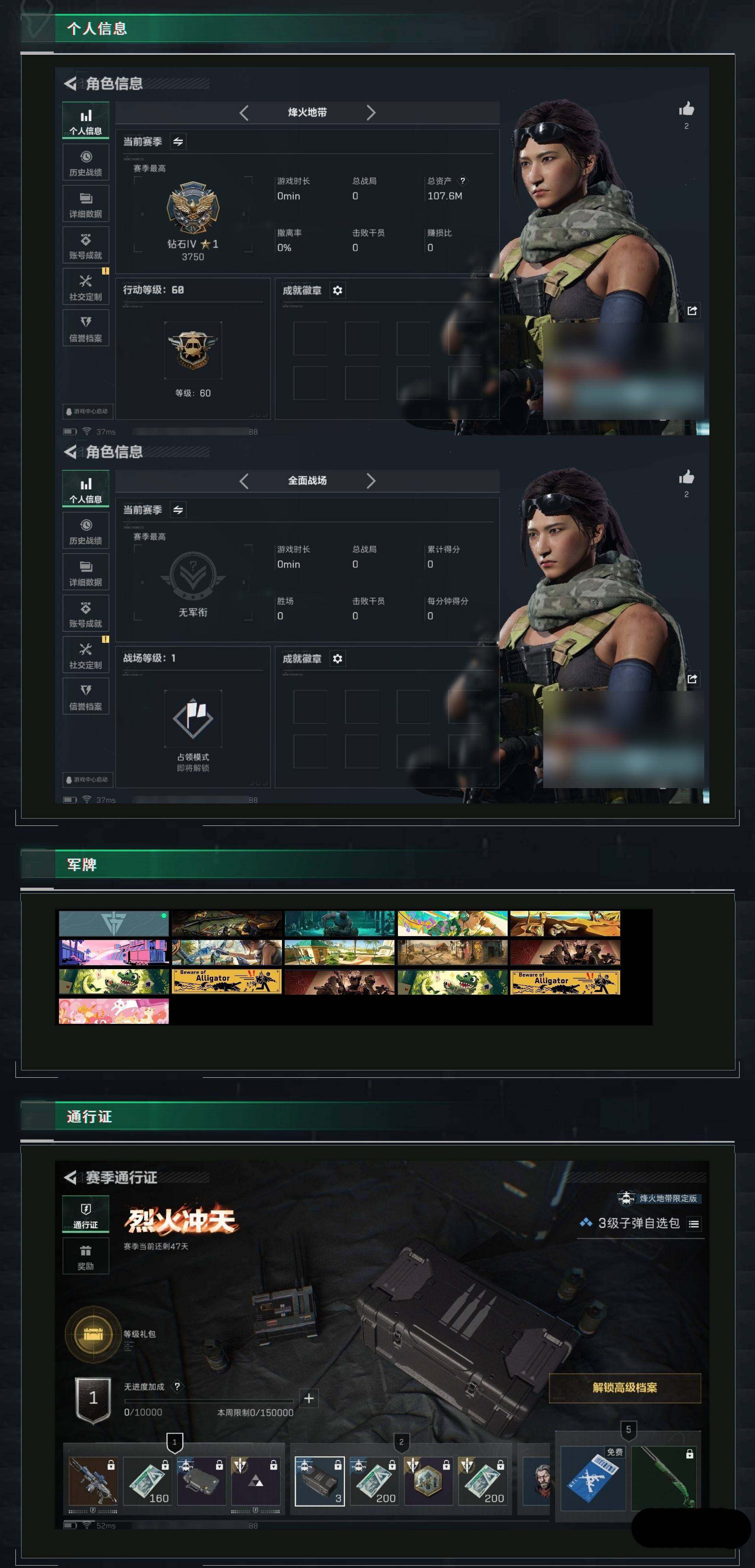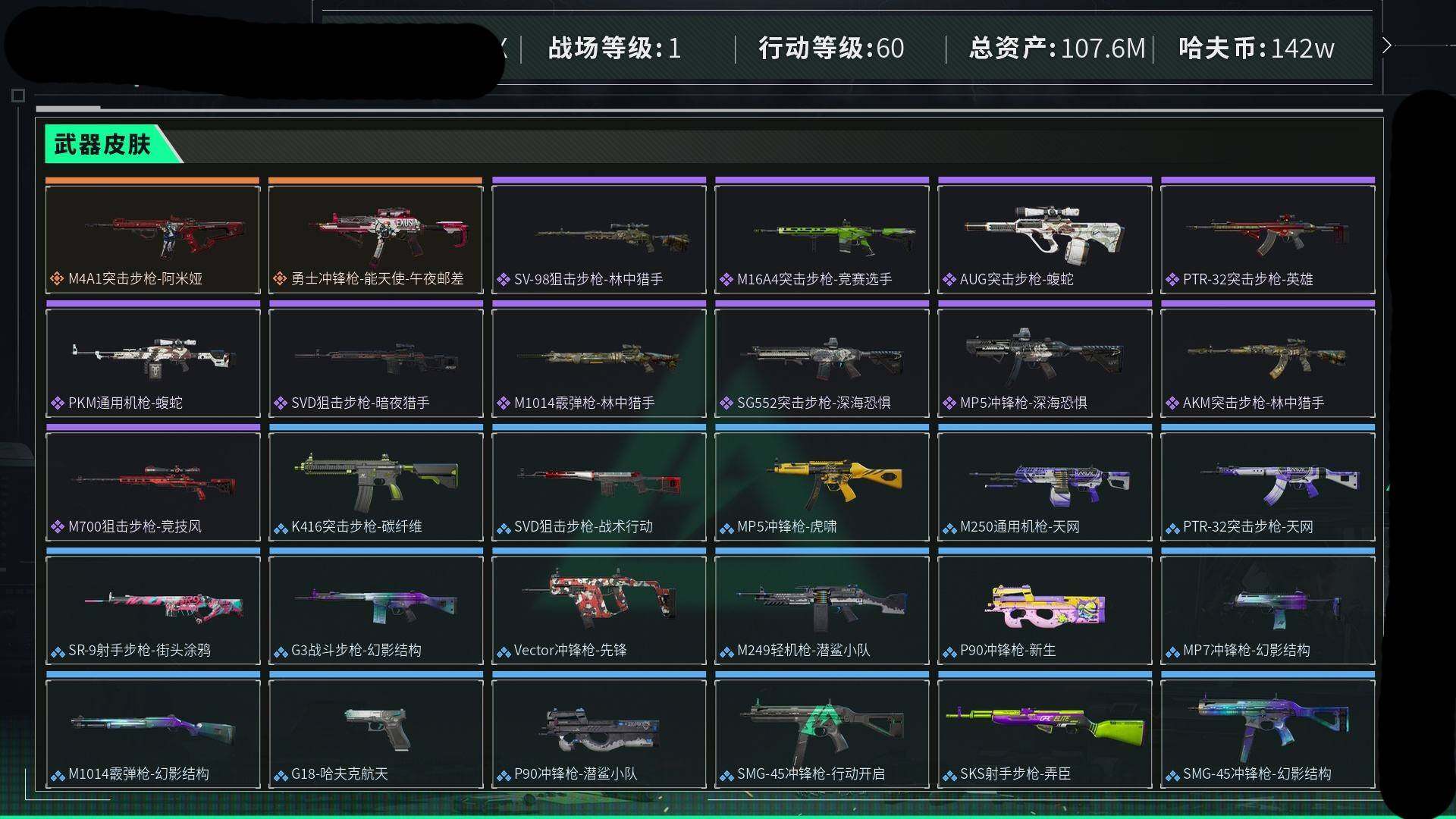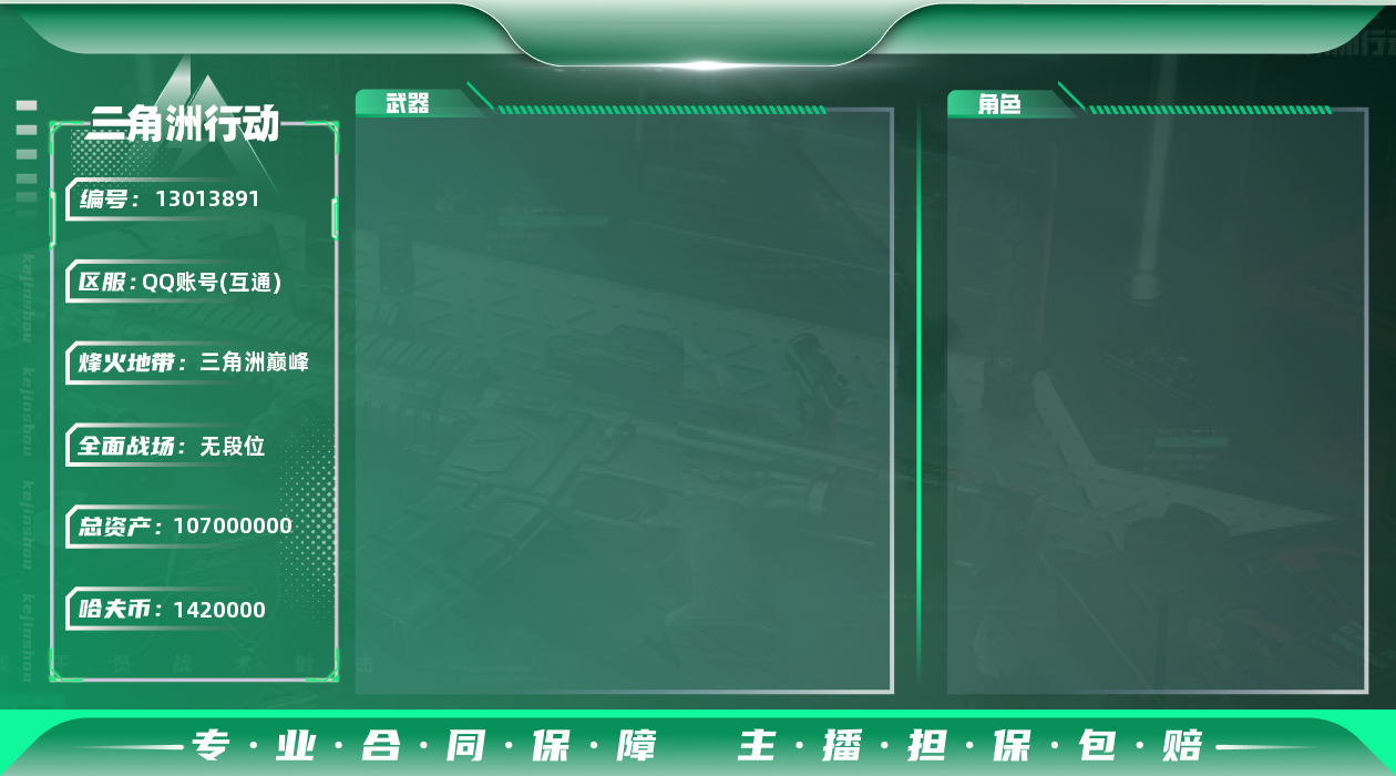 [13013891]汤79825 总资产107M,哈夫币142w,枪皮数量68,战场等级:1 无军衔,行动等级:60 钻石,近战-黑鹰,安全箱等时效性道具请以游戏内数据为准;详情请看图【个人信息】战场等级:1 无军衔,行动等级:60 钻石【哈夫币】142w【总资产】107M【烽火地带专区】总资产100M-150M【货币】0三角币/0曼德尔币/320三角券【安全箱】基础安全箱2(1x2)/进阶安全箱4(2x2)【通行证】通行证免费版【特勤处】制药台Lv.3/工作台Lv.3/仓库Lv.9/防具台Lv.3/训练中心Lv.6/靶场Lv.6/技术中心Lv.3/指挥中心Lv.6/潜水中心Lv.1/收藏室Lv.0【近战皮肤】近战-黑鹰/【步枪皮肤】AUG突击步枪-蝮蛇/SG552突击步枪-深海恐惧/AKM突击步枪-林中猎手/PTR-32突击步枪-英雄/M16A4突击步枪-竞赛选手/M4A1突击步枪-阿米娅/【冲锋枪皮肤】MP5冲锋枪-深海恐惧/勇士冲锋枪-能天使-午夜邮差/【霰弹枪皮肤】M1014霰弹枪-林中猎手/【轻机枪皮肤】PKM通用机枪-蝮蛇/【狙击步枪皮肤】M700狙击步枪-竞技风/SVD狙击步枪-暗夜猎手/SV-98狙击步枪-林中猎手/【挂饰】演出导演/重装记者/挂饰-彩蛋/乐队纪念/阿萨拉盾兵/阿萨拉霰弹兵/阿萨拉狙击兵/挂饰-阿米娅/阿萨拉徽章/(典藏皮肤颜色请以典藏展示为准,安全箱等时效性道具请以游戏内数据为准)