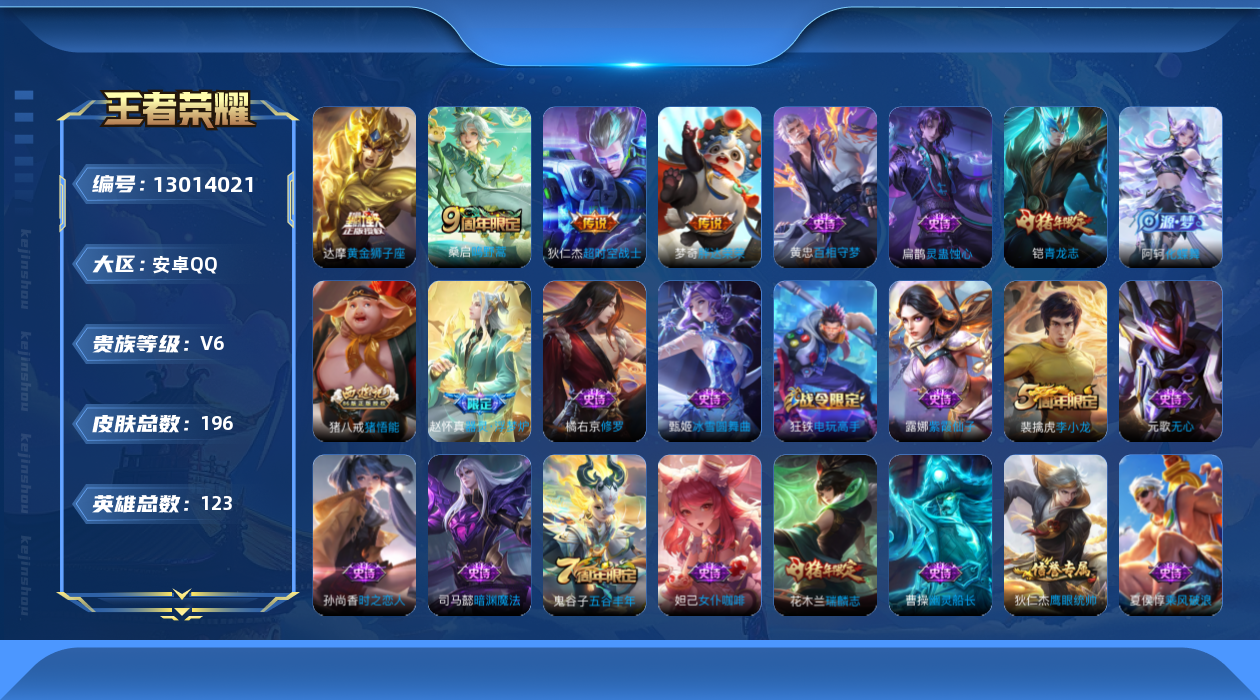 [13014021]安卓Q-V6-永恒钻石I段位-123英雄-196皮肤-0典藏-0珍品无双-0无双-0珍品传说-4传说-53史诗