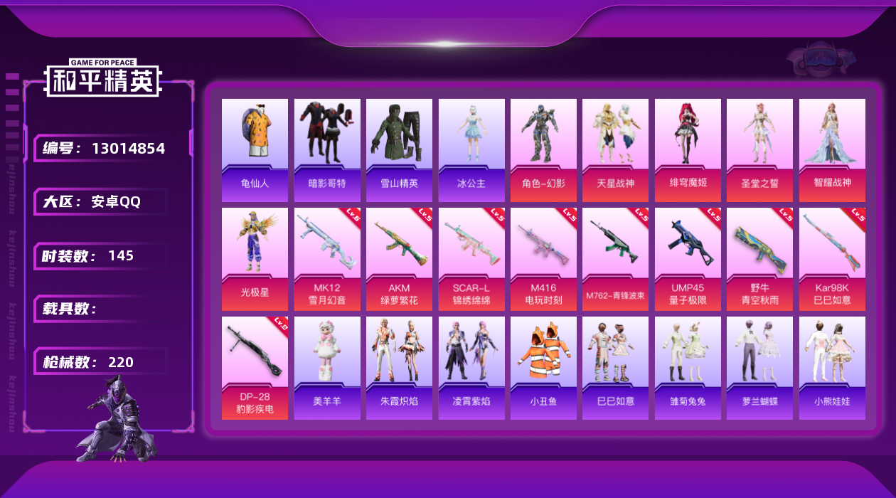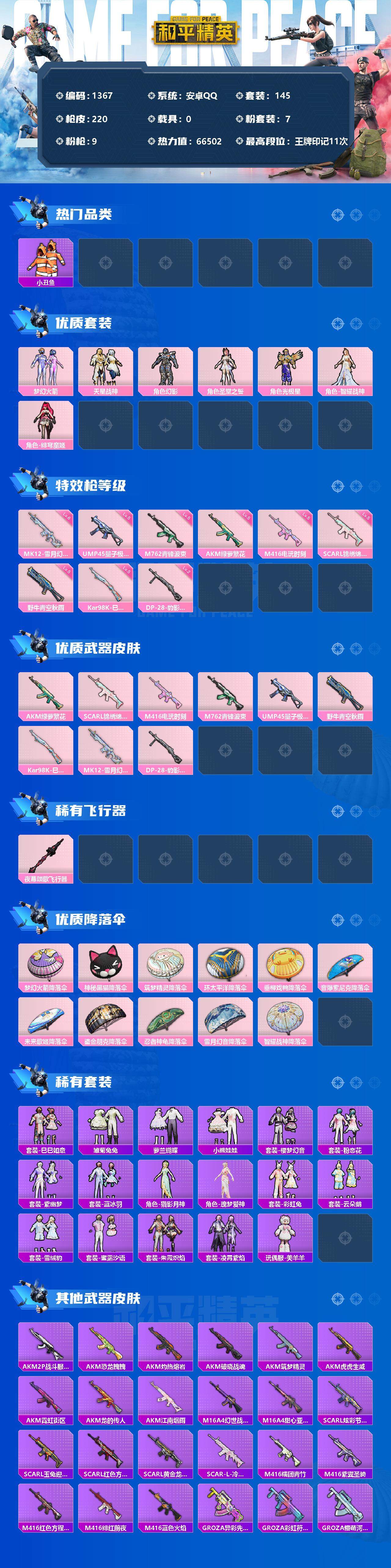 [13014854]安卓 手Q-7粉装-9特效枪-0载具-2粉色飞行器-66502热力值-11王牌印记-145套装-220枪皮 【热门品类】:粉装-梦幻火箭,套装-深海小丑鱼,套装-小丑鱼,套装-奇异狩猎者,套装-龟仙人,套装-暗影哥特 【粉色套装】:粉装-梦幻火箭,粉装-天星战神,角色-幻影,角色-圣堂之誓,角色-光极星,角色-智耀战神,角色-绯穹魔姬 【粉色枪皮等级】:AKM-绿萝繁花(五级),SCAR-L-锦绣绵绵(五级),M416-电玩时刻(五级),M762-青锋波束(五级),UMP45-量子极限(五级),野牛-青空秋雨(五级),Kar98K-巳巳如意(五级),MK12-雪月幻音(六级),DP-28-豹影疾电(二级) 【粉色枪皮】:AKM-绿萝繁花,SCAR-L-锦绣绵绵,M416-电玩时刻,M762-青锋波束,UMP45-量子极限,野牛-青空秋雨,Kar98K-巳巳如意,MK12-雪月幻音,DP-28-豹影疾电 【粉色飞行器】:夜幕颂歌飞行器 【粉色降落伞】:梦幻火箭降落伞,神秘黑猫降落伞,筑梦精灵降落伞,环太平洋降落伞,垂柳戏鸭降落伞,音爆索尼克降落伞,未来歌姬降落伞,鎏金朋克降落伞,忍者神龟降落伞,雪月幻音降落伞,智耀战神降落伞 【稀有套装】:套装-龟仙人,套装-巳巳如意,套装-雏菊兔兔,套装-萝兰蝴蝶,套装-小熊娃娃,套装-樱梦幻音,套装-粉恋花,套装-紫幽梦,套装-蓝冰羽,角色-猎影月神,角色-瑰梦爱神,套装-彩虹兔,套装-云朵鹅,套装-雪绒豹,套装-蜜露汐语,套装-朱霞炽焰,套装-凌霄紫焰,玩偶服-美羊羊 【稀有枪皮】:AKM-2P战斗服款,AKM-恐龙拽拽,AKM-江南烟雨,AKM-灼热熔岩,AKM-破晓战魂,AKM-筑梦精灵,AKM-虎虎生威,AKM-霓虹街区,AKM-龙的传人,M16A4-幻世战舞者,M16A4-甜心亚梦,SCAR-L-炫彩节奏,SCAR-L-玉兔迎春,SCAR-L-红色方程式,SCAR-L-黄金龙骨,SCAR-L-冷漠罗丽,M416-糯团青竹,M416-紫翼圣骑,M416-红色方程式,M416-绯红前夜,M416-蓝色火焰,GROZA-异彩先驱,GROZA-彩虹符号,GROZA-懵萌河马,AUG-耀粉歌者,QBZ-彩虹符号,QBZ-未来歌姬,QBZ-飞驰魅影,M762-天星战神,M762-天降萌叽,M762-橘柚倾心,M762-绯红前夜,M