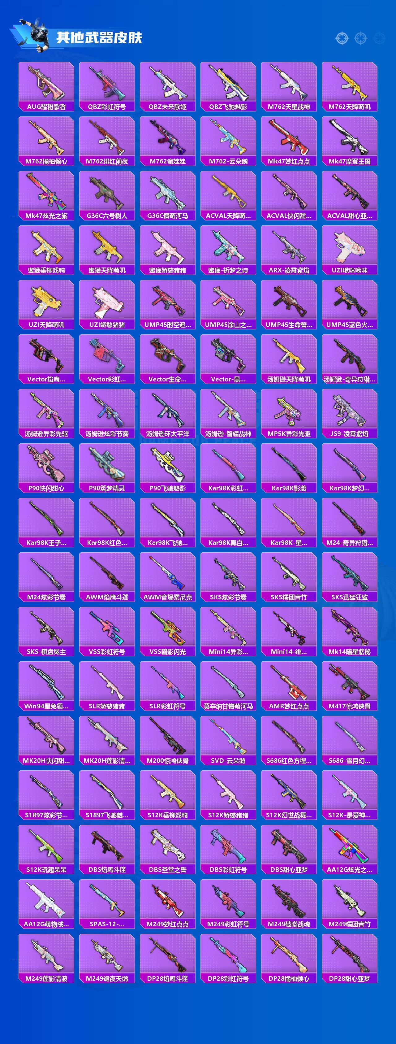 【稀有枪皮】:AKM-2P战斗服款,AKM-恐龙拽拽,AKM-江南烟雨,AKM-灼热熔岩,AKM-破晓战魂,AKM-筑梦精灵,AKM-虎虎生威,AKM-霓虹街区,AKM-龙的传人,M16A4-幻世战舞者,M16A4-甜心亚梦,SCAR-L-炫彩节奏,SCAR-L-玉兔迎春,SCAR-L-红色方程式,SCAR-L-黄金龙骨,SCAR-L-冷漠罗丽,M416-糯团青竹,M416-紫翼圣骑,M416-红色方程式,M416-绯红前夜,M416-蓝色火焰,GROZA-异彩先驱,GROZA-彩虹符号,GROZA-懵萌河马,AUG-耀粉歌者,QBZ-彩虹符号,QBZ-未来歌姬,QBZ-飞驰魅影,M762-天星战神,M762-天降萌叽,M762-橘柚倾心,M762-绯红前夜,M