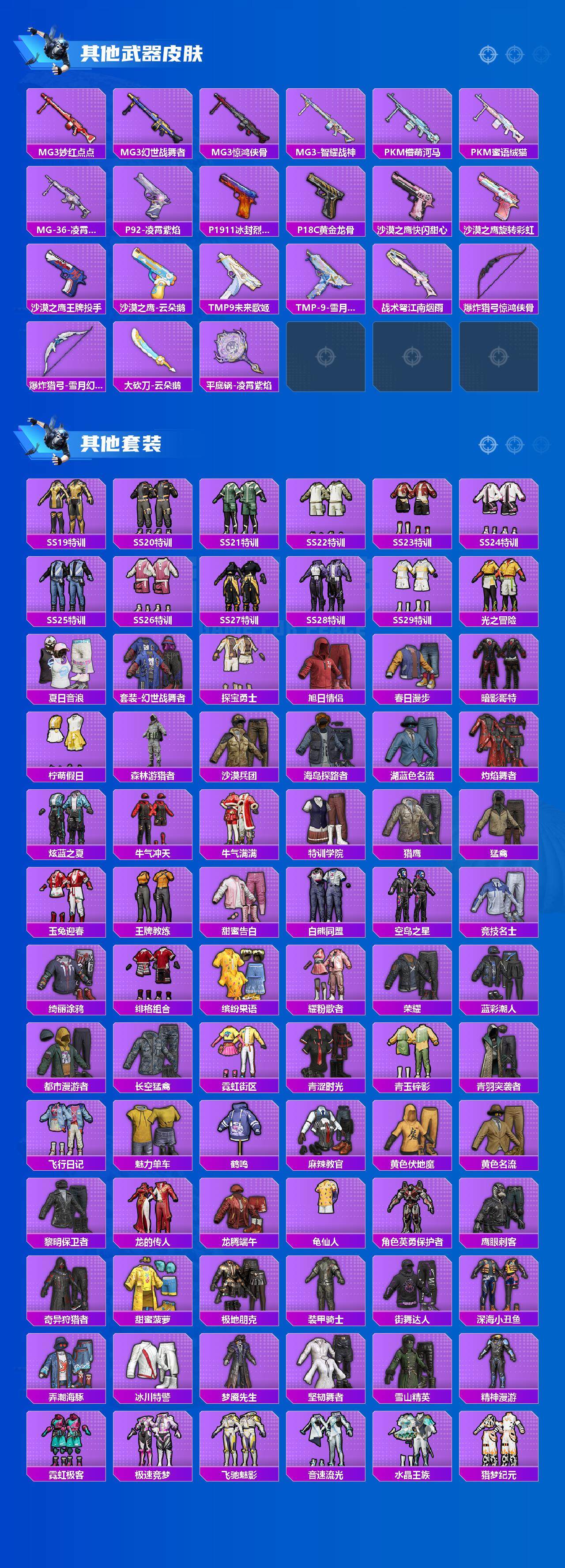 - [11506270]24粉装 8特效枪 3载具 13印记 可二次 可修改实名 身法装备:都市猎人,暗影哥特(红眼罩),沙漠守护者,萌熊伴侣背包(粉熊背包) 优质装备:怪诞乔克(小丑),雪国幻梦(冰雪女王),特斯拉Model 3(珍珠白),合金龙骨(绿),都市猎人,沙漠守护者(黑丝),萌熊伴侣背包(粉熊背包),M762甜蜜誓约,M416五爪金龙,SCAR-L梦幻火箭,奇异狩猎者,梦幻火箭(新101)(新火箭少女101粉色套装),幻影战神,宝贝奶油派,金属狂野,缤纷油彩(猪妹猪脸妹),向日葵(套装-向日葵先生),香水柠檬,天禅智恒,绚金战神,冰霜白皇,银刃赛罗,精灵迷巫,狩月元帅,星之彼岸,UMP45相思残雪(UMP45-相思残雪),AKM梦之光华,AWM焰龙焚天,洛天依,DP-28暗夜鎏金,七级AKM-梦之光华,七级UMP45-相思残雪,七级M762-甜蜜誓约,七级SCAR-L-梦幻火箭,七级M416-五爪金龙,冷漠罗丽,Kar98K-巳巳如意 热门装扮:林间仙鹿,彩虹鹿灵,山涧鹿灵,复仇流浪者,荒漠赏金,冰川红玫,阿尔茜,S1赛事上衣,沙漠守护者,兔兔白日梦,动感兔斯基,软萌银虎,奇迹天团,胖达圆圆,潮萌小黄鸭,仓鼠灰灰,迅捷狂鲨,鹰眼刺客,呆萌铁蟹,梦魇先生,爱崽白熊,深海小丑鱼,浪漫波比,都市猎人 载具:空客H135-蔚蓝之翼,双人摩托-梦幻火箭 五级特效枪:五级Kar98K-巳巳如意 四级特效枪:四级DP-28-暗夜鎏金,四级AWM-焰龙焚天 紫色装扮:岑岑玉浪,琉璃情波,田园牧歌,轻风白浪,和煦暖阳,SS22特训,SS23特训,幻彩翩翩,妙红点点,白兰地假日,苍岚星,娇憨猪猪,夏雨游龙,萌趣咩咩,SS21特训,SS31特训套装,SS2特训,SS3特训,SS4特训,SS5特训,人气偶像,军械专家,冰原使者,,冰川特警,决胜时刻,冷焰舞者,凛冬战士,刚毅裁决者,北国孤狼,千禧之恋,旭日情侣,云朵鹅,雪绒豹,SS33特训套装,顶瓜瓜,灵公主,SS20特训,赛罗奥特曼,青春冒险家,潮流游乐家,SS15特训,暗夜傀儡,蝎王蛇后,迪迦奥特曼,欧布奥特曼,时空追击者,暴风机械师,星辰守护者,SS16特训,爆裂葡萄,冰爽海盐,闪金天王,银白舞王,SS13特训,暗黑裁决,诡谋托雷基亚,浪漫樱花,星梦畅游,治愈之星,迅捷之星,科技之星,SS14特训,萌趣颜团子,特种颜团子,暖风夏荷,猎梦纪元,