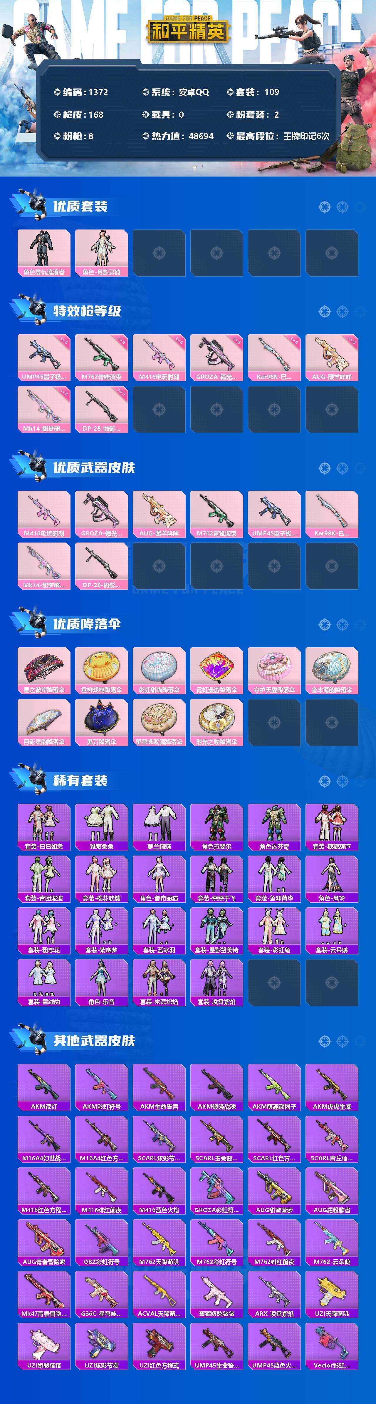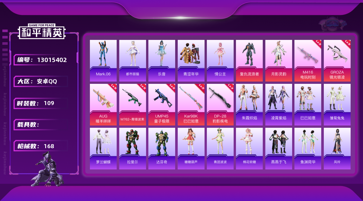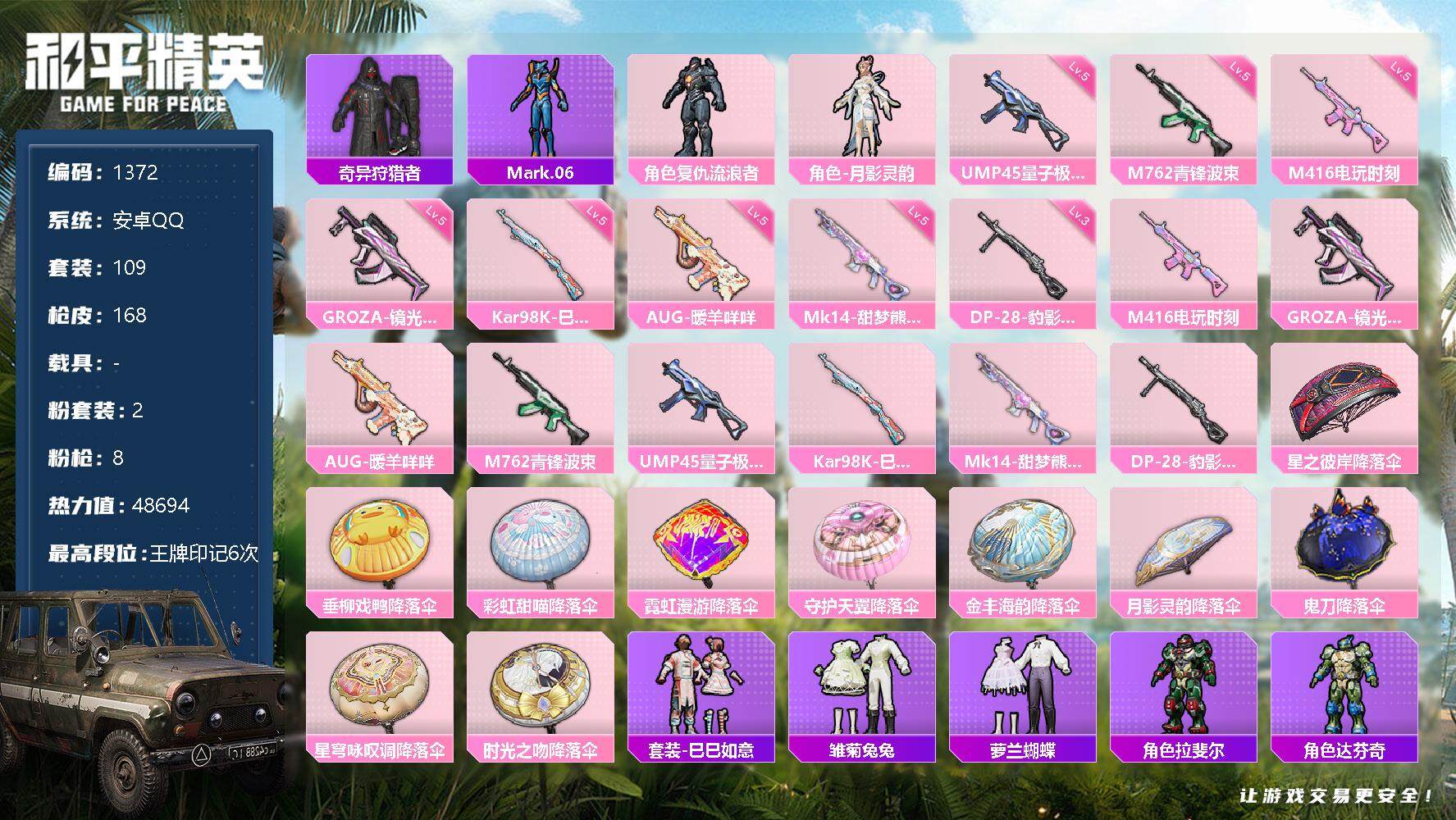 [13015402]安卓 手Q-2粉装-8特效枪-0载具-1粉色飞行器-48694热力值-6王牌印记-109套装-168枪皮 【热门品类】:套装-奇异狩猎者,角色-Mark.06 【粉色套装】:角色-复仇流浪者,角色-月影灵韵 【粉色枪皮等级】:M416-电玩时刻(五级),GROZA-镜光银凌(五级),AUG-暖羊咩咩(五级),M762-青锋波束(五级),UMP45-量子极限(五级),Kar98K-巳巳如意(五级),Mk14-甜梦熊击(五级),DP-28-豹影疾电(三级) 【粉色枪皮】:M416-电玩时刻,GROZA-镜光银凌,AUG-暖羊咩咩,M762-青锋波束,UMP45-量子极限,Kar98K-巳巳如意,Mk14-甜梦熊击,DP-28-豹影疾电 【粉色降落伞】:星之彼岸降落伞,垂柳戏鸭降落伞,彩虹甜喵降落伞,霓虹漫游降落伞,守护天翼降落伞,金丰海韵降落伞,月影灵韵降落伞,鬼刀降落伞,星穹咏叹调降落伞,时光之吻降落伞 【稀有套装】:套装-巳巳如意,套装-雏菊兔兔,套装-萝兰蝴蝶,角色-拉斐尔,角色-达芬奇,套装-糖糖葫芦,套装-青团波波,套装-棉花软糖,角色-都市丽猫,套装-燕燕于飞,套装-鱼渊荷华,角色-风玲,套装-粉恋花,套装-紫幽梦,套装-蓝冰羽,套装-星影赞美诗,套装-彩虹兔,套装-云朵鹅,套装-雪绒豹,角色-乐音,套装-朱霞炽焰,套装-凌霄紫焰 【稀有枪皮】:AKM-夜灯,AKM-彩虹符号,AKM-生命誓言,AKM-破晓战魂,AKM-萌趣颜团子,AKM-虎虎生威,M16A4-幻世战舞者,M16A4-红色方程式,SCAR-L-炫彩节奏,SCAR-L-玉兔迎春,SCAR-L-红色方程式,SCAR-L-青丘仙客,M416-红色方程式,M416-绯红前夜,M416-蓝色火焰,GROZA-彩虹符号,AUG-甜蜜菠萝,AUG-耀粉歌者,AUG-青春冒险家,QBZ-彩虹符号,M762-天降萌叽,M762-彩虹符号,M762-绯红前夜,M762-云朵鹅,Mk47-青春冒险家,G36C-星穹咏叹调,AC-VAL-天降萌叽,蜜獾-娇憨猪猪,ARX-凌霄紫焰,UZI-天降萌叽,UZI-娇憨猪猪,UZI-炫彩节奏,UZI-红色方程式,UMP45-生命誓言,UMP45-蓝色火焰,Vector-彩虹符号,Vector-生命誓言,汤姆逊-奇异狩猎者,汤姆逊-环太平洋,野牛-青春冒险家,JS9-凌霄紫