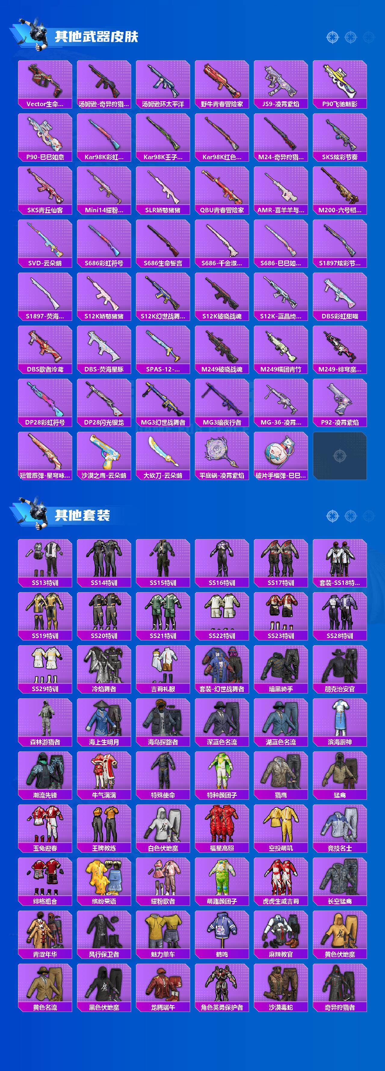 【稀有枪皮】:AKM-夜灯,AKM-彩虹符号,AKM-生命誓言,AKM-破晓战魂,AKM-萌趣颜团子,AKM-虎虎生威,M16A4-幻世战舞者,M16A4-红色方程式,SCAR-L-炫彩节奏,SCAR-L-玉兔迎春,SCAR-L-红色方程式,SCAR-L-青丘仙客,M416-红色方程式,M416-绯红前夜,M416-蓝色火焰,GROZA-彩虹符号,AUG-甜蜜菠萝,AUG-耀粉歌者,AUG-青春冒险家,QBZ-彩虹符号,M762-天降萌叽,M762-彩虹符号,M762-绯红前夜,M762-云朵鹅,Mk47-青春冒险家,G36C-星穹咏叹调,AC-VAL-天降萌叽,蜜獾-娇憨猪猪,ARX-凌霄紫焰,UZI-天降萌叽,UZI-娇憨猪猪,UZI-炫彩节奏,UZI-红色方程式,UMP45-生命誓言,UMP45-蓝色火焰,Vector-彩虹符号,Vector-生命誓言,汤姆逊-奇异狩猎者,汤姆逊-环太平洋,野牛-青春冒险家,JS9-凌霄紫