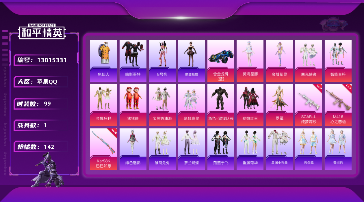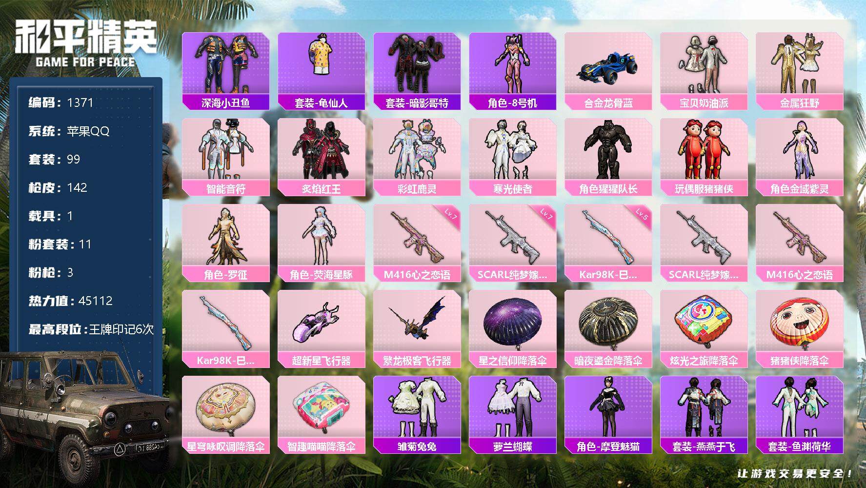 [13015331]苹果 手Q-11粉装-3特效枪-1载具-2粉色飞行器-45112热力值-6王牌印记-99套装-142枪皮