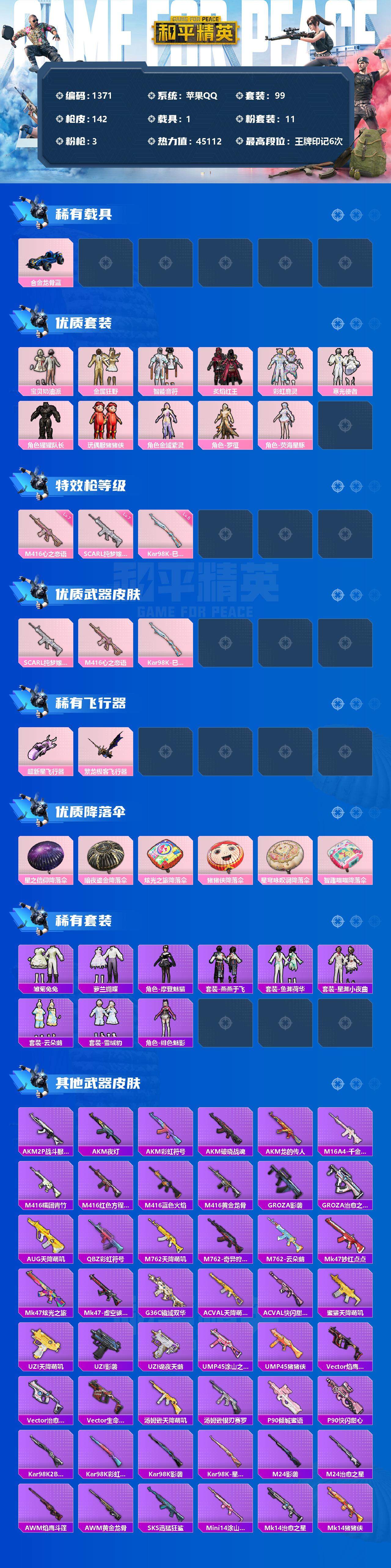 [13015331]苹果 手Q-11粉装-3特效枪-1载具-2粉色飞行器-45112热力值-6王牌印记-99套装-142枪皮 【热门品类】:套装-深海小丑鱼,套装-龟仙人,套装-暗影哥特,角色-8号机 【粉色载具】:合金龙骨(蓝) 【粉色套装】:粉装-宝贝奶油派,粉装-金属狂野,粉装-智能音符,粉装-炙焰红王,粉装-彩虹鹿灵,粉装-寒光使者,角色-猩猩队长,玩偶服-猪猪侠,角色-金域紫灵,角色-罗征,角色-荧海星豚 【粉色枪皮等级】:SCAR-L-纯梦嫁纱(七级),M416-心之恋语(七级),Kar98K-巳巳如意(五级) 【粉色枪皮】:SCAR-L-纯梦嫁纱,M416-心之恋语,Kar98K-巳巳如意 【粉色飞行器】:超新星飞行器,繁龙极客飞行器 【粉色降落伞】:星之信仰降落伞,暗夜鎏金降落伞,炫光之旅降落伞,猪猪侠降落伞,星穹咏叹调降落伞,智趣喵喵降落伞 【稀有套装】:套装-龟仙人,套装-雏菊兔兔,套装-萝兰蝴蝶,角色-摩登魅猫,套装-燕燕于飞,套装-鱼渊荷华,套装-星渊小夜曲,套装-云朵鹅,套装-雪绒豹,角色-绯色魅影 【稀有枪皮】:AKM-2P战斗服款,AKM-夜灯,AKM-彩虹符号,AKM-破晓战魂,AKM-龙的传人,M16A4-千金淑猫,M416-糯团青竹,M416-红色方程式,M416-蓝色火焰,M416-黄金龙骨,GROZA-影袭,GROZA-治愈之星,AUG-天降萌叽,QBZ-彩虹符号,M762-天降萌叽,M762-奇异狩猎者,M762-云朵鹅,Mk47-妙红点点,Mk47-炫光之旅,Mk47-虚空骇客,G36C-镜域双华,AC-VAL-天降萌叽,AC-VAL-快闪甜心,蜜獾-天降萌叽,UZI-天降萌叽,UZI-影袭,UZI-诡夜天鹅,UMP45-涂山之恋,UMP45-猪猪侠,Vector-焰鹰斗篷,Vector-治愈之星,Vector-生命誓言,汤姆逊-天降萌叽,汤姆逊-银刃赛罗,P90-倾城蜜语,P90-快闪甜心,Kar98K-2B战斗服款,Kar98K-彩虹符号,Kar98K-影袭,Kar98K-星穹咏叹调,M24-影袭,M24-治愈之星,AWM-焰鹰斗篷,AWM-黄金龙骨,SKS-迅猛狂鲨,Mini14-涂山之恋,Mk14-治愈之星,Mk14-猪猪侠,AMR-妙红点点,M417-惊鸿侠骨,M417-猪猪侠,MK20-H-快闪甜心,M200-惊鸿侠骨,SVD-