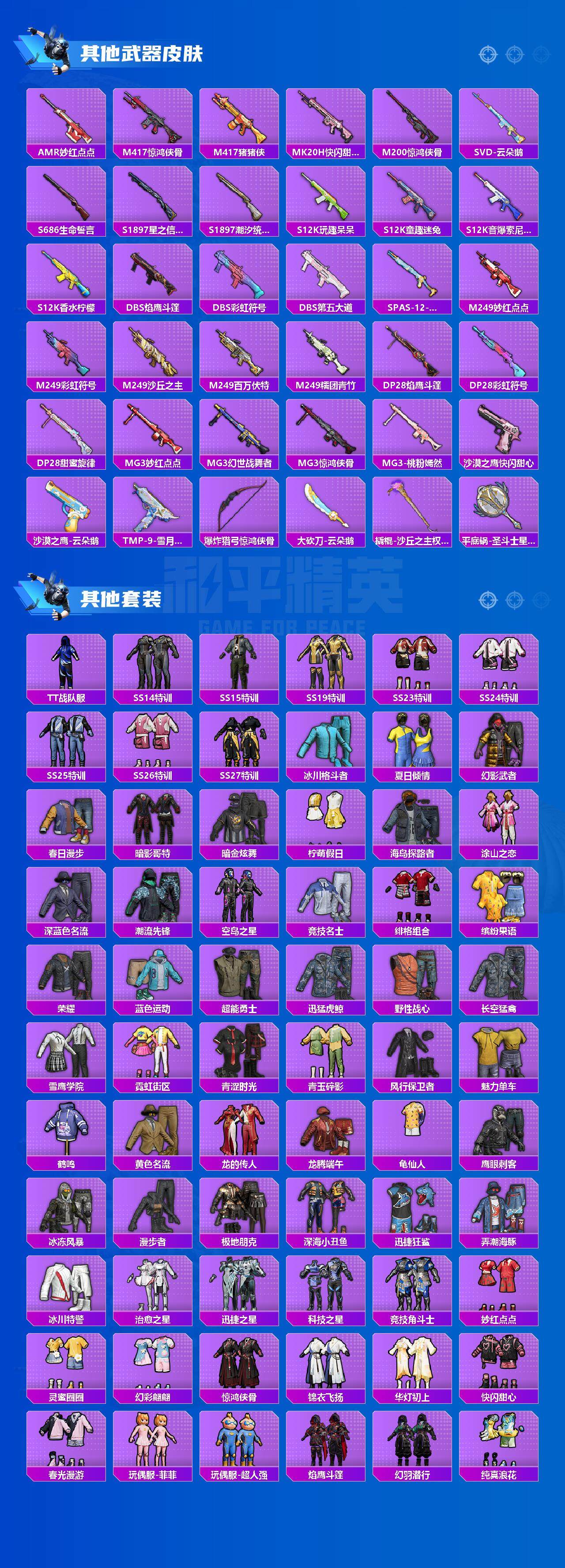 【稀有枪皮】:AKM-2P战斗服款,AKM-夜灯,AKM-彩虹符号,AKM-破晓战魂,AKM-龙的传人,M16A4-千金淑猫,M416-糯团青竹,M416-红色方程式,M416-蓝色火焰,M416-黄金龙骨,GROZA-影袭,GROZA-治愈之星,AUG-天降萌叽,QBZ-彩虹符号,M762-天降萌叽,M762-奇异狩猎者,M762-云朵鹅,Mk47-妙红点点,Mk47-炫光之旅,Mk47-虚空骇客,G36C-镜域双华,AC-VAL-天降萌叽,AC-VAL-快闪甜心,蜜獾-天降萌叽,UZI-天降萌叽,UZI-影袭,UZI-诡夜天鹅,UMP45-涂山之恋,UMP45-猪猪侠,Vector-焰鹰斗篷,Vector-治愈之星,Vector-生命誓言,汤姆逊-天降萌叽,汤姆逊-银刃赛罗,P90-倾城蜜语,P90-快闪甜心,Kar98K-2B战斗服款,Kar98K-彩虹符号,Kar98K-影袭,Kar98K-星穹咏叹调,M24-影袭,M24-治愈之星,AWM-焰鹰斗篷,AWM-黄金龙骨,SKS-迅猛狂鲨,Mini14-涂山之恋,Mk14-治愈之星,Mk14-猪猪侠,AMR-妙红点点,M417-惊鸿侠骨,M417-猪猪侠,MK20-H-快闪甜心,M200-惊鸿侠骨,SVD-