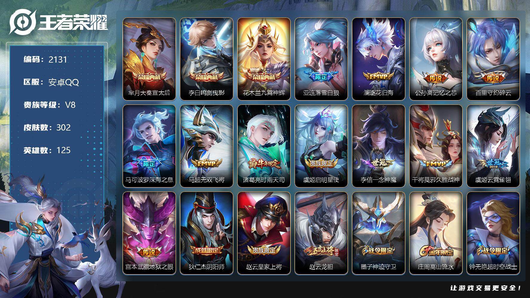 [13015983]安卓Q-V8-最强王者段位-125英雄-302皮肤-3典藏-0珍品无双-0无双-0珍品传说-12传说-88史诗