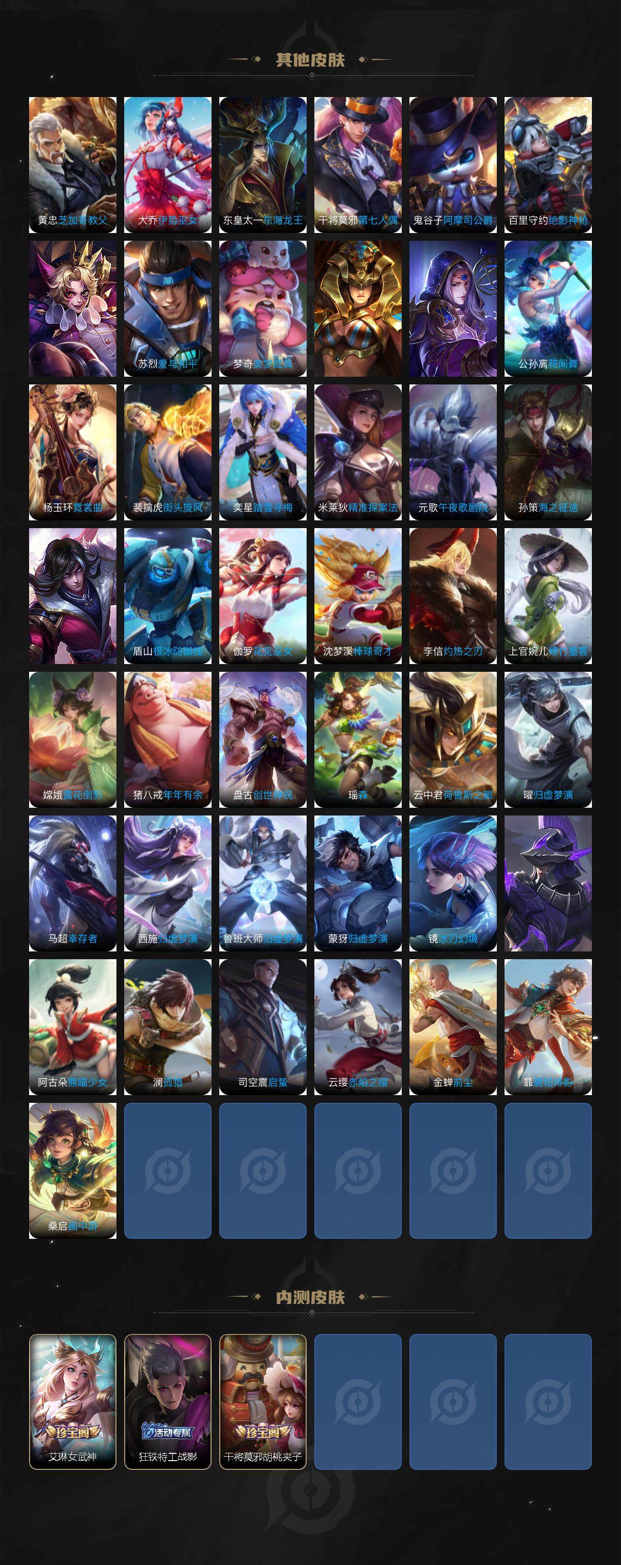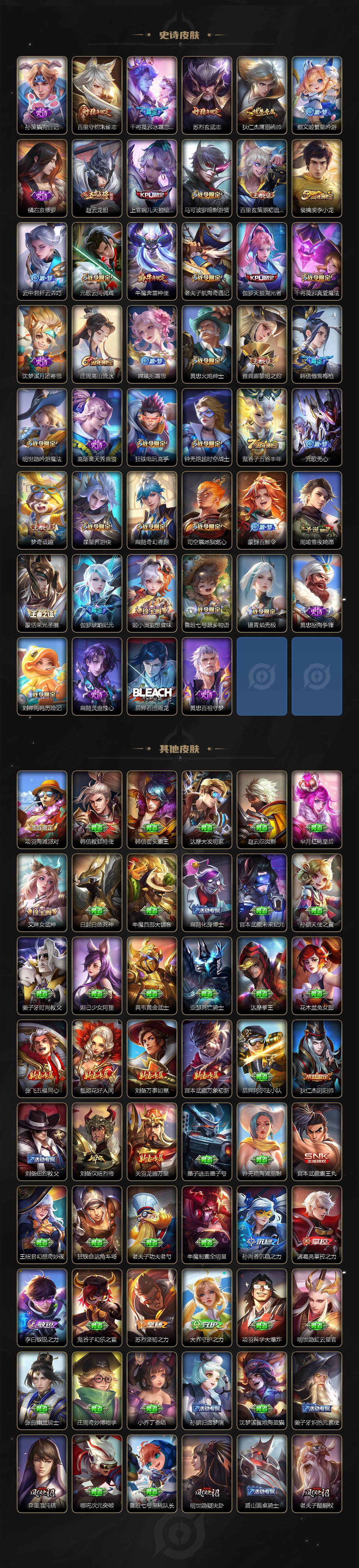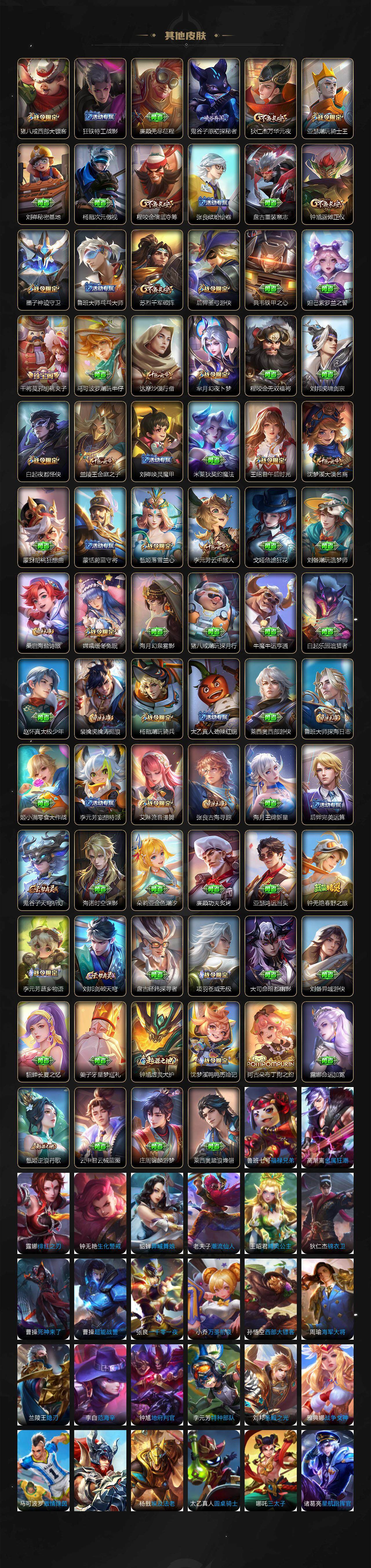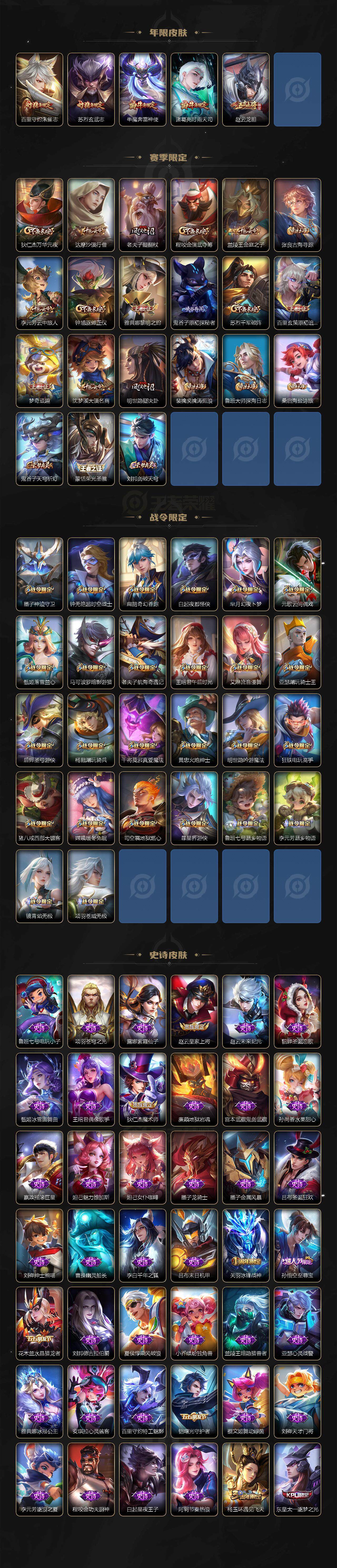 【限定皮肤】:狄仁杰阴阳师,赵云皇家上将,赵云龙胆,墨子神迹守卫,庄周高山流水,钟无艳超时空战士,扁鹊奇幻香踪,白起夜都怪侠,芈月幻夜卜梦,元歌云间偶戏,元歌无心,甄姬落雪兰心,马可波罗暗影游猎,马可波罗深海之息,狄仁杰魔术师,狄仁杰万华元夜,达摩沙漠行僧,项羽海滩派对,老夫子醍醐杖,老夫子航海奇遇记,关羽冰锋战神,程咬金演武夺筹,韩信傲雪梅枪,王昭君午后时光,兰陵王金庭之子,亚瑟潮玩骑士王,孙悟空至尊宝,牛魔奔雷神使,后羿圣弓游侠,李元芳云中旅人,虞姬启明星使,钟馗驱傩正仪,杨玉环遇见飞天,杨戬潮玩骑兵,干将莫邪冰霜恋舞曲,干将莫邪胡桃夹子,干将莫邪真爱魔法,雅典娜黎明之约,蔡文姬繁星吟游,东皇太一逐梦之光,鬼谷子原初探秘者,鬼谷子五谷丰年,诸葛亮时雨天司,黄忠火炮绅士,苏烈玄武志,苏烈千军破阵,百里玄策原初追逐者,百里守约朱雀志,弈星混沌棋,梦奇顽趣,沈梦溪大漠名商,明世隐疑决卦,明世隐吟游魔法,裴擒虎李小龙,裴擒虎擒涛扼浪,狂铁电玩高手,云中君纤云弄巧,伽罗天狼溯光者,猪八戒西部大镖客,上官婉儿天狼绘梦者,嫦娥拒霜思,嫦娥暖冬兔眠,鲁班大师探海日志,桑启海盐诗旅,暃星界游侠,艾琳女武神,艾琳流音漫舞,司空震地狱燃心,张良古海寻踪,蒙犽百解令,蒙恬荣光圣徽,鬼谷子天穹祈灯,伽罗琥珀纪元,姬小满妄想食味,亚连落雪白狼,鲁班七号蔬乡物语,李元芳蔬乡物语,刘邦剑破天穹,镜青焰无极,项羽苍威无极,刘备异域游侠