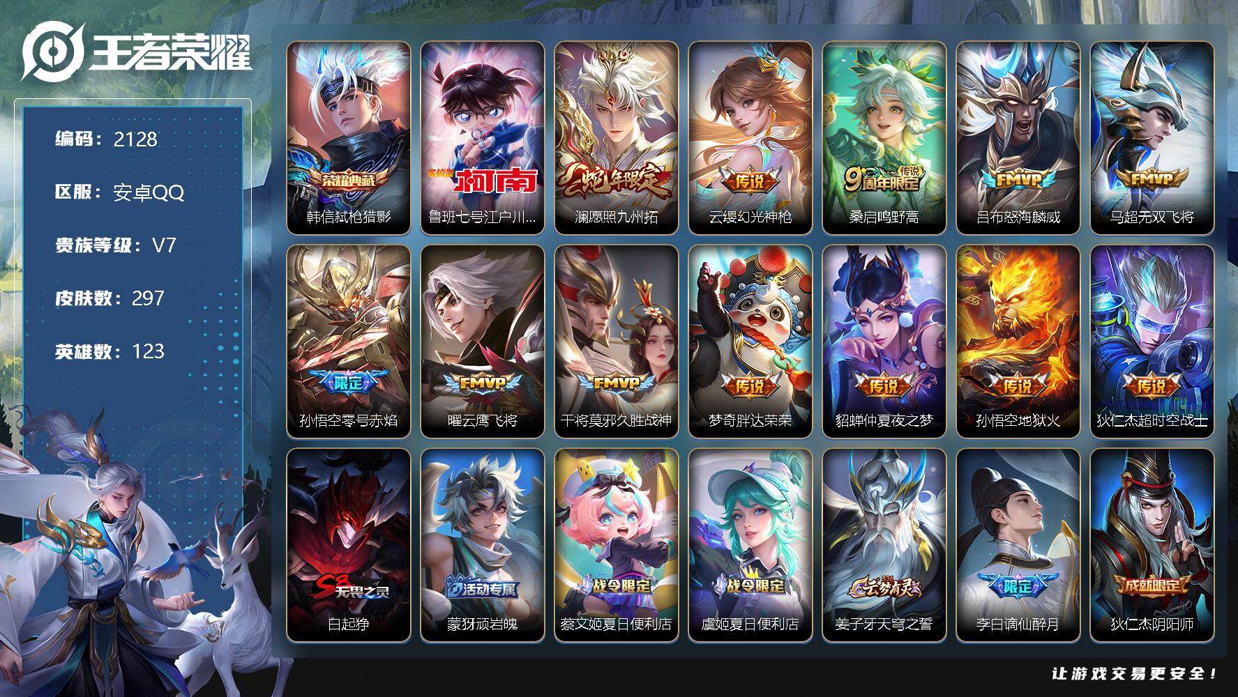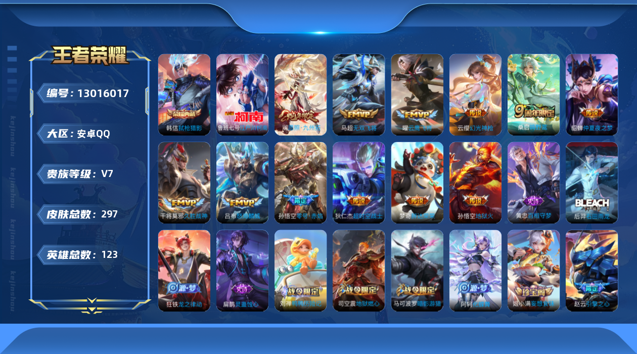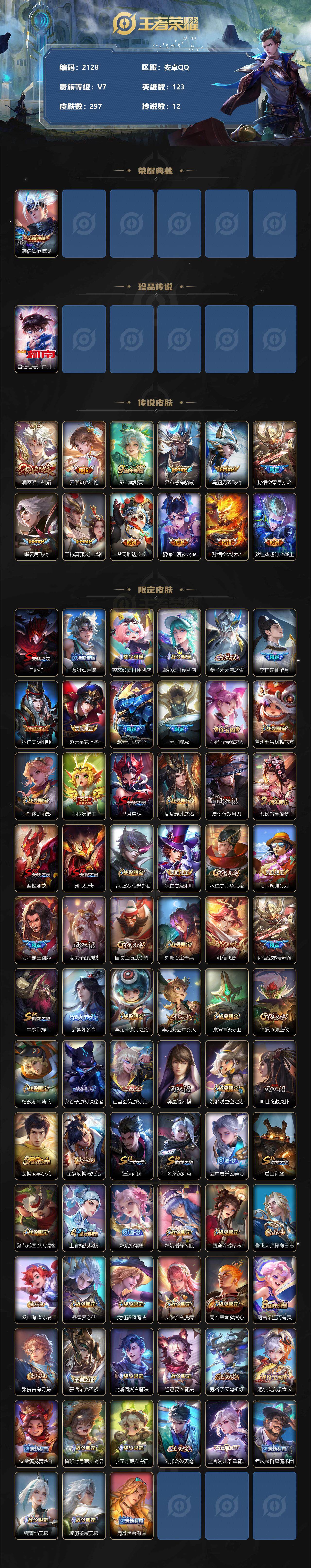 [13016017]安卓Q-V7-永恒钻石I段位-123英雄-297皮肤-1典藏-0珍品无双-0无双-1珍品传说-12传说-83史诗
