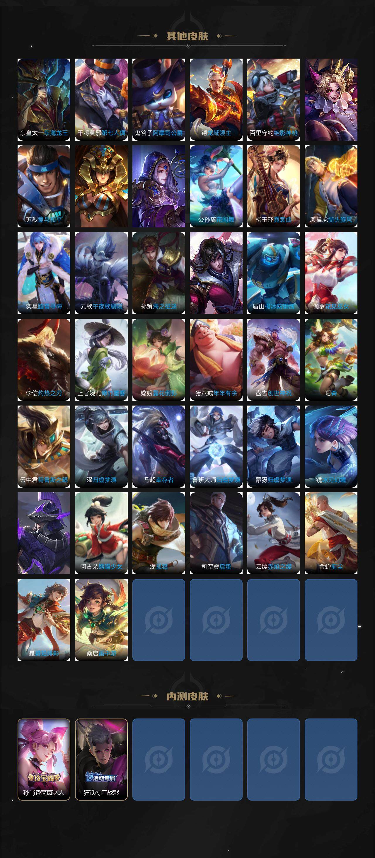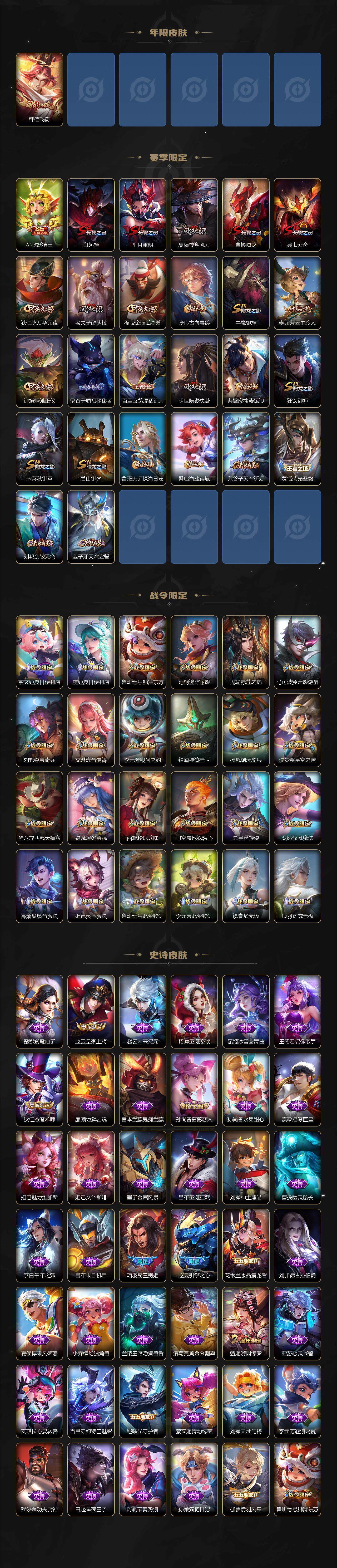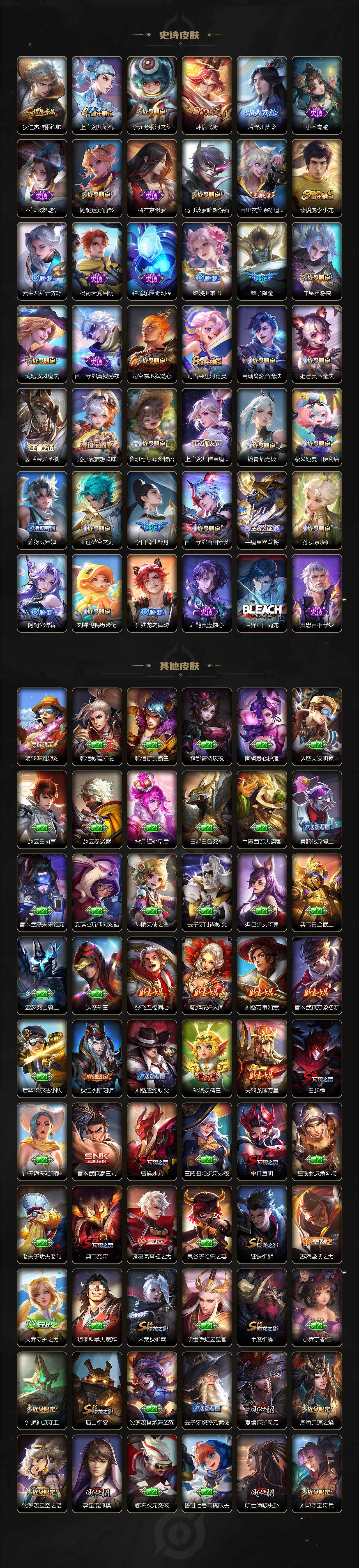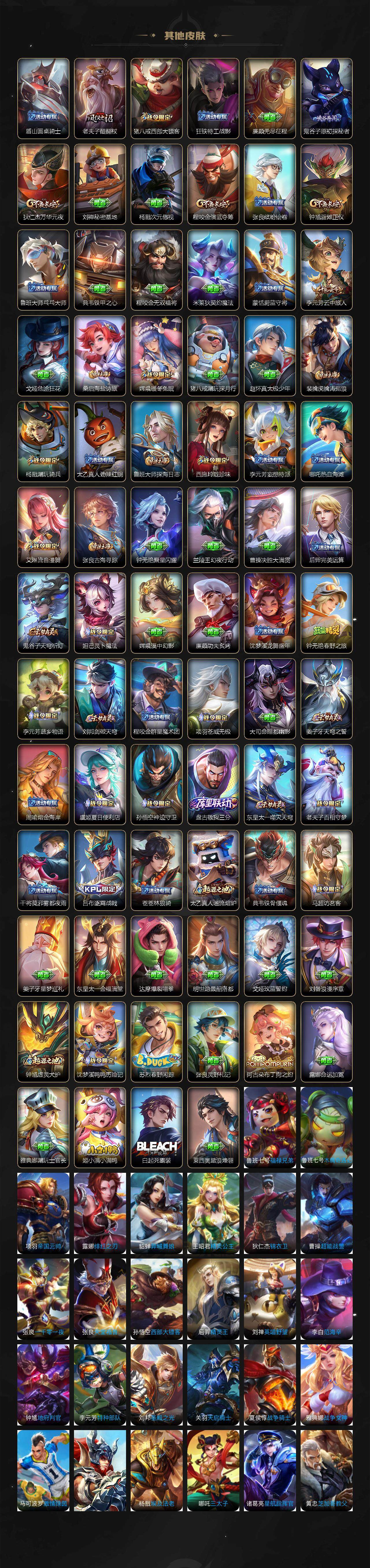 【限定皮肤】:白起狰,蒙犽顽岩魄,蔡文姬夏日便利店,虞姬夏日便利店,姜子牙天穹之誓,李白谪仙醉月,狄仁杰阴阳师,赵云皇家上将,赵云引擎之心,墨子降魔,孙尚香蔷薇恋人,鲁班七号狮舞东方,阿轲迷踪丽影,孙膑妖精王,芈月重明,周瑜赤莲之焰,夏侯惇朔风刀,甄姬游园惊梦,曹操烛龙,典韦穷奇,马可波罗暗影游猎,狄仁杰魔术师,狄仁杰万华元夜,项羽海滩派对,项羽霸王别姬,老夫子醍醐杖,程咬金演武夺筹,刘邦夺宝奇兵,韩信飞衡,孙悟空零号赤焰,牛魔御旌,后羿如梦令,李元芳银河之约,李元芳云中旅人,钟馗神迹守卫,钟馗驱傩正仪,杨戬潮玩骑兵,鬼谷子原初探秘者,百里玄策原初追逐者,弈星混沌棋,沈梦溪星空之诺,明世隐疑决卦,裴擒虎李小龙,裴擒虎擒涛扼浪,狂铁御狮,米莱狄御霄,云中君纤云弄巧,盾山御銮,猪八戒西部大镖客,上官婉儿梁祝,嫦娥拒霜思,嫦娥暖冬兔眠,西施玲珑珍味,鲁班大师探海日志,桑启海盐诗旅,暃星界游侠,戈娅驭风魔法,艾琳流音漫舞,司空震地狱燃心,阿古朵江河有灵,张良古海寻踪,蒙恬荣光圣徽,高渐离燃音魔法,妲己灵卜魔法,鬼谷子天穹祈灯,姬小满妄想食味,沈梦溪龙舞盛年,鲁班七号蔬乡物语,李元芳蔬乡物语,刘邦剑破天穹,上官婉儿群星魔术团,程咬金群星魔术团,镜青焰无极,项羽苍威无极,周瑜熔金海岸